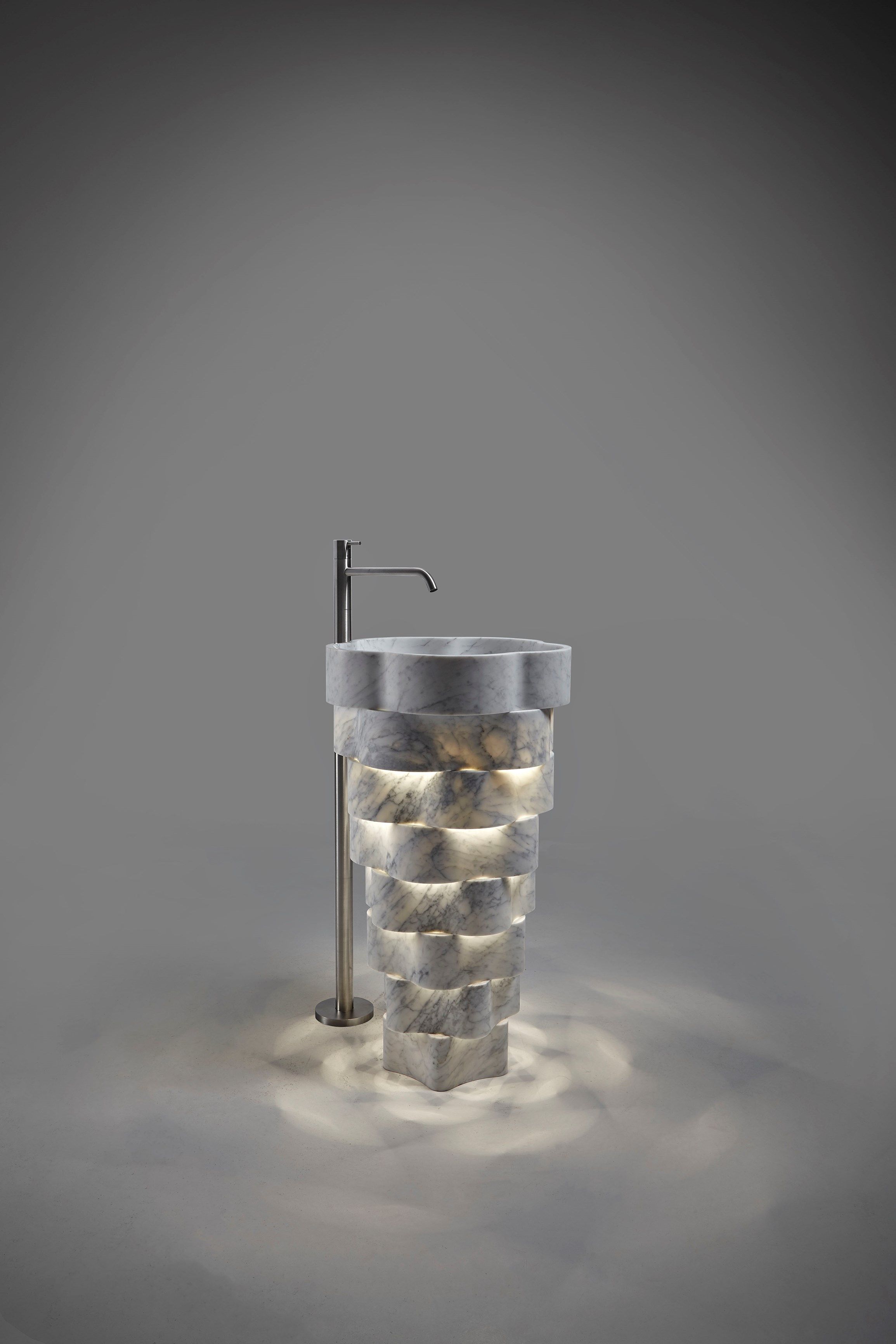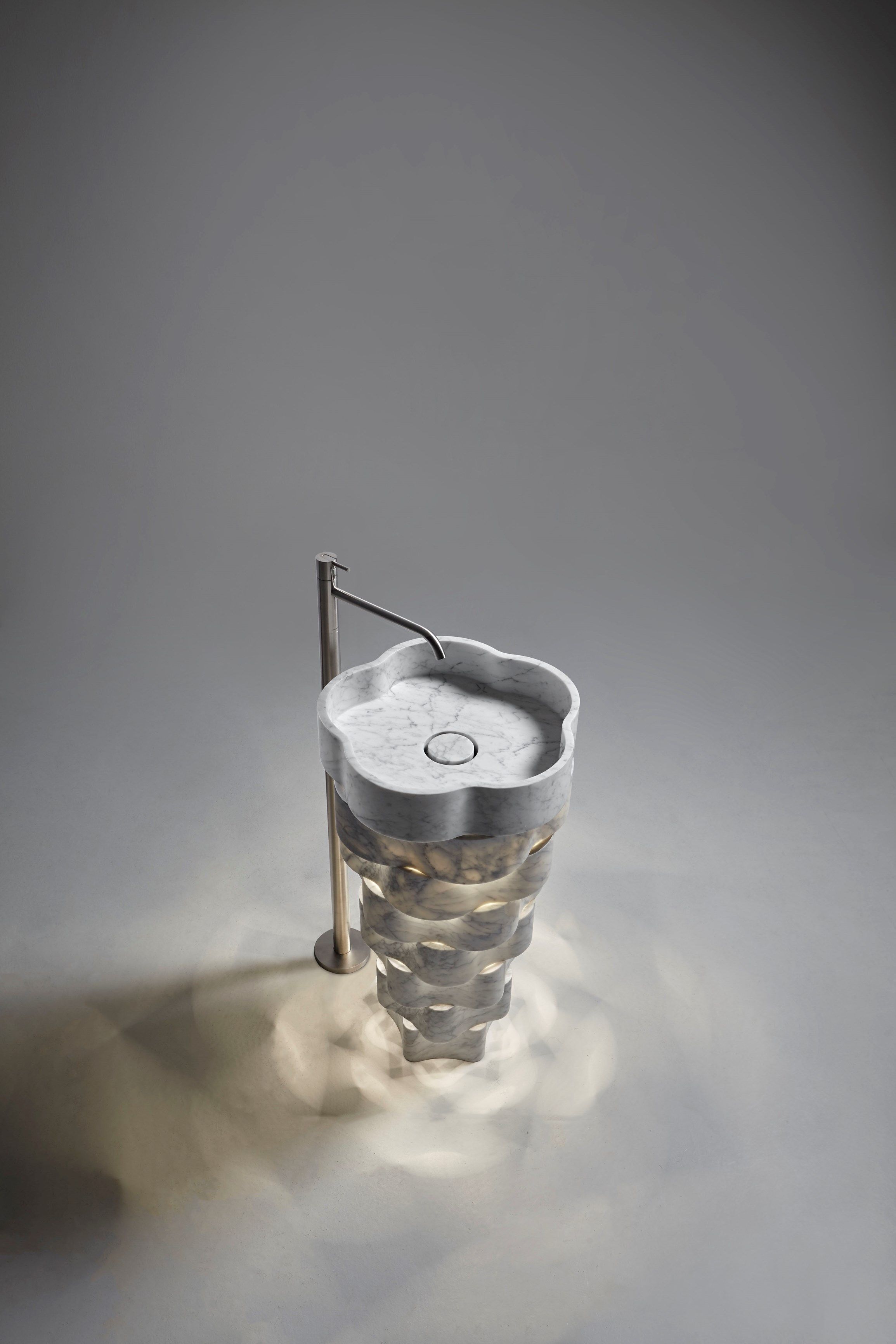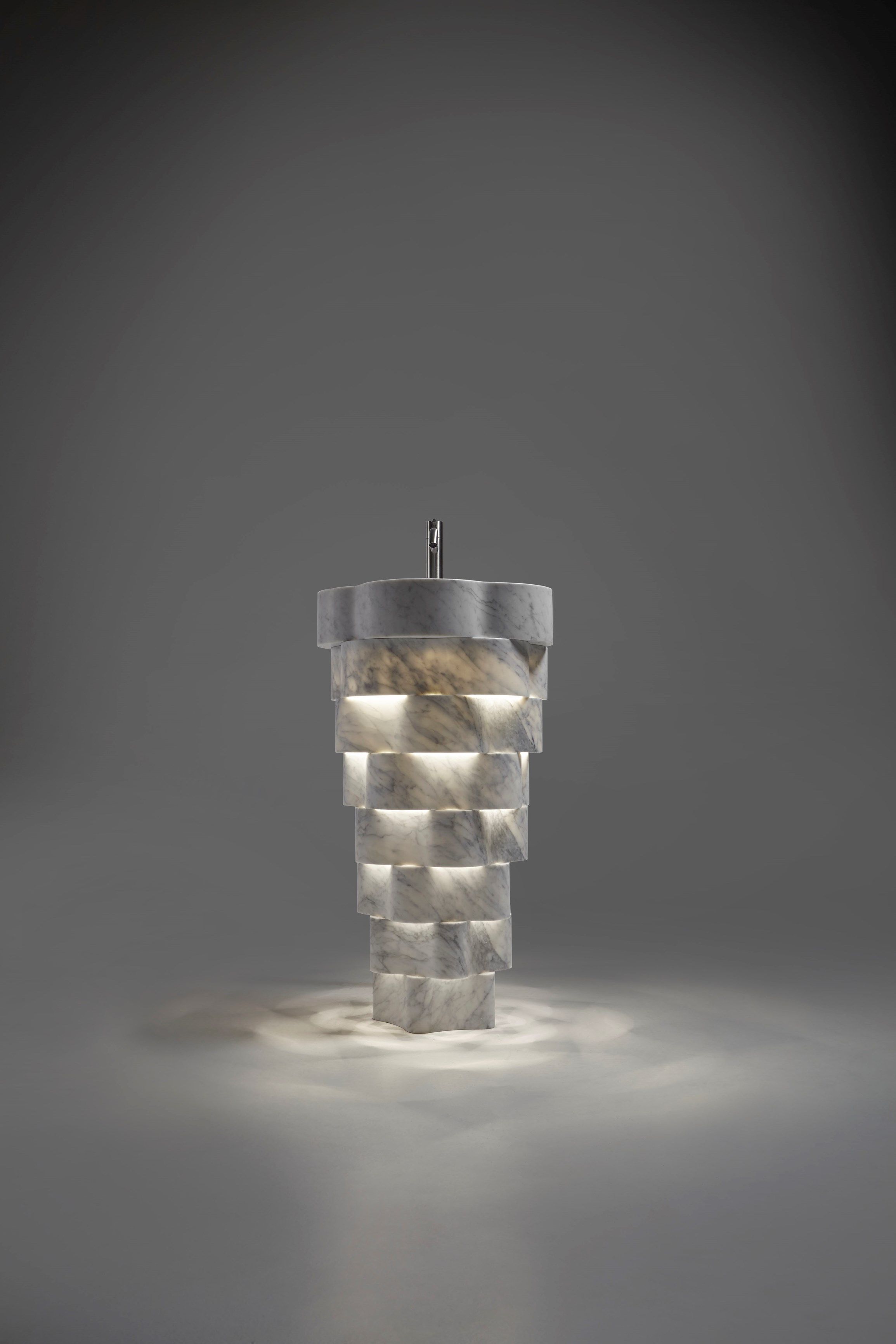 Intreccio — это мраморная напольная раковина, в которой сочетаются природная форма и точная геометрия. Её скульптурный силуэт создан из концентрических колец, сдвинутых по вертикали, что формирует выразительную игру света, тени и глубины.
