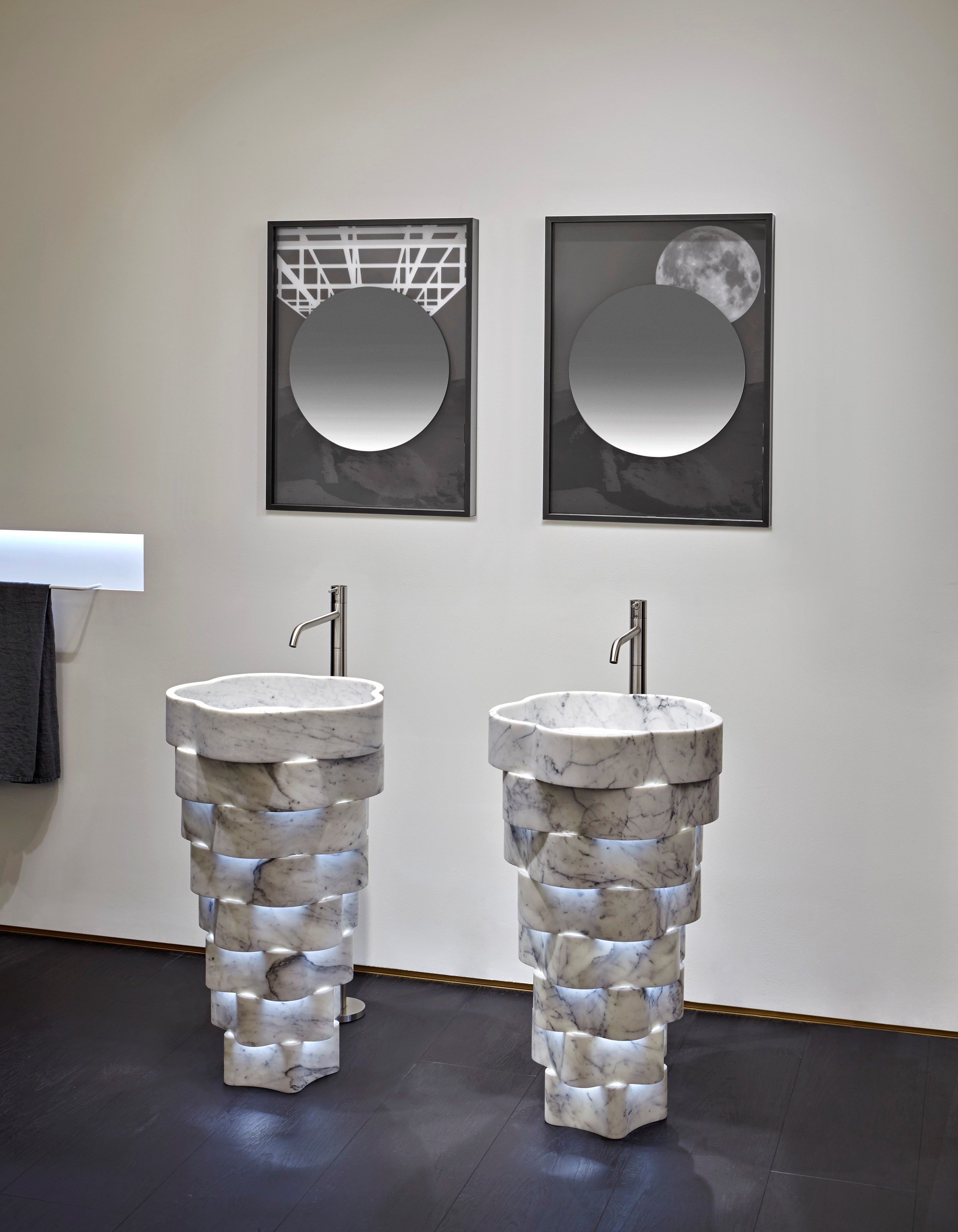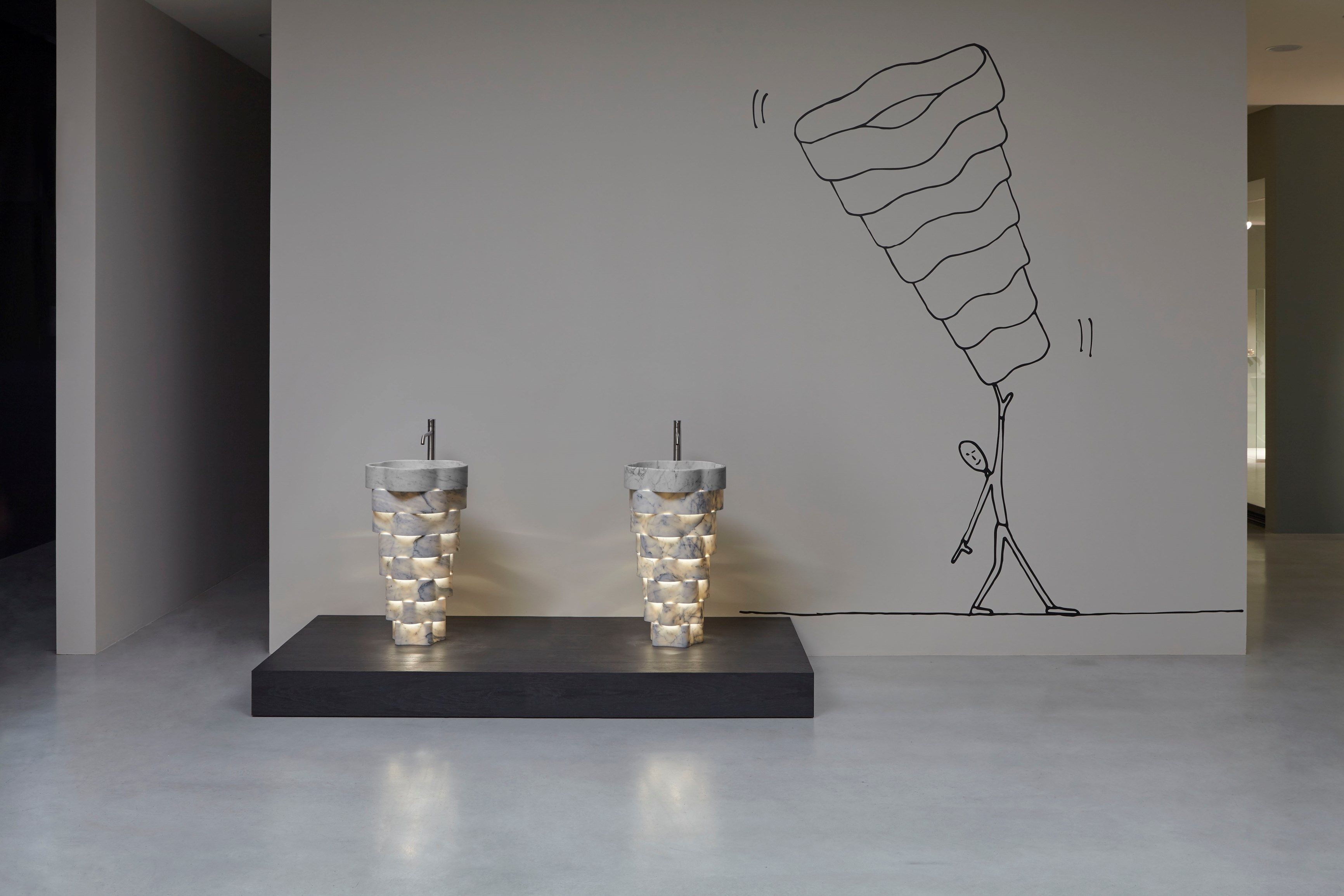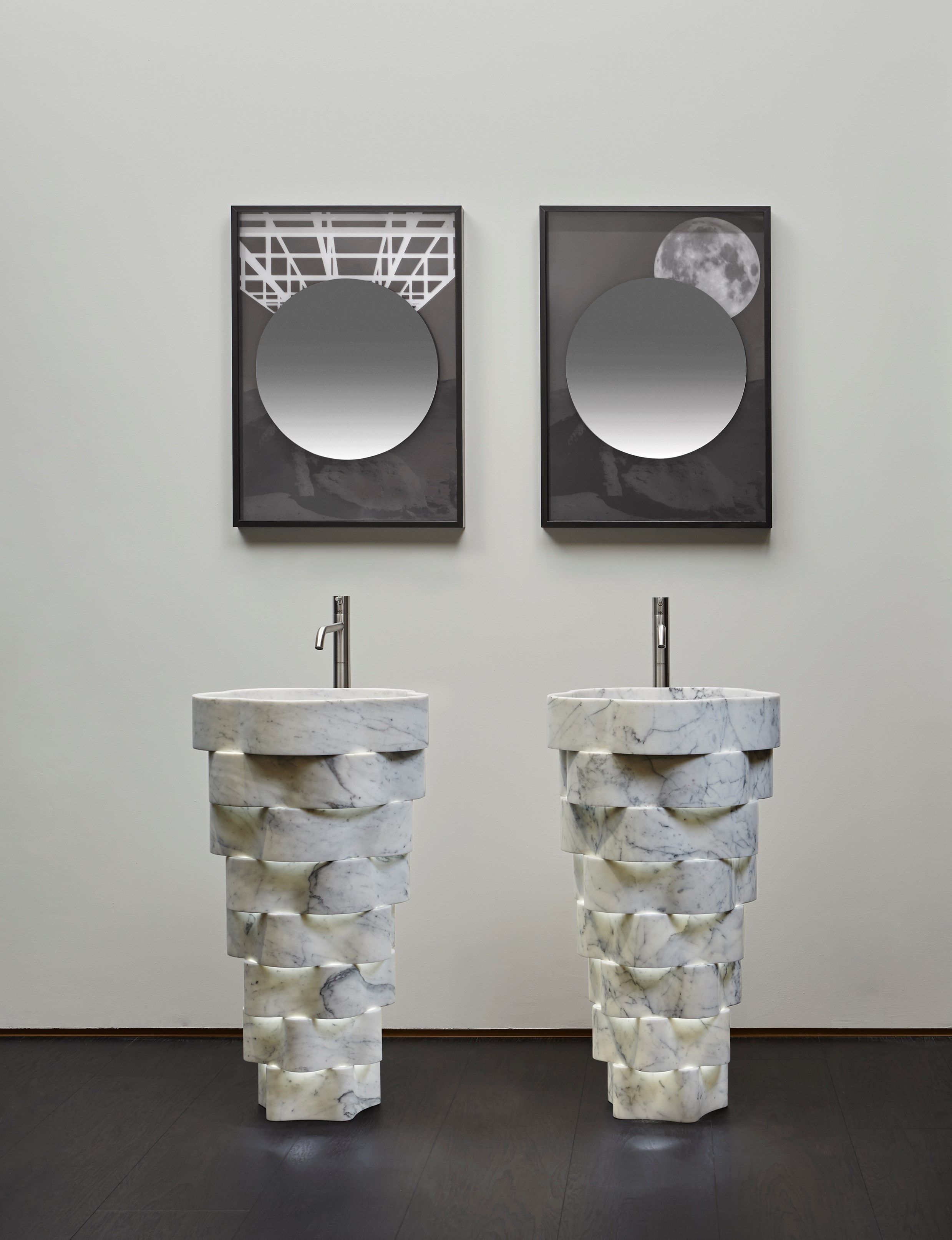 Каждое изделие вытачивается из цельного блока мрамора с минимальными отходами — из одного блока создаются сразу четыре раковины. Технология обработки с ЧПУ позволяет добиться тонких, изогнутых форм, визуально противопоставляющих лёгкость и монументальность.