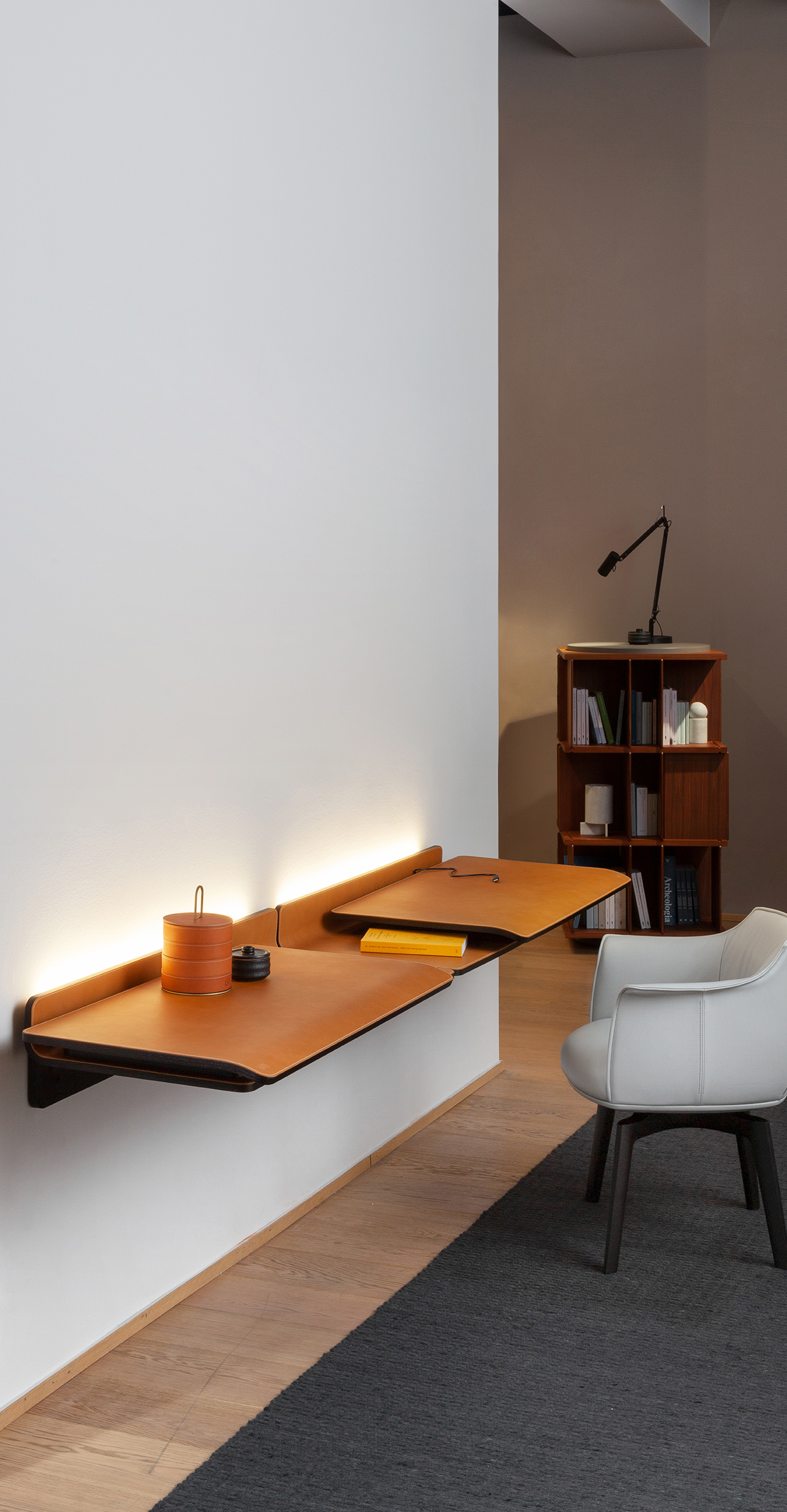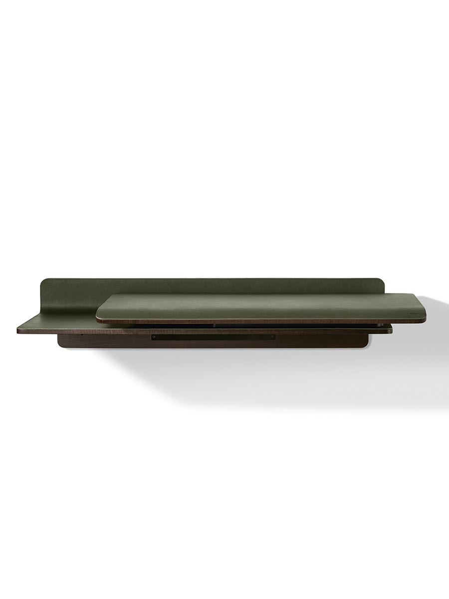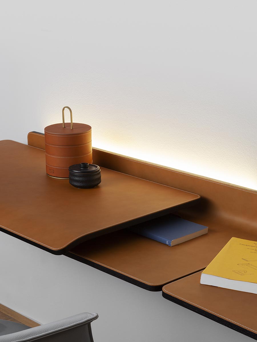 Компания Poltrona Frau производит письменный стол Iren в настенном исполнении с креплением на кронштейнах. Возможность перемещения вправо или влево выбирается заказчиком при заказе. Полезная площадь стола Iren составляет от 119 до 149 см при полностью открытой раздвижной столешнице. Видимые деревянные части выполнены из ясеня и доступны в различных вариантах отделки. Столешница может быть обтянута кожей или шорно-седельной кожей с однотонной или контрастной строчкой. Логотип Poltrona Frau тиснёный в правом нижнем углу раздвижной столешницы.