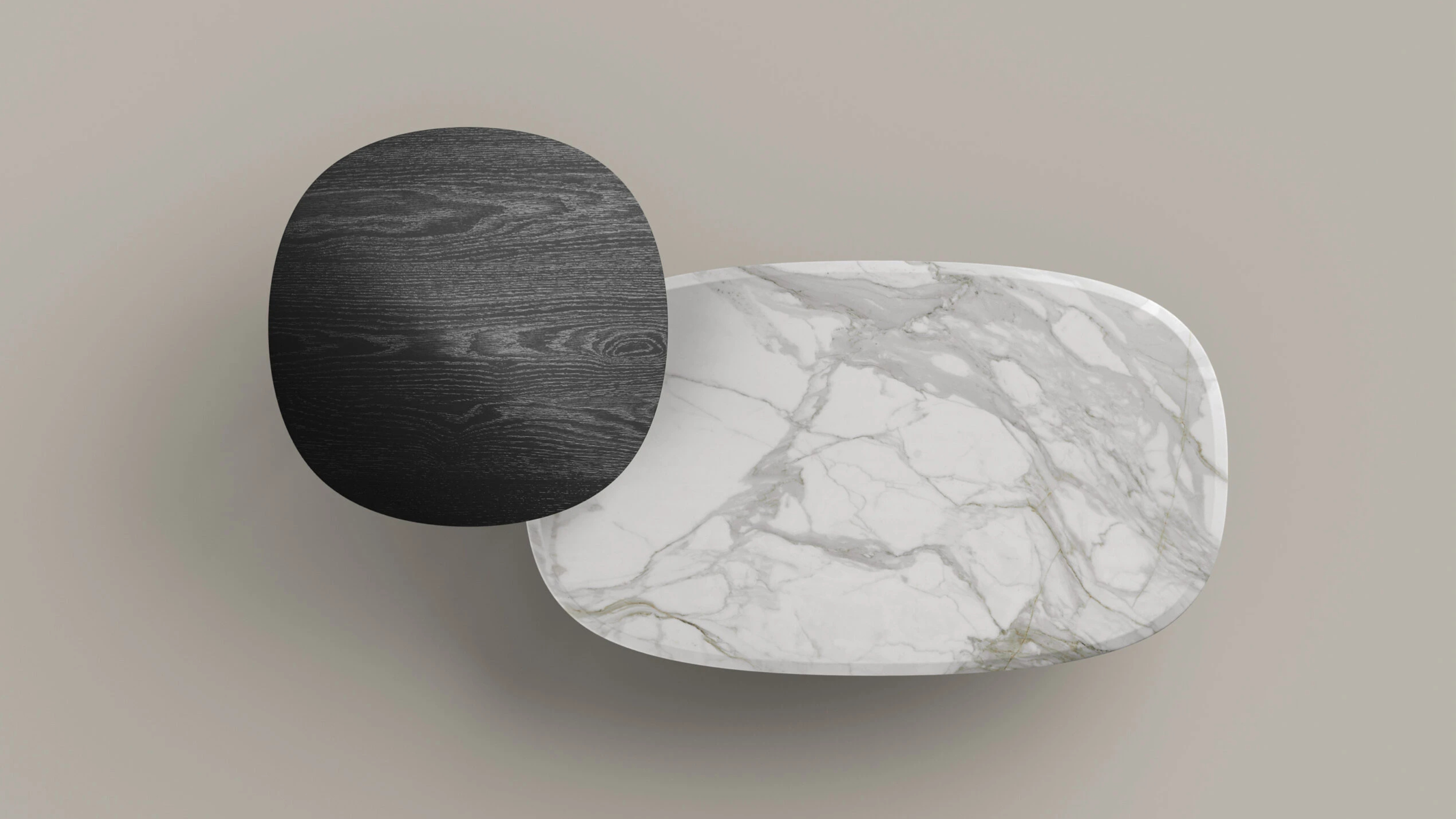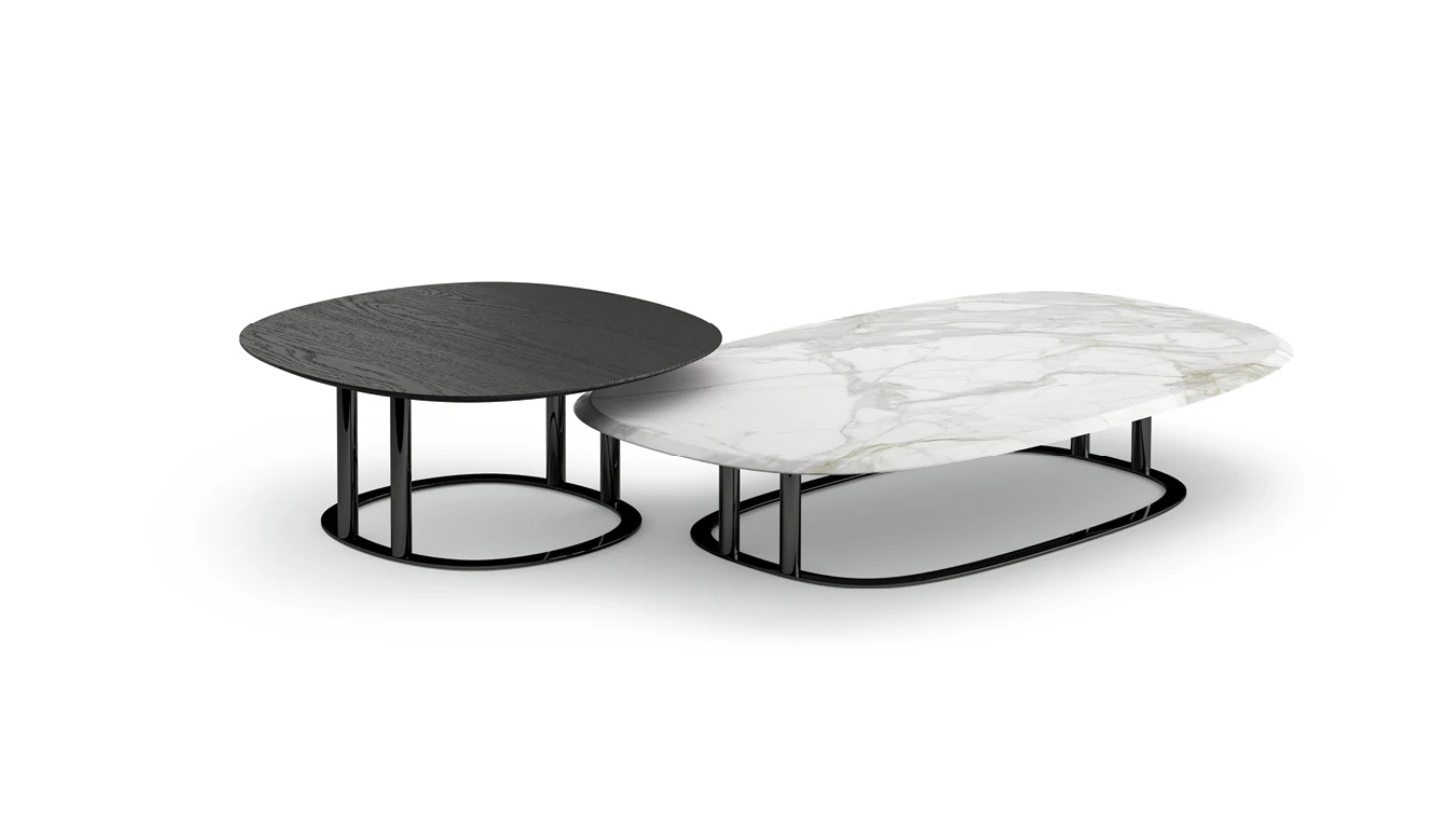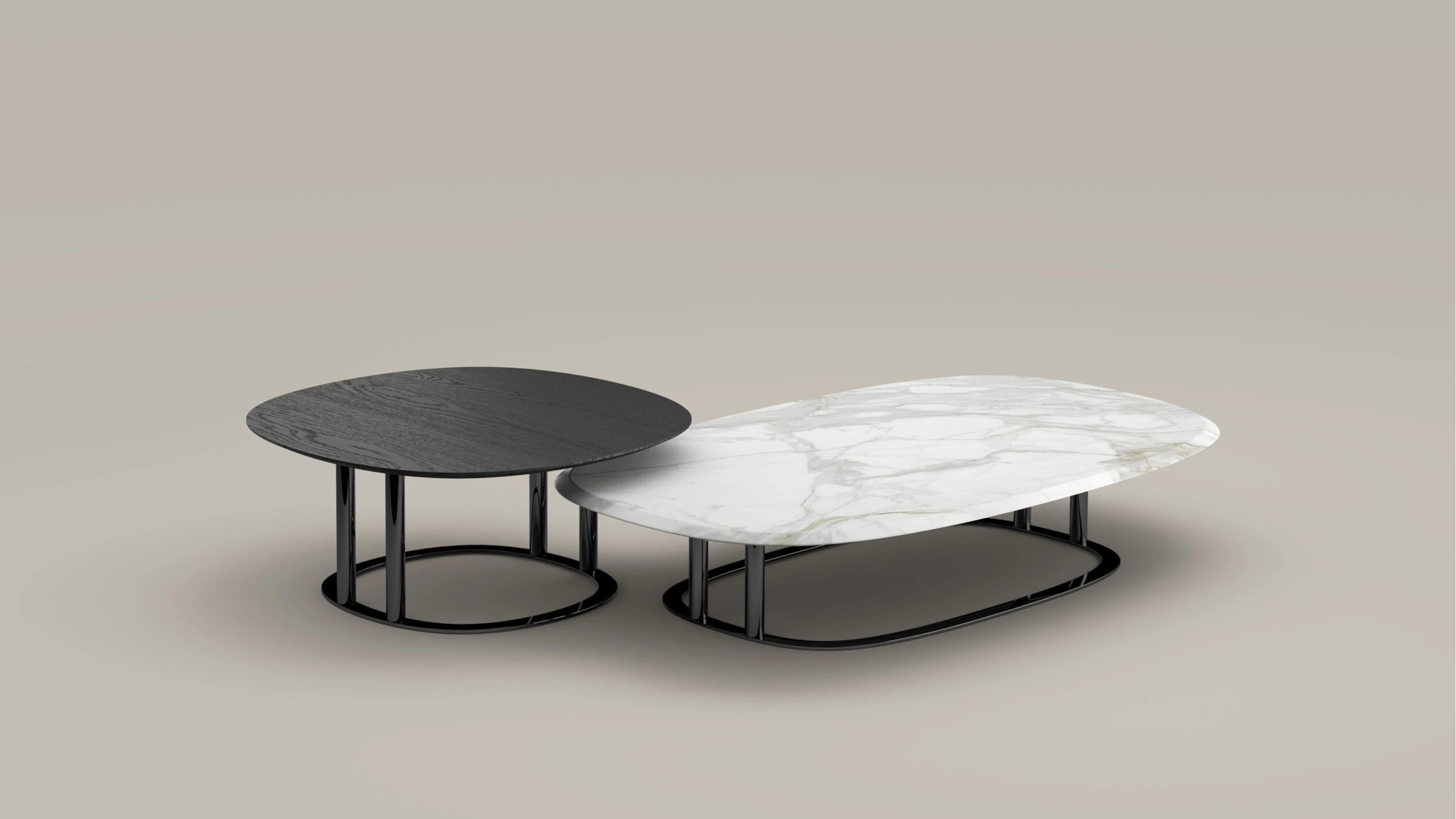 Мягкие формы с закруглёнными углами, асимметричные основания и разная высота придают столикам баланс между устойчивостью и легкостью. Они подходят как для зоны отдыха, так и для лаунжа, легко перемещаются и могут складываться друг на друга.