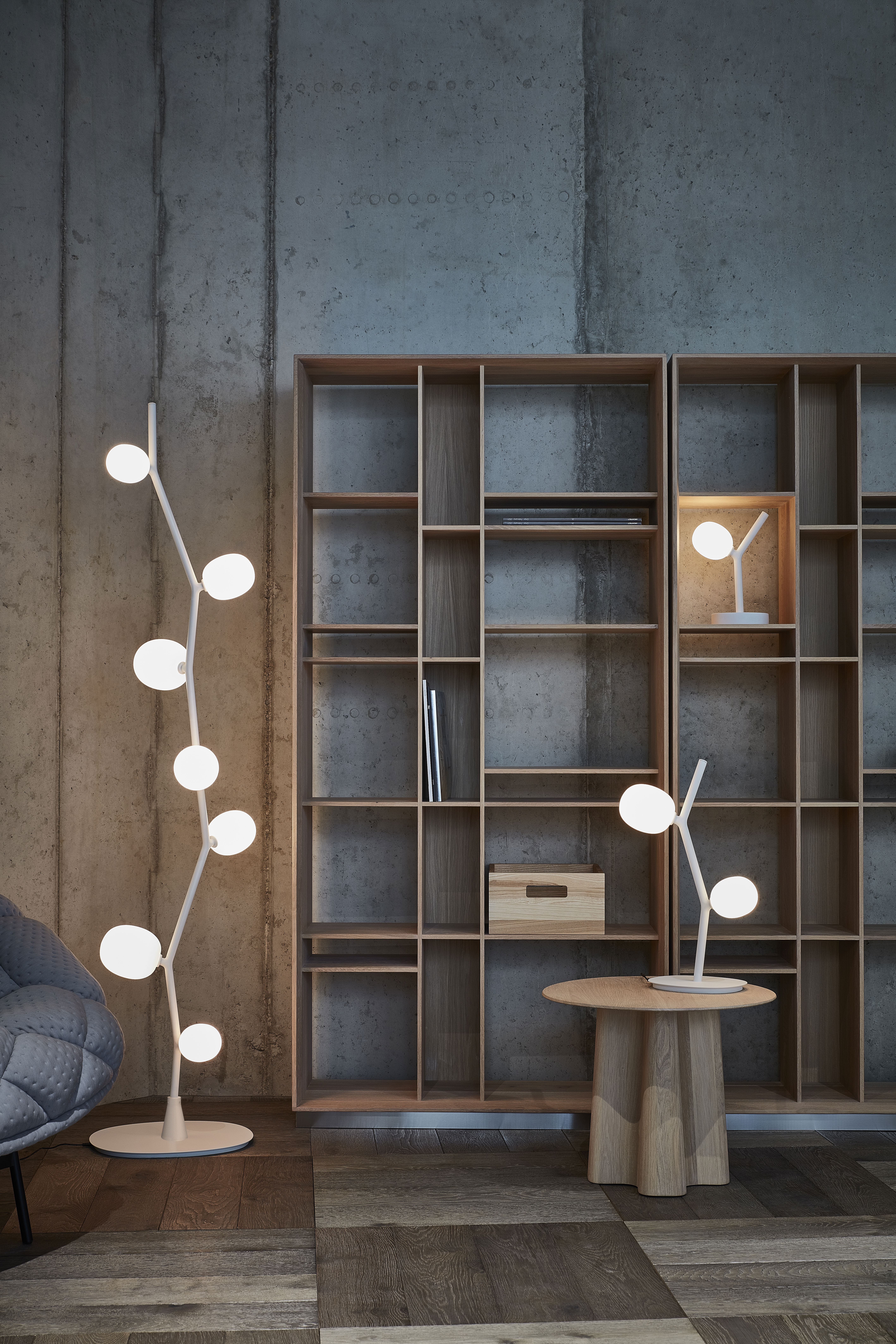 Концепция основана на модульном принципе, позволяющем выстраивать как вертикальные, так и горизонтальные композиции декоративного освещения. Новая версия с аккумулятором представляет собой более компактную интерпретацию настольного светильника Ivy, что делает её мобильной и удобной для использования в различных зонах.