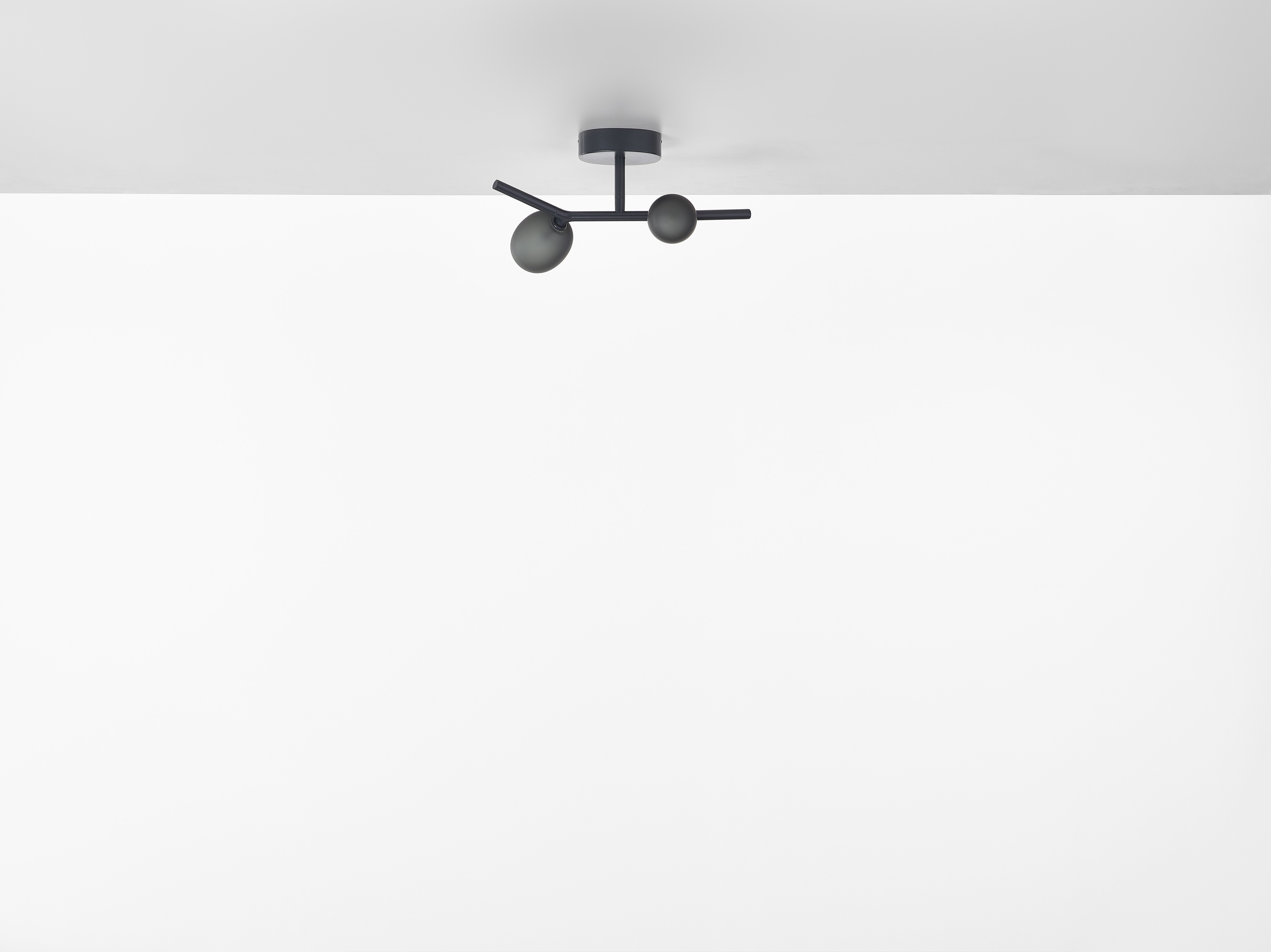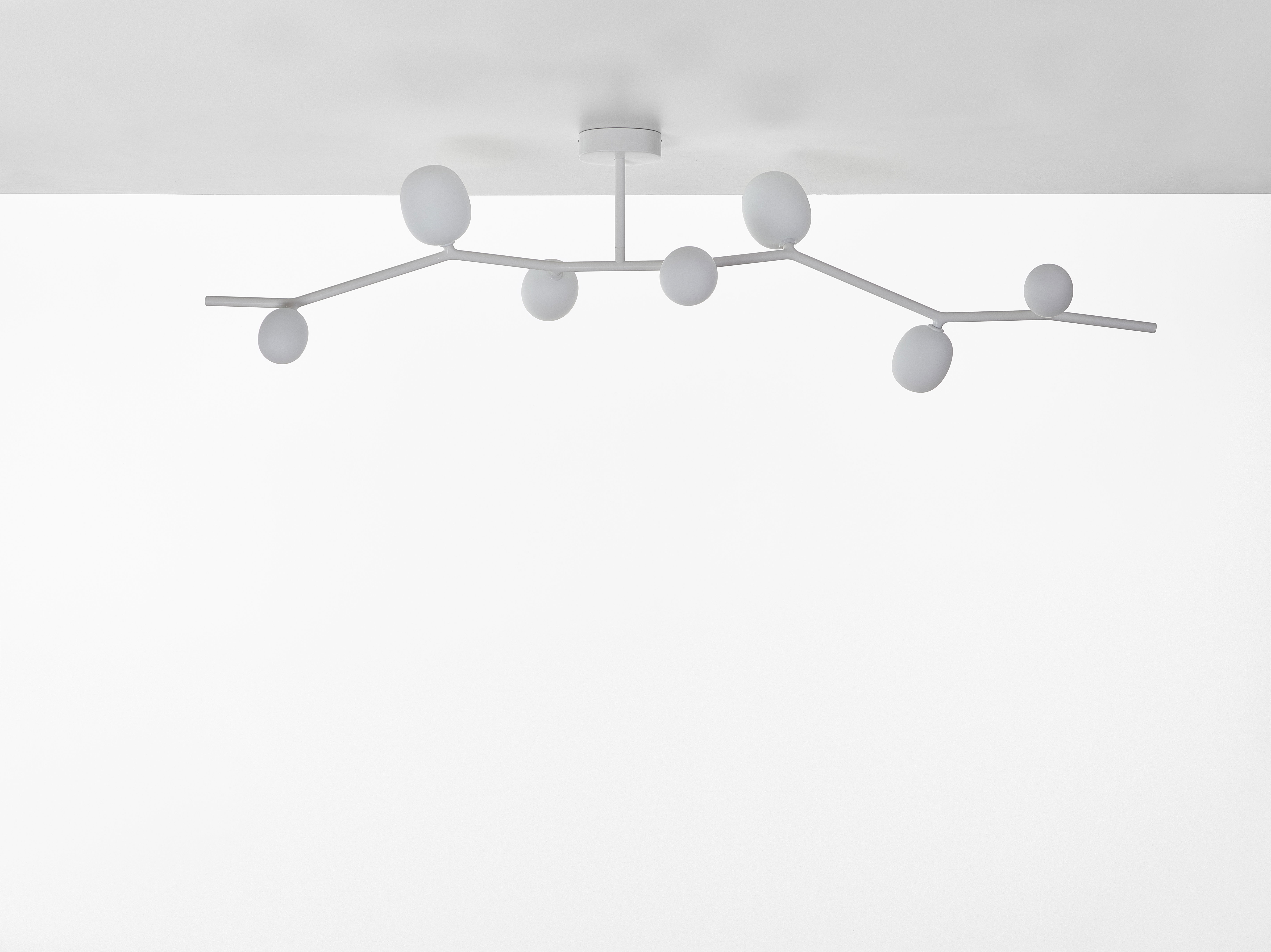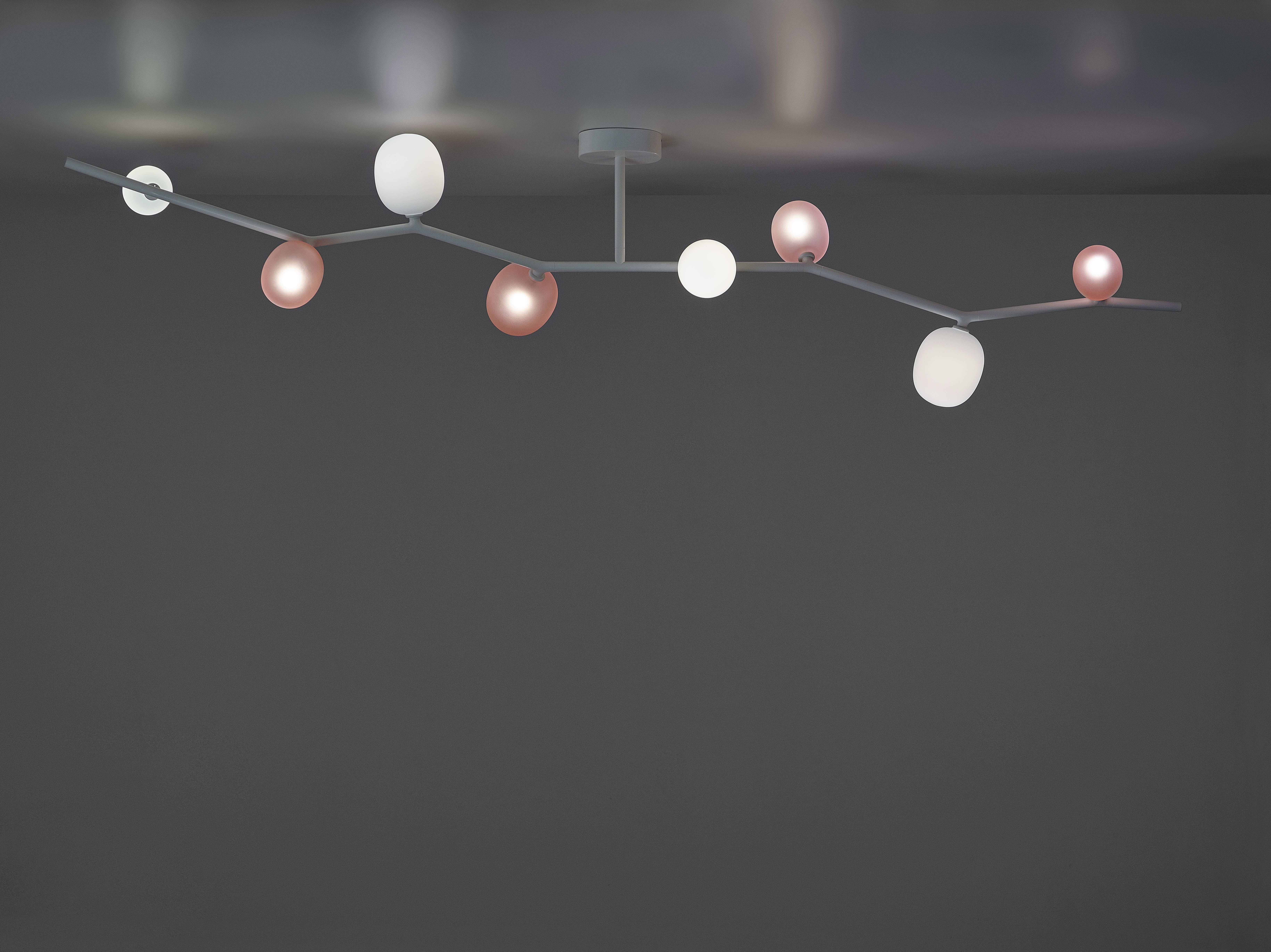 Светильник сочетает металлические элементы и плафоны из выдувного стекла ручной работы. Система включает «ветви» в шести базовых размерах, а также три варианта плафонов, представленных в матовом light rose, опаловом и дымчатом стекле. В рамках коллекции также доступны напольная модель и настольная лампа, дополняющие общую концепцию.