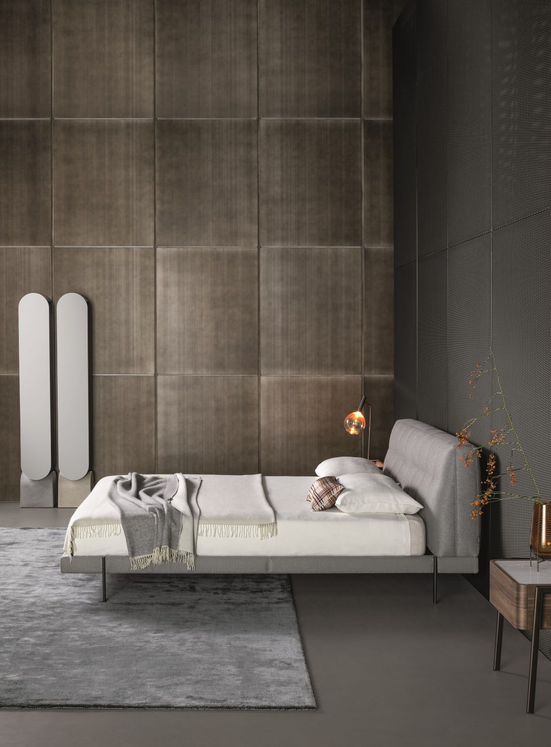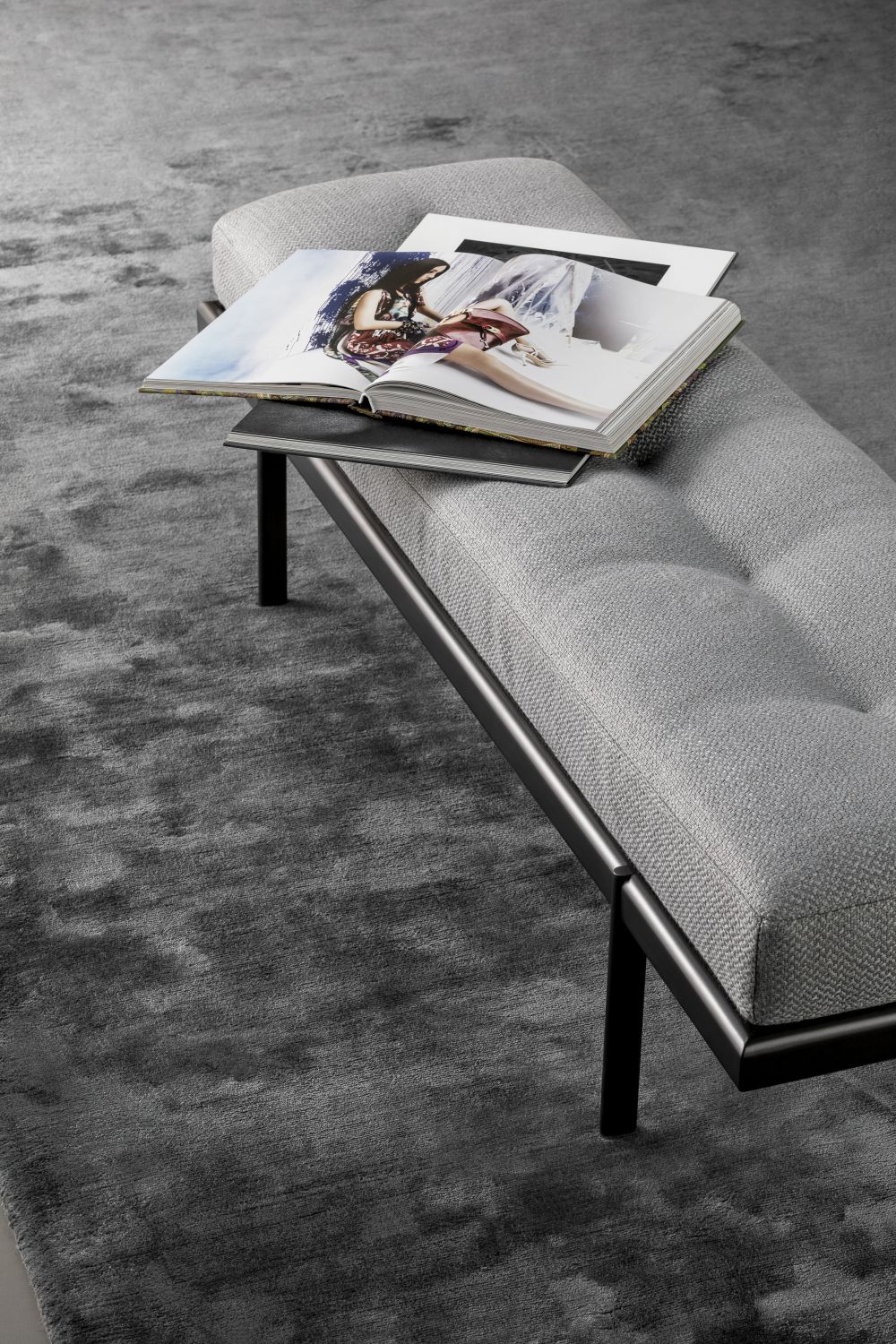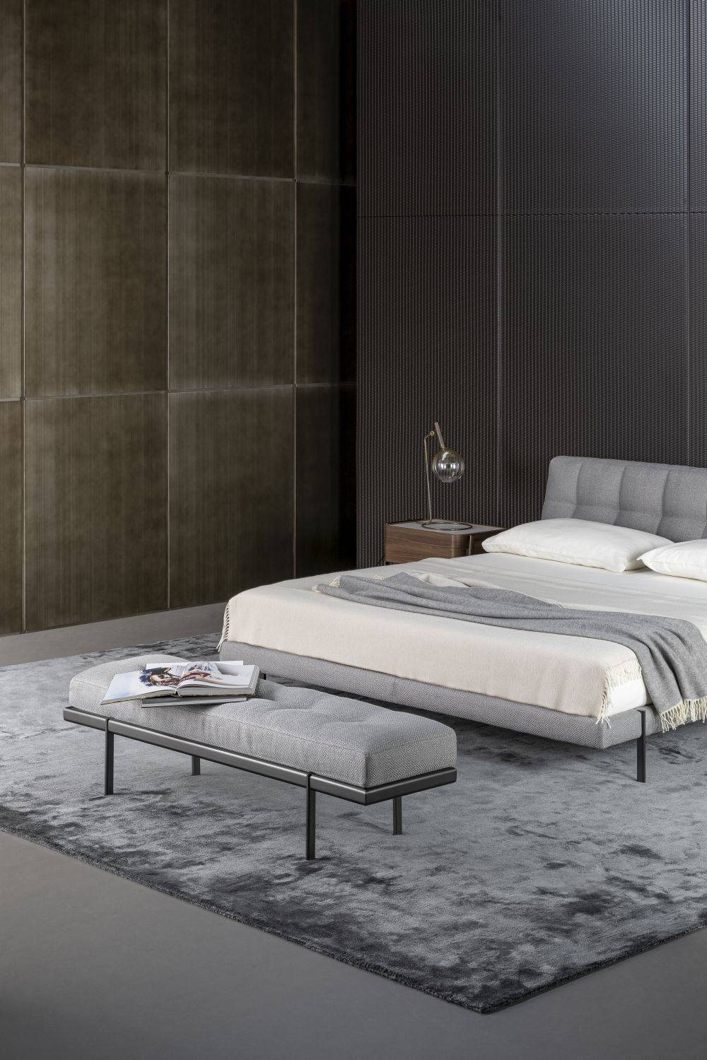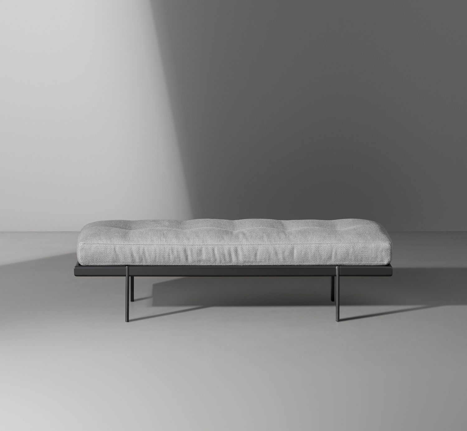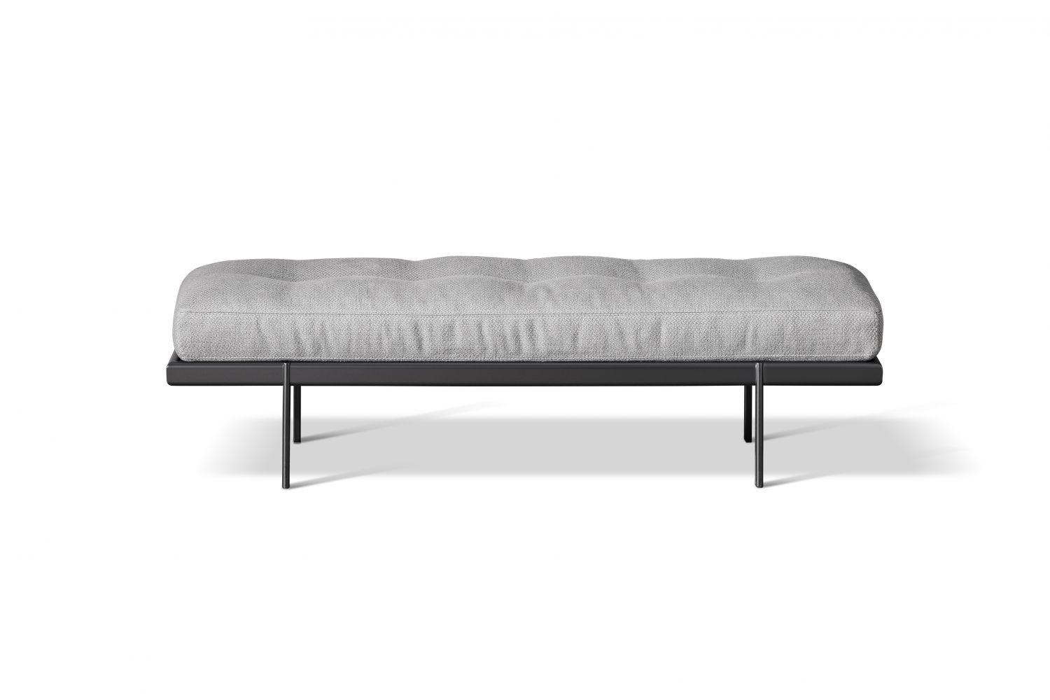 Скамья James, задуманная как гармоничное дополнение к одноимённой двуспальной кровати, воплощает утонченную эстетику 1950-х годов. Её мягкое сиденье украшено аккуратной строчкой и декоративными швами, придающими облику ретро-шарм и ощущение изысканности. Визуальный акцент на текстильной части ярко контрастирует с лаконичным металлическим основанием, в конструкции которого чётко прослеживается разграничение между объёмным сиденьем и четырьмя стройными цилиндрическими ножками. Благодаря точному балансу форм и материалов, скамья выходит за пределы привычных стилевых решений, придавая интерьеру особую выразительность.