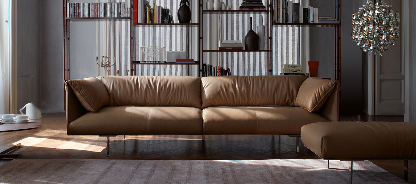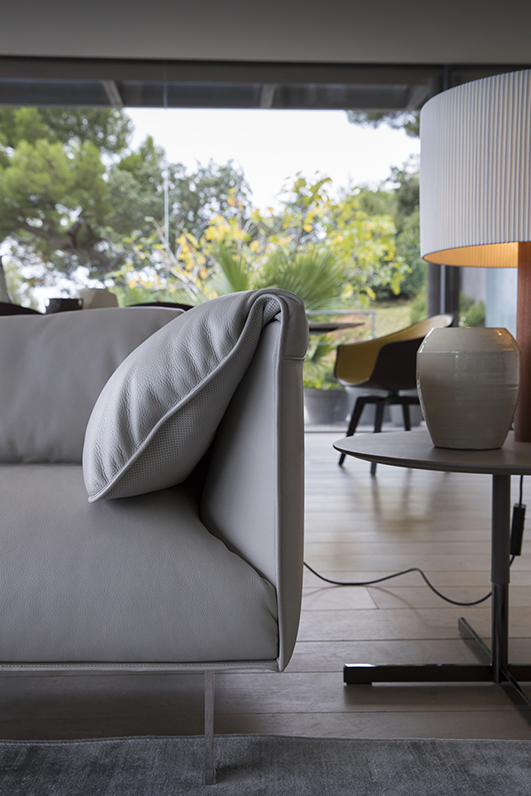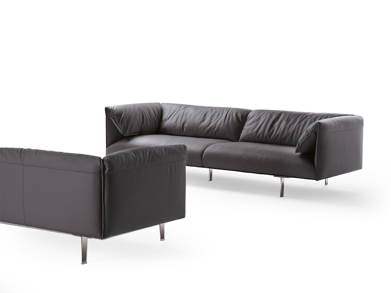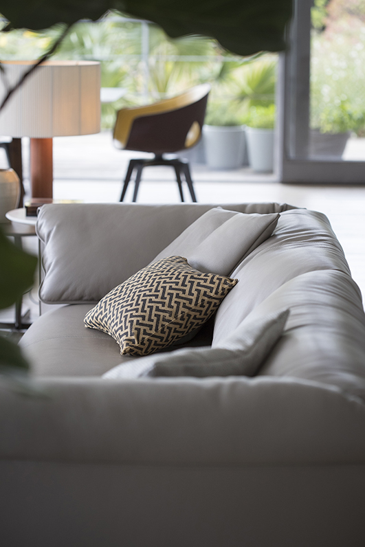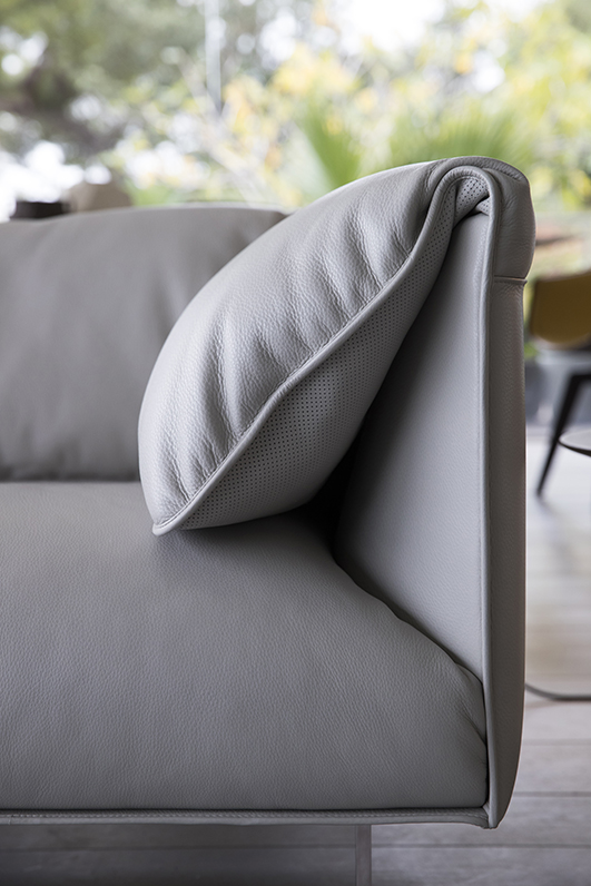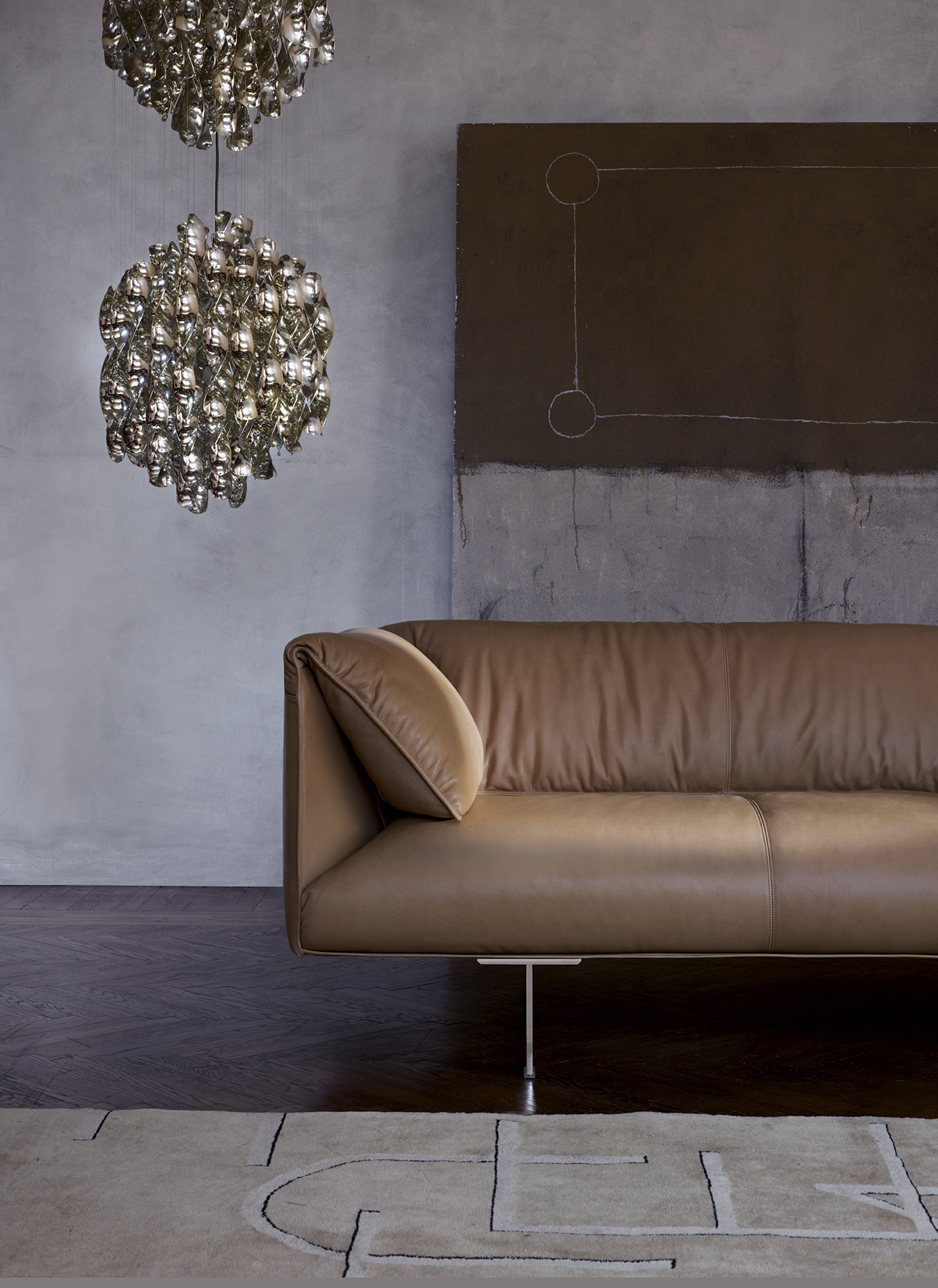 Диван John-John имеет прочный буковый каркас с центральной железной перекладиной. Спинка и подлокотники, наполненные пенополиуретаном и синтепоном, изготовлены из массива бука и тополя, а панели – из фанеры из тополя и березы. Подушки, набитые мягким гусиным пухом и обтянутые сзади микроперфорированной кожей Pelle Frau®, адаптируются к движениям тела и подчёркивают мягкость и комфорт сиденья. Система пружин сиденья состоит из эластичных ремней. Алюминиевые ножки с рутениевым покрытием и прозрачными пластиковыми защитными колпачками.