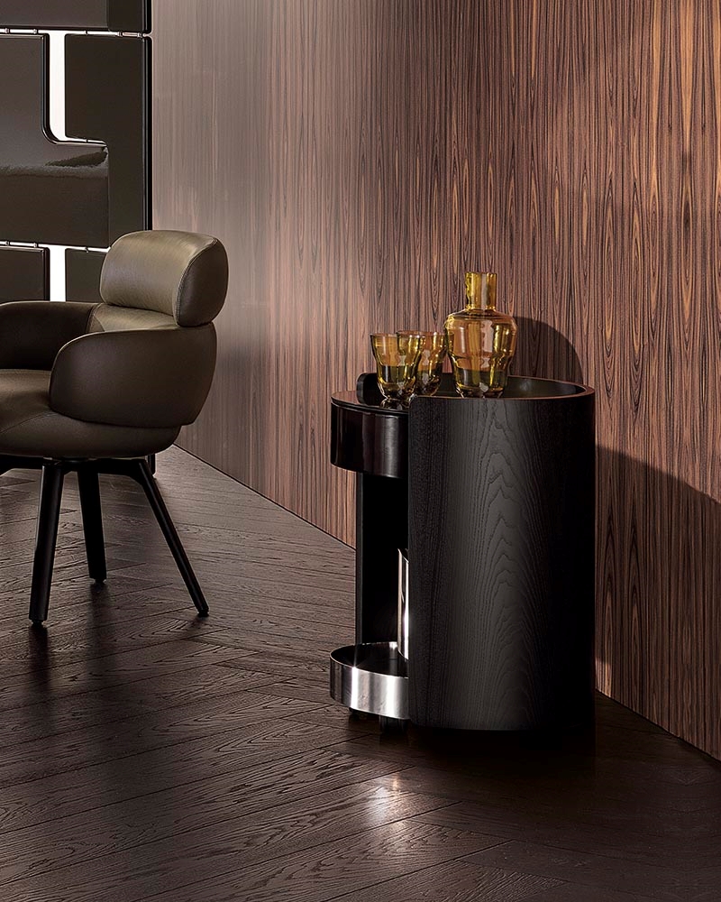 Journey — это элегантный приставной столик, сочетающий в себе функциональность и изысканный дизайн. Его цилиндрическая лакированная деревянная рама включает центральный отсек для бутылок, верхний ящик с зеркальной крышкой и нижнюю полку, украшенную полированной нержавеющей сталью. Благодаря своим компактным размерам и мобильности, Journey идеально подходит для использования в гостиной или столовой в качестве сервировочного столика или мини-бара.