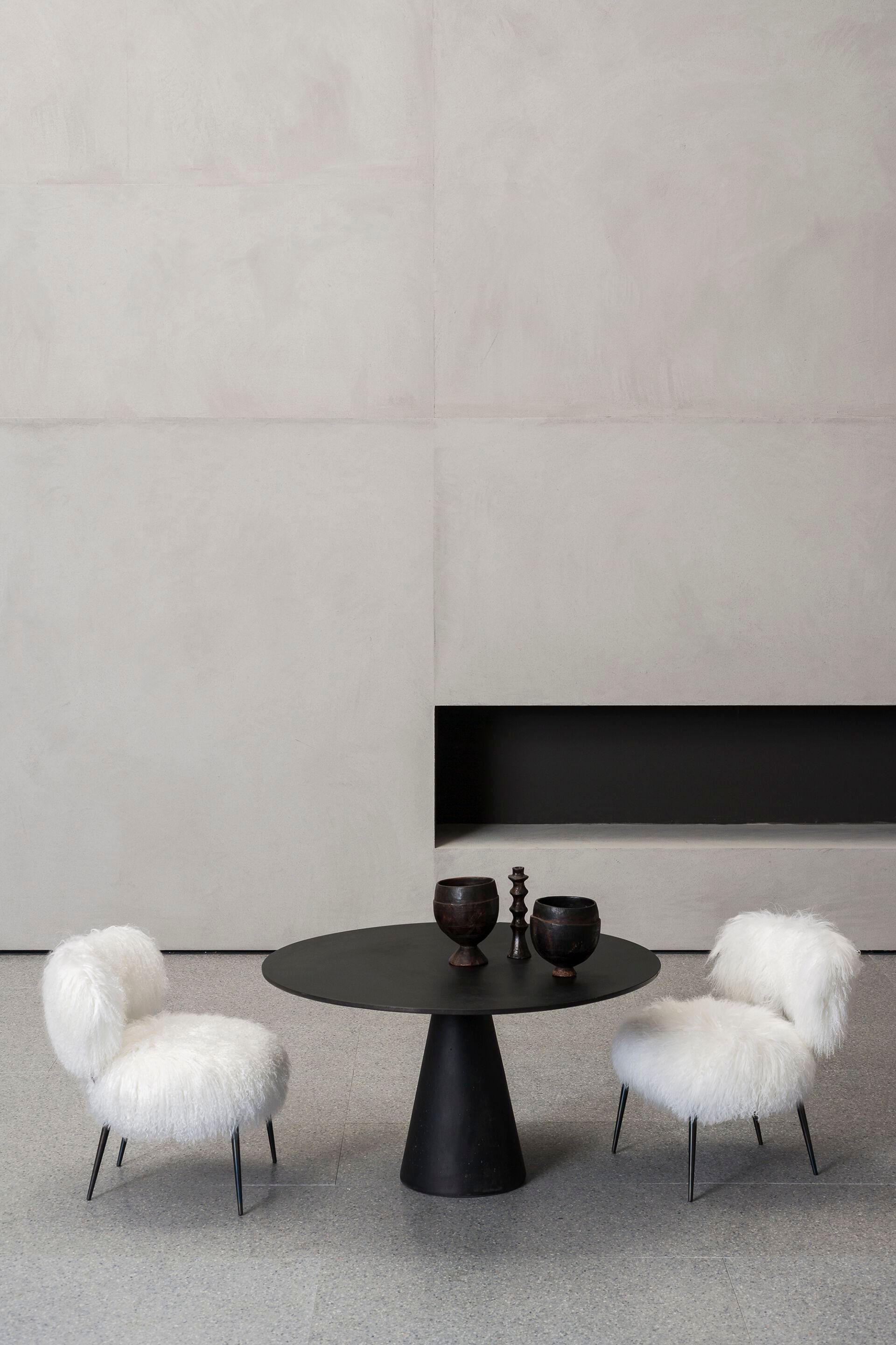 Jove — это круглый стол с выразительной формой, выполненный из смеси тёмно-серого бетона и мраморной крошки цвета эбенового дерева, что придаёт изделию фактурность и визуальную насыщенность.