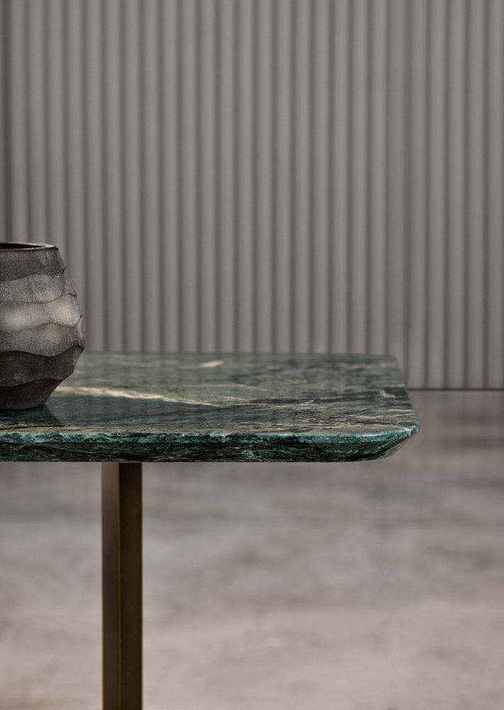 Материалы: столешница — мрамор, глянцевое или сатинированное стекло, дерево; основание — литой алюминий с лакированной отделкой