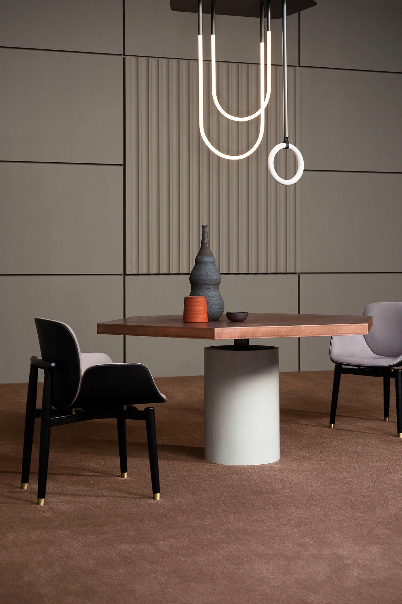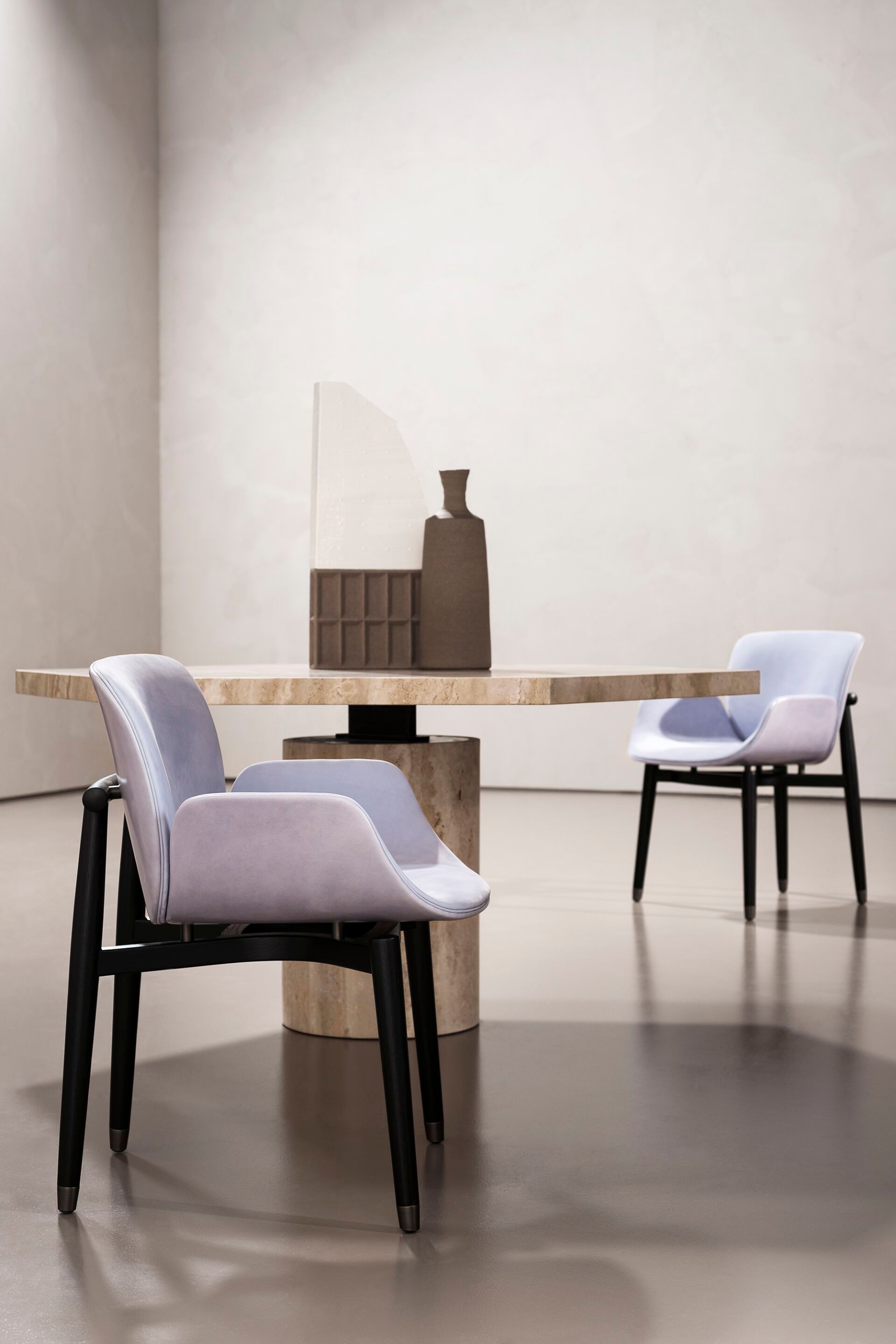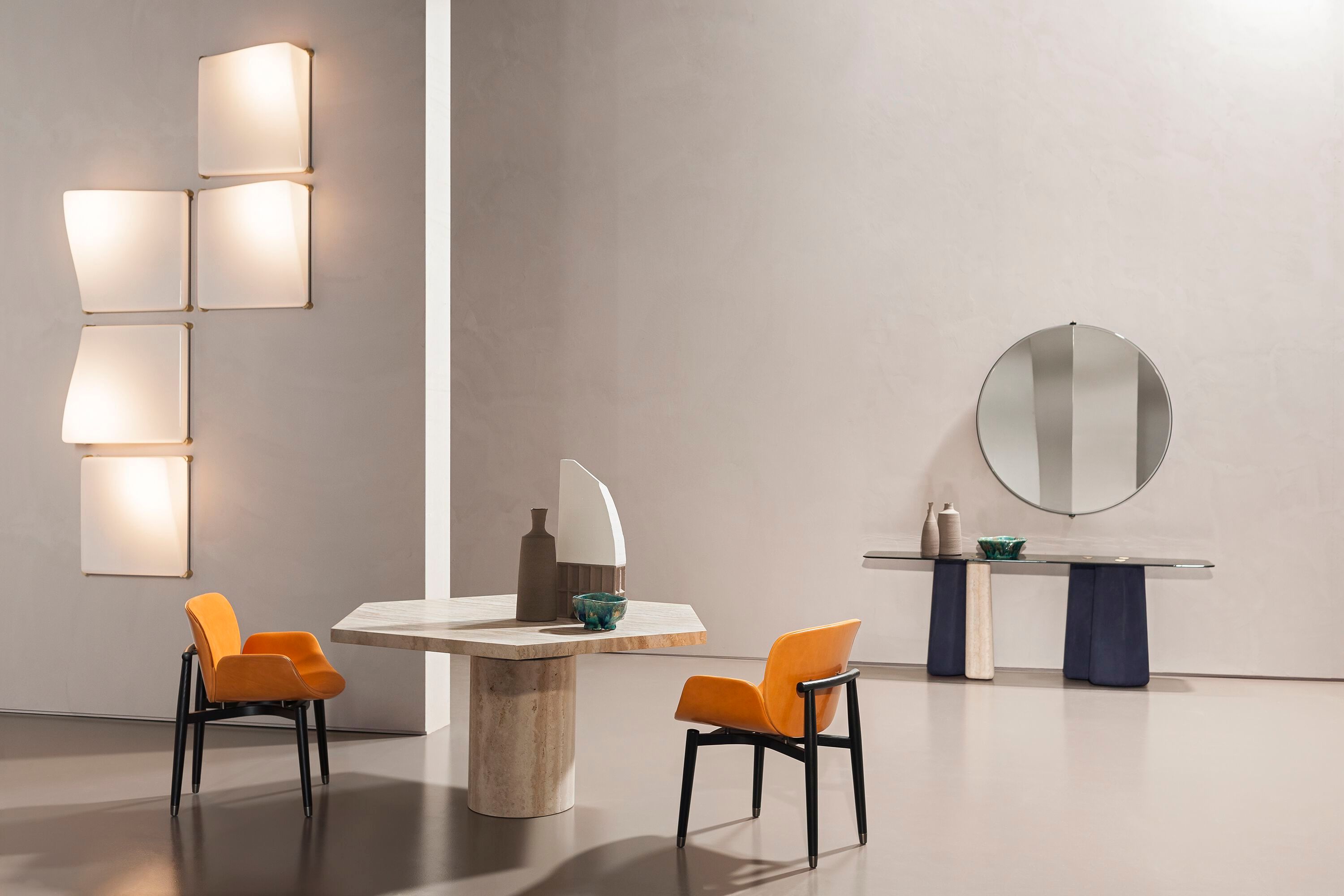 Спецвыпуск Travertino: цилиндрическая ножка из цельного мрамора Travertino White с открытой пористой структурой и патинированной отделкой; фигурная ножка — покрытие из плит Travertino, пропитка смолой и брашинг.