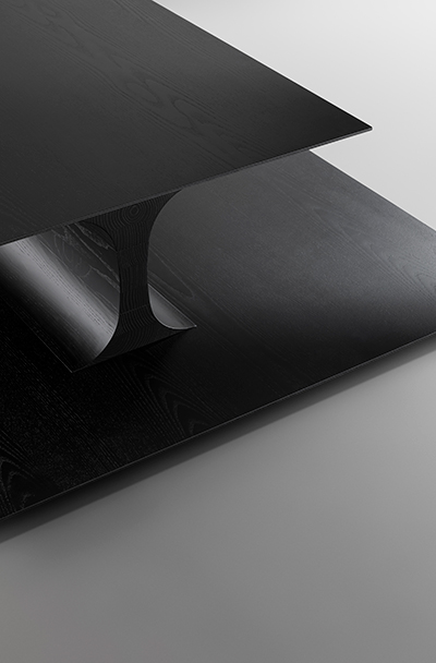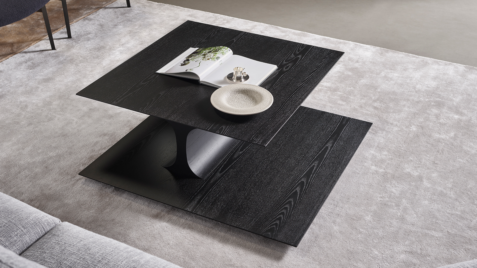 Конструкция столика основана на идее двухуровневой композиции: нижняя столешница — более широкая и устойчивая, верхняя — компактнее и изящнее. Обе части соединены между собой вертикальным опорным элементом с изогнутыми линиями, который визуально смягчает строгую геометрию конструкции.
