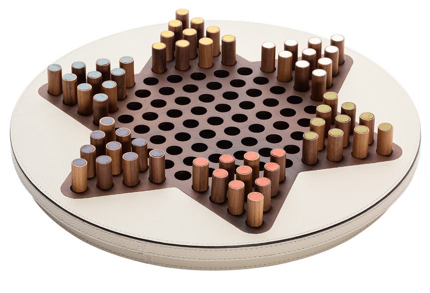 Стратегическая настольная игра в корпусе из орехового дерева, частично покрытом кожей. Игровое поле оформлено кожей, а шарики дополнены кожаными вставками. Яркий и выразительный дизайн делает набор декоративным акцентом интерьера.