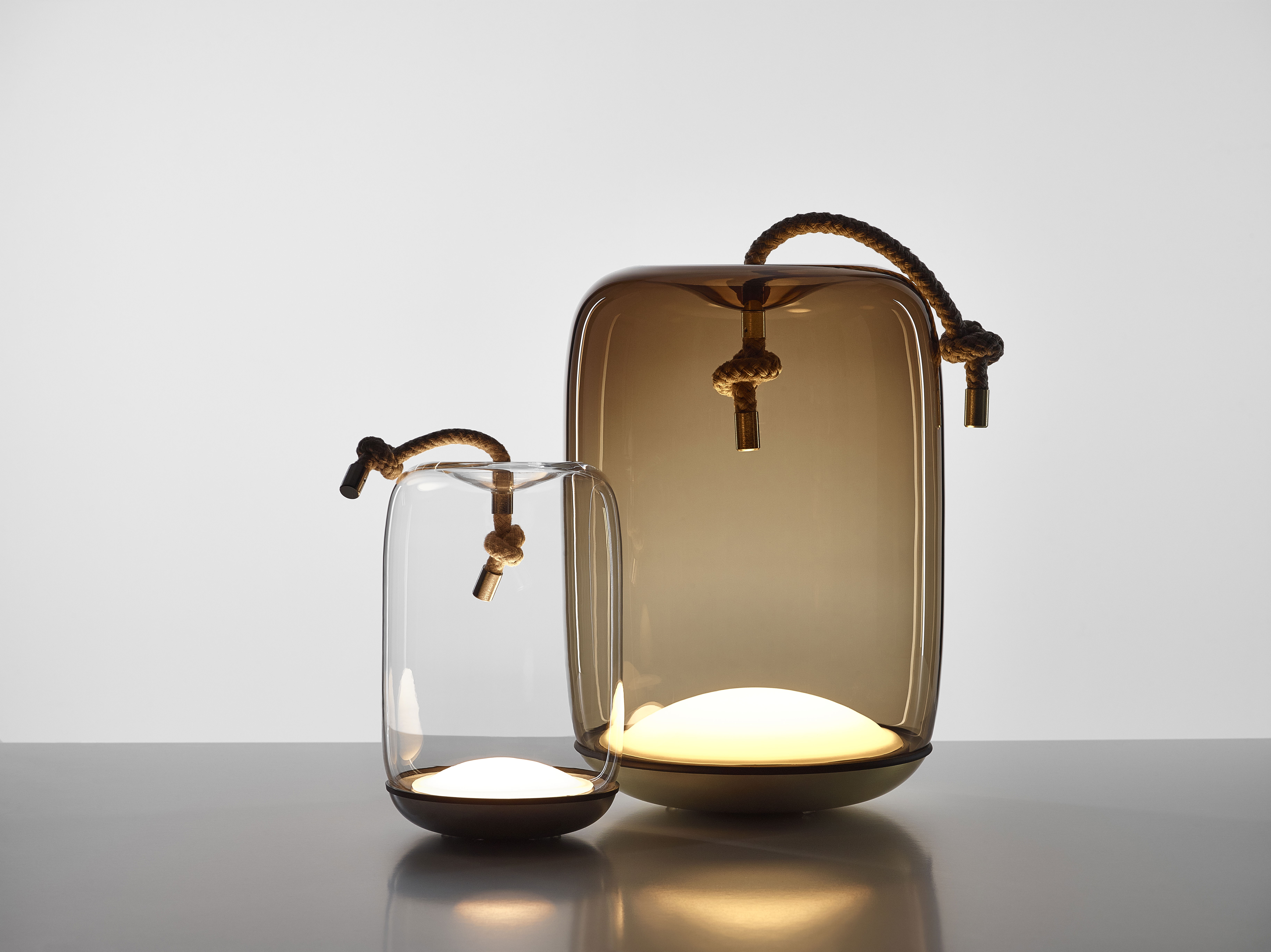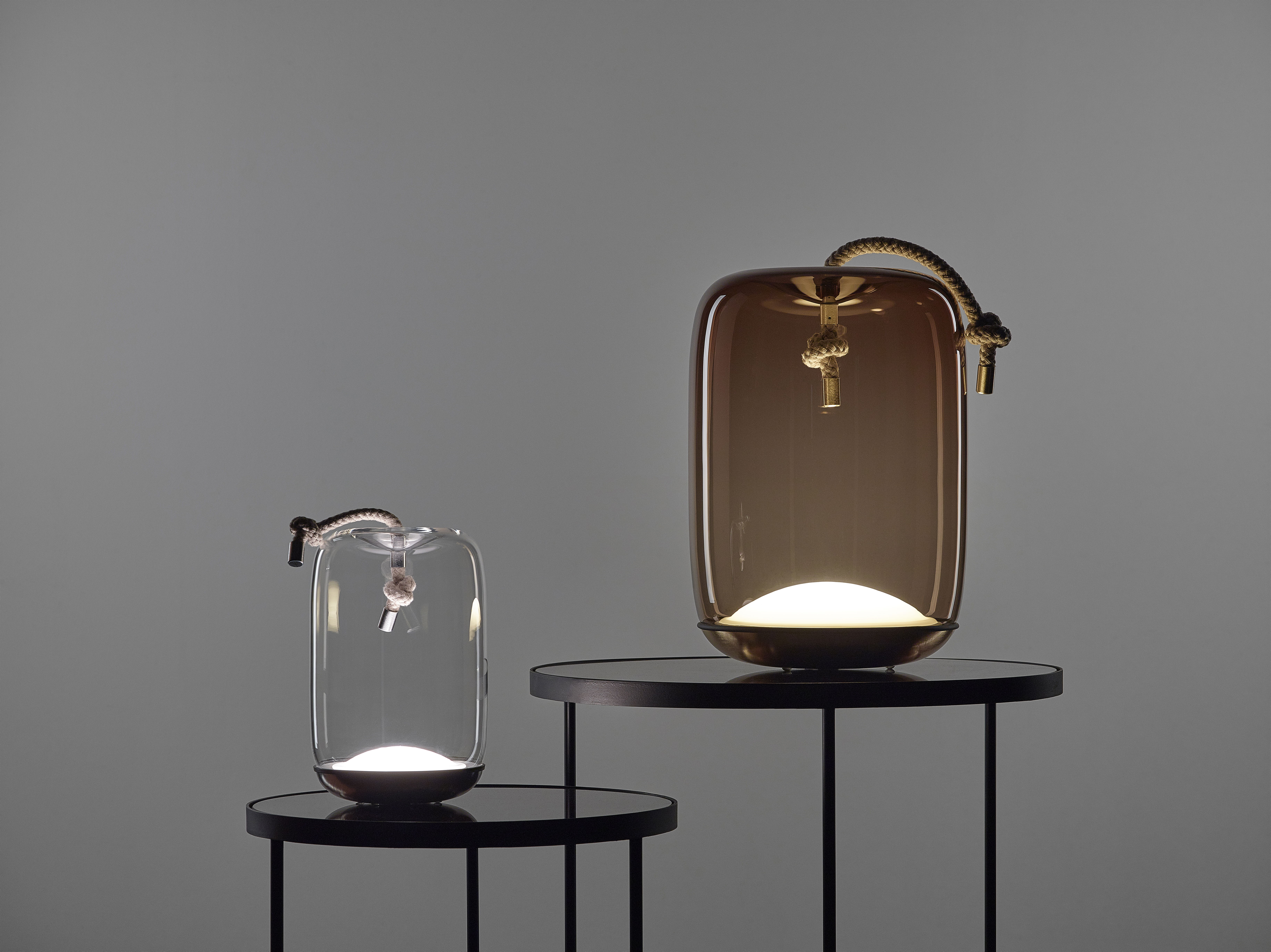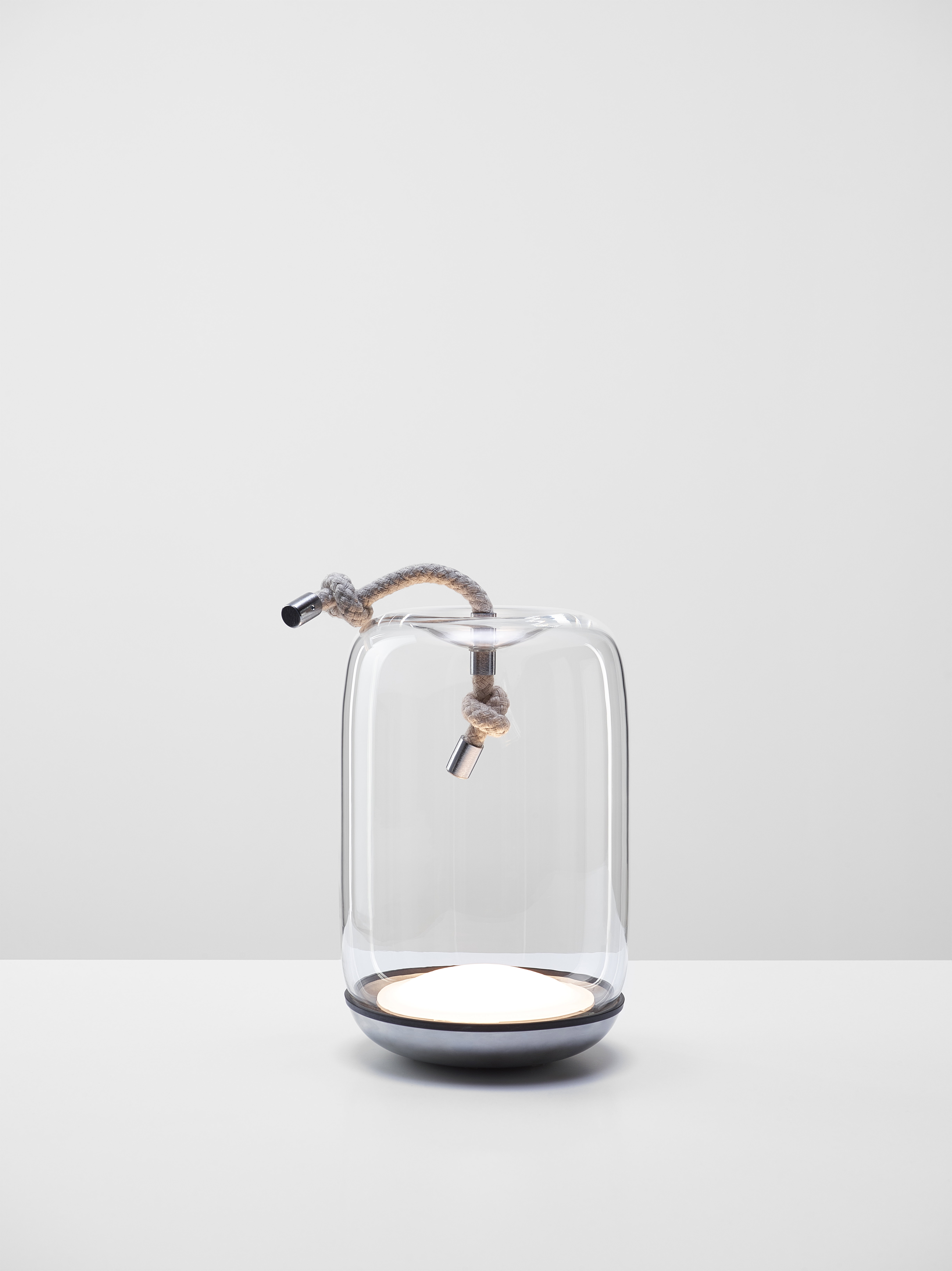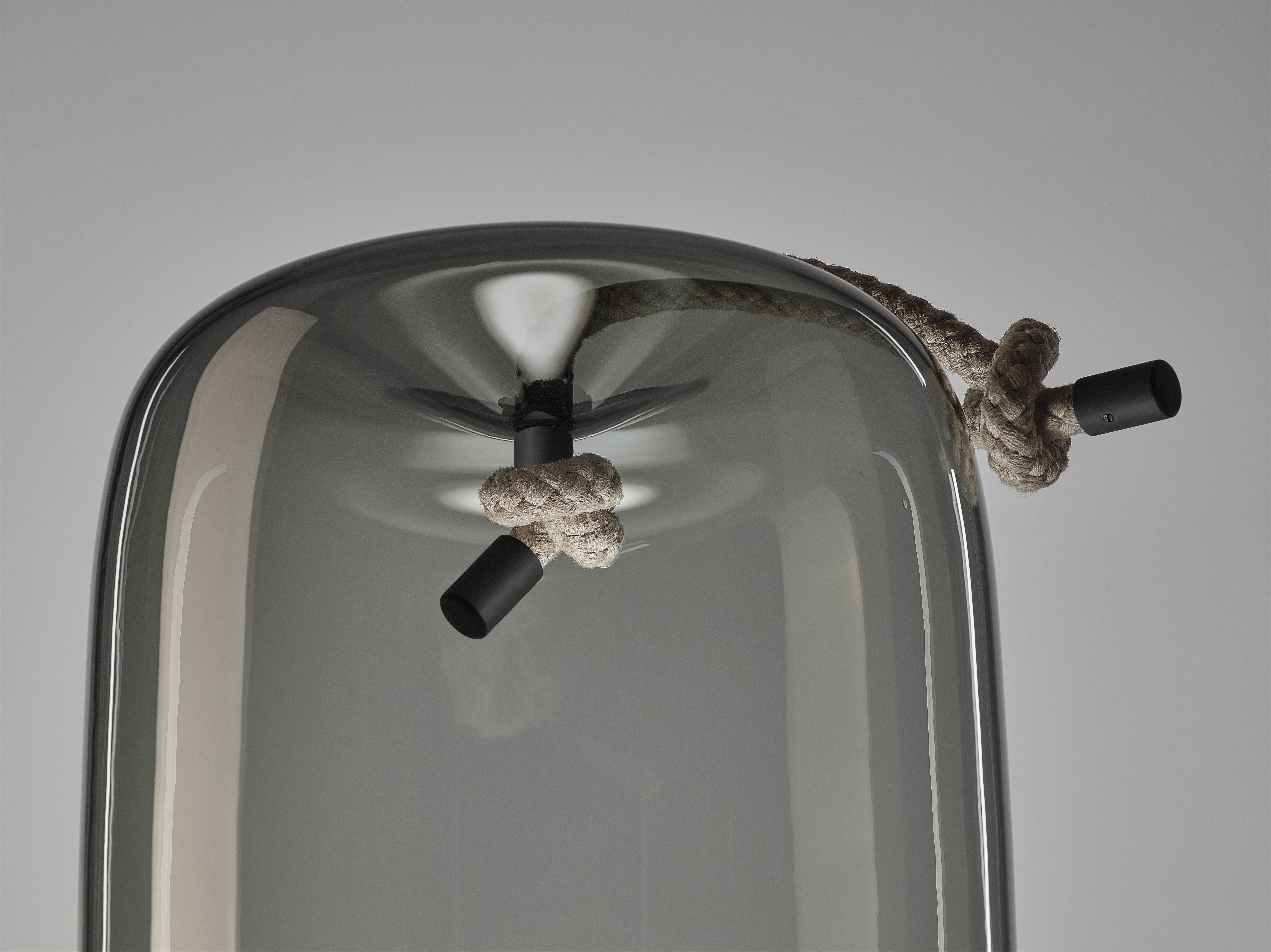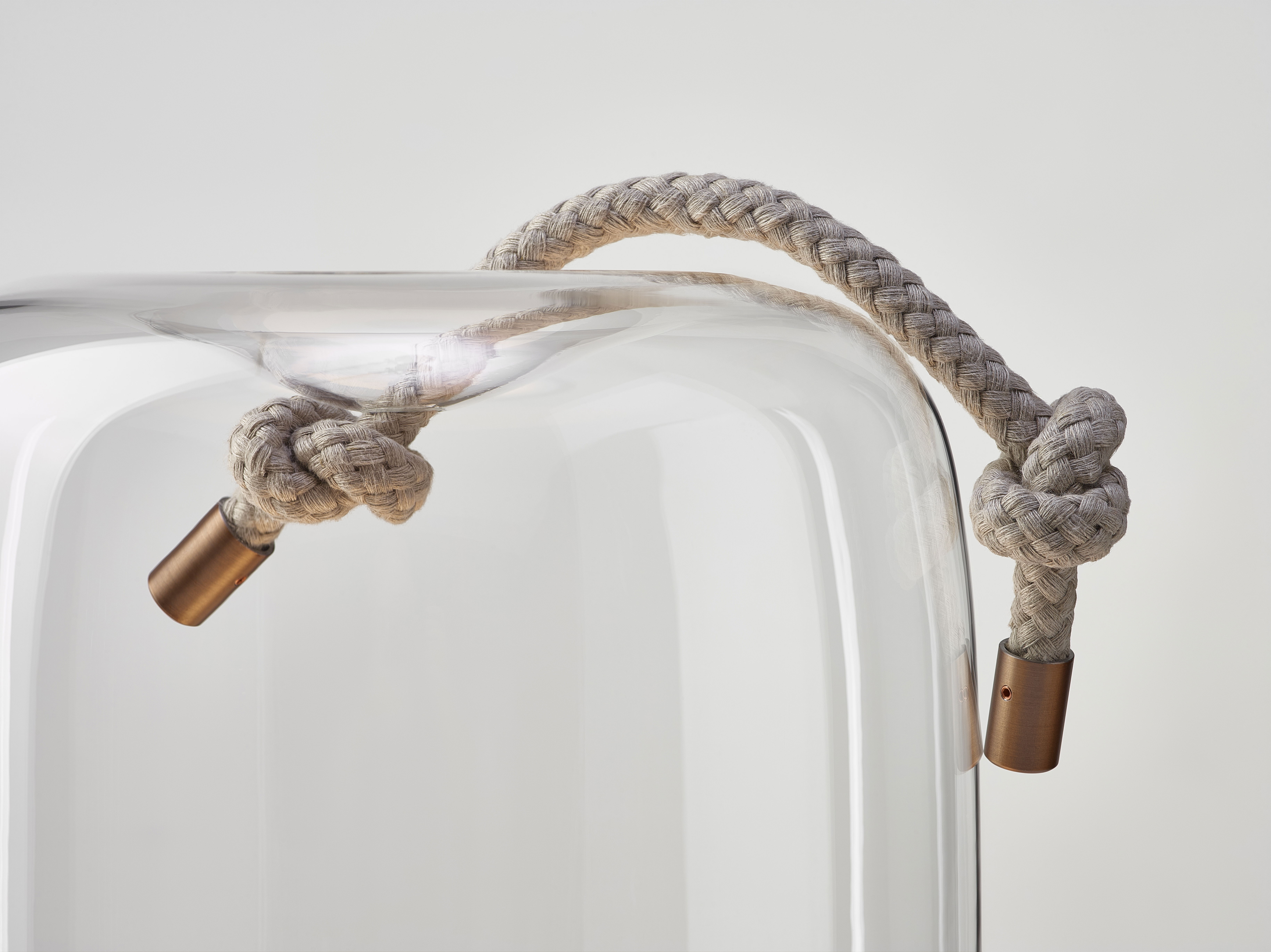 Дизайн объединяет грубое натуральное волокно и гладкое прозрачное выдувное стекло ручной работы, создавая эффектный и в то же время сдержанный контраст. В оригинальной коллекции Knot используются плафоны различных форм и размеров, через которые проходят прочные шнуры, визуально «тянущие» стекло внутрь и формирующие интересный пластический эффект.