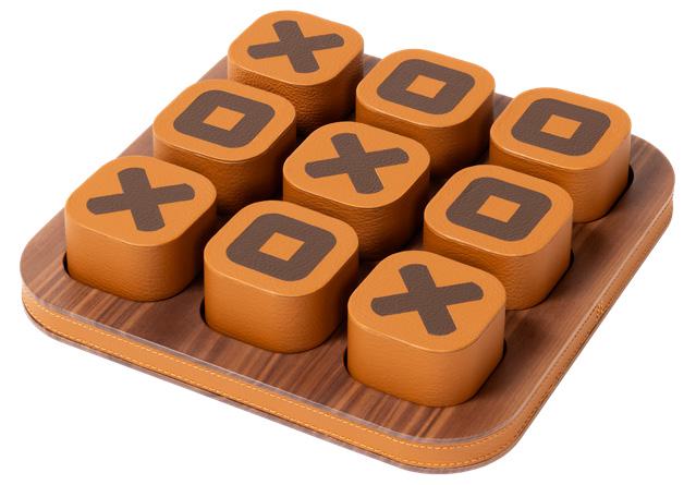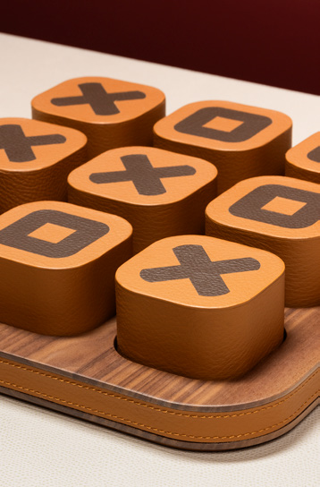 Игровые элементы, обтянутые кожей, с инкрустированными графическими мотивами. Основание из орехового дерева дополнено кожаными деталями.