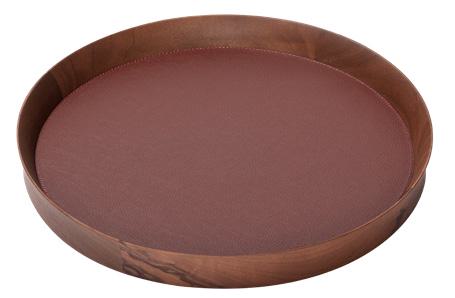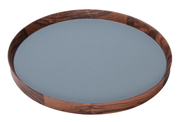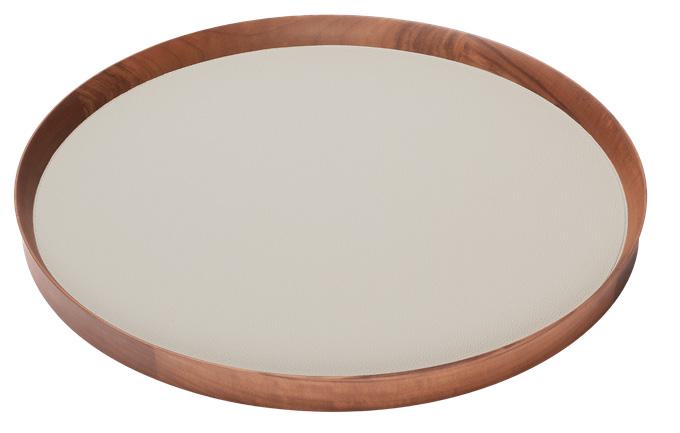 Модель выполнена из массива ореха и дополнена вставкой из тонкой кожи Pelle Frau®, которая подчёркивает глубину текстуры натурального дерева и создаёт выразительный контраст материалов. Чёткая геометрия круга и аккуратный бортик делают поднос удобным для сервировки и использования в жилом пространстве.