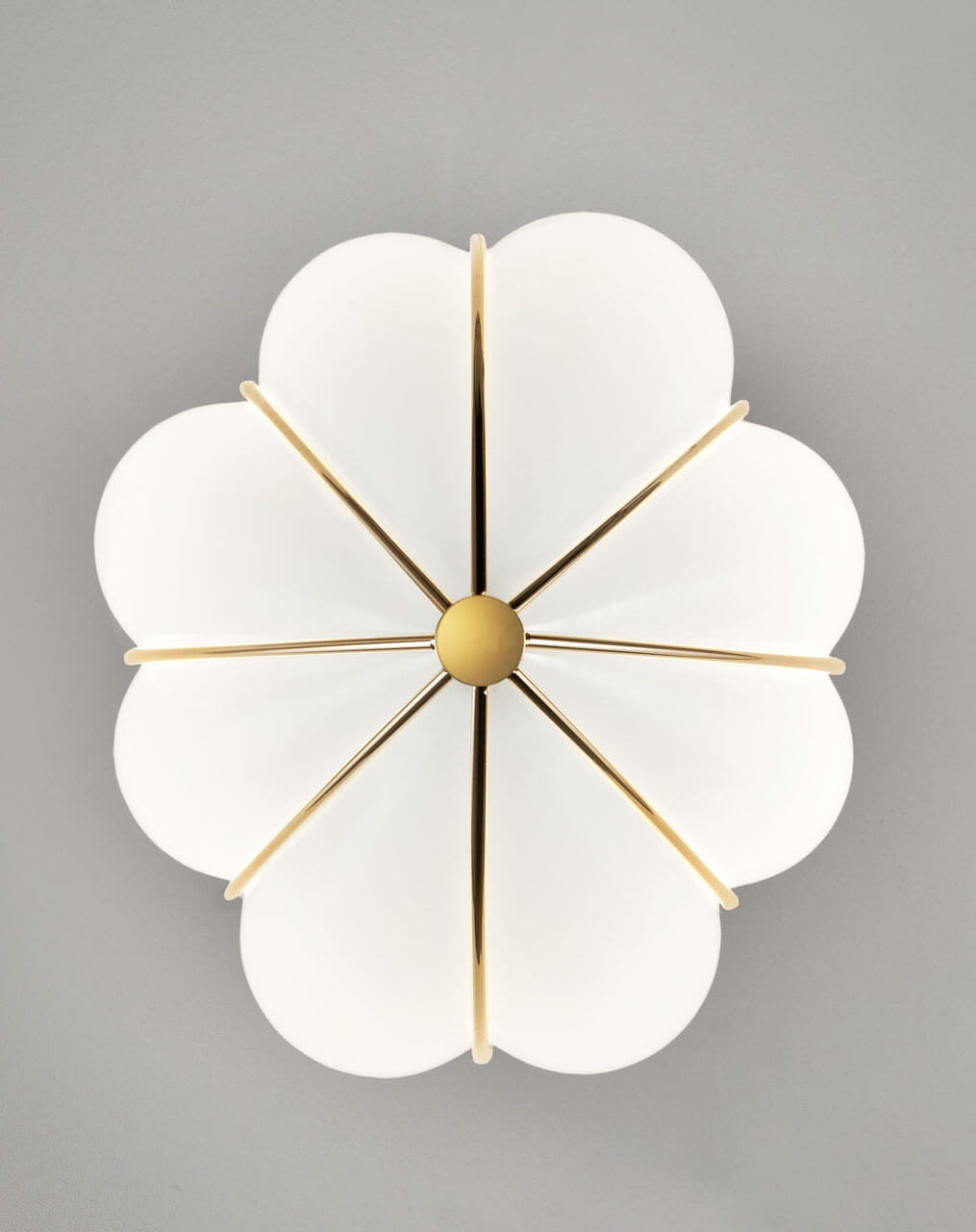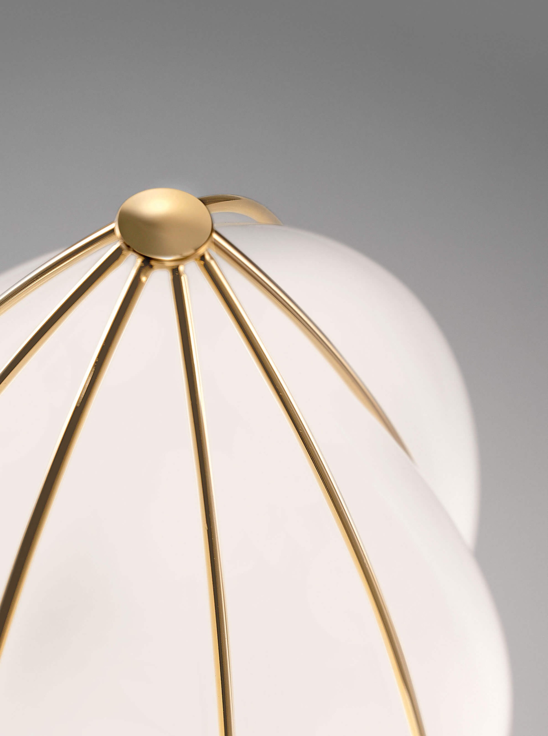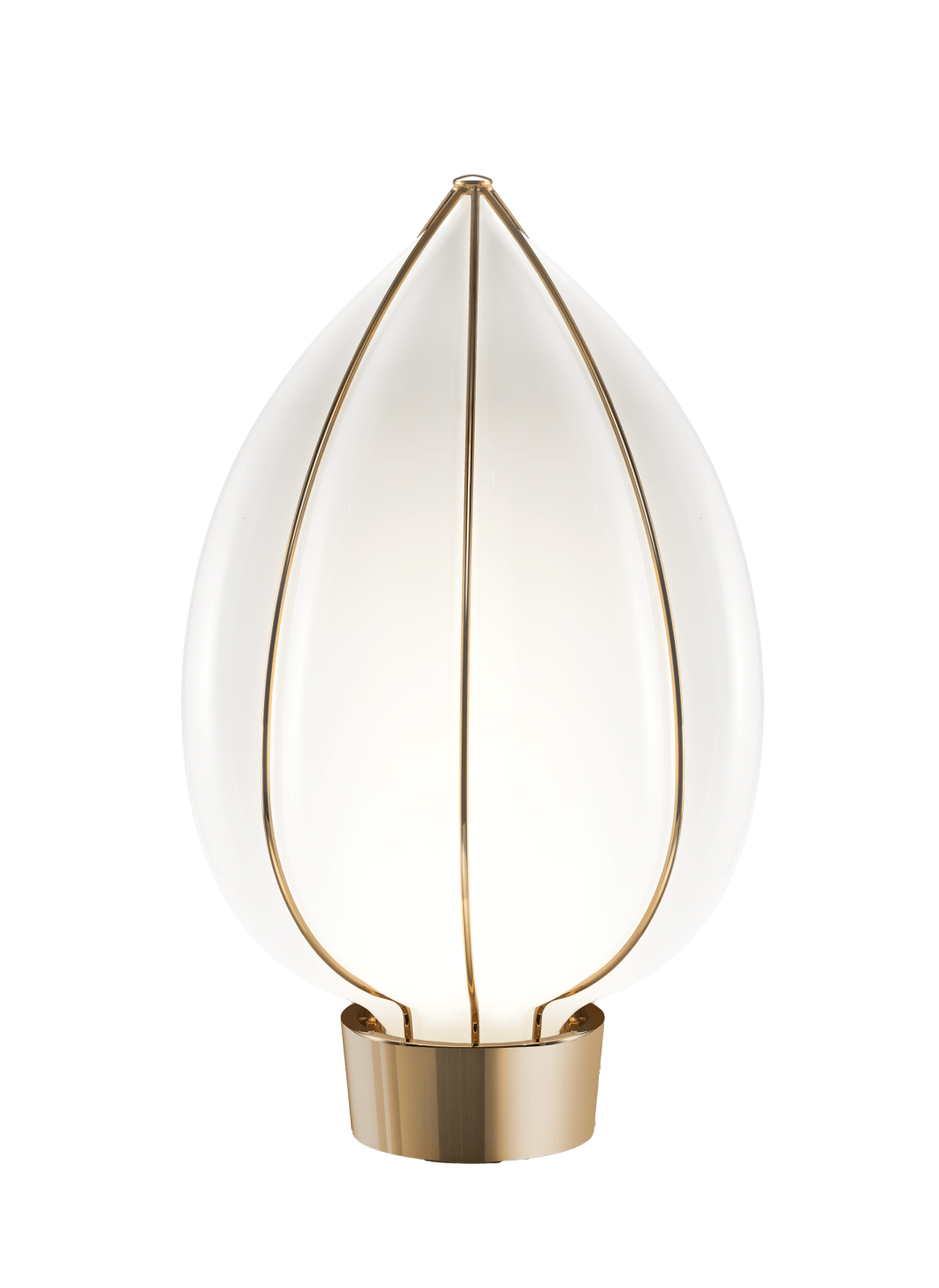 Настольная лампа, изготовленная в технике литья «клетка». Светло-золотой металлический каркас и рассеиватель из белого стекла.