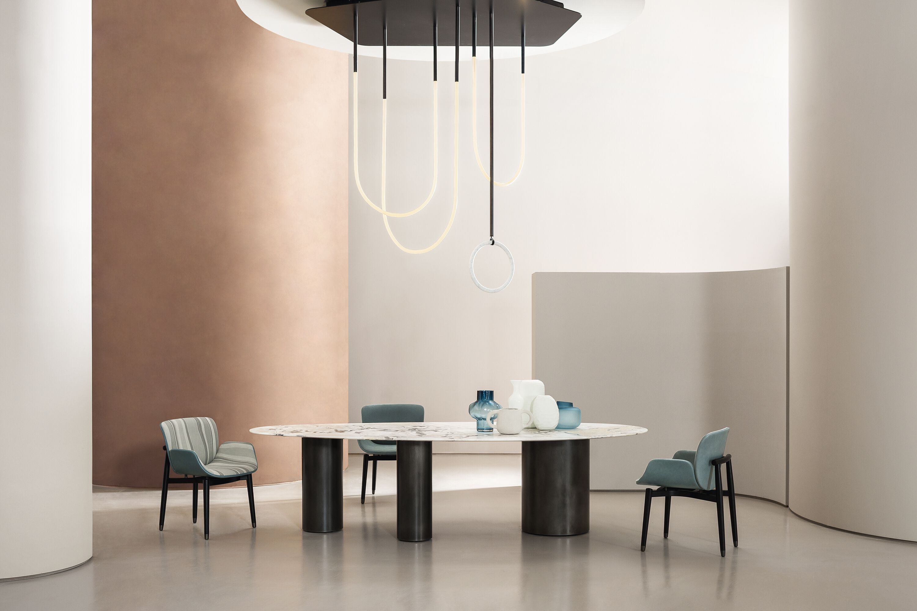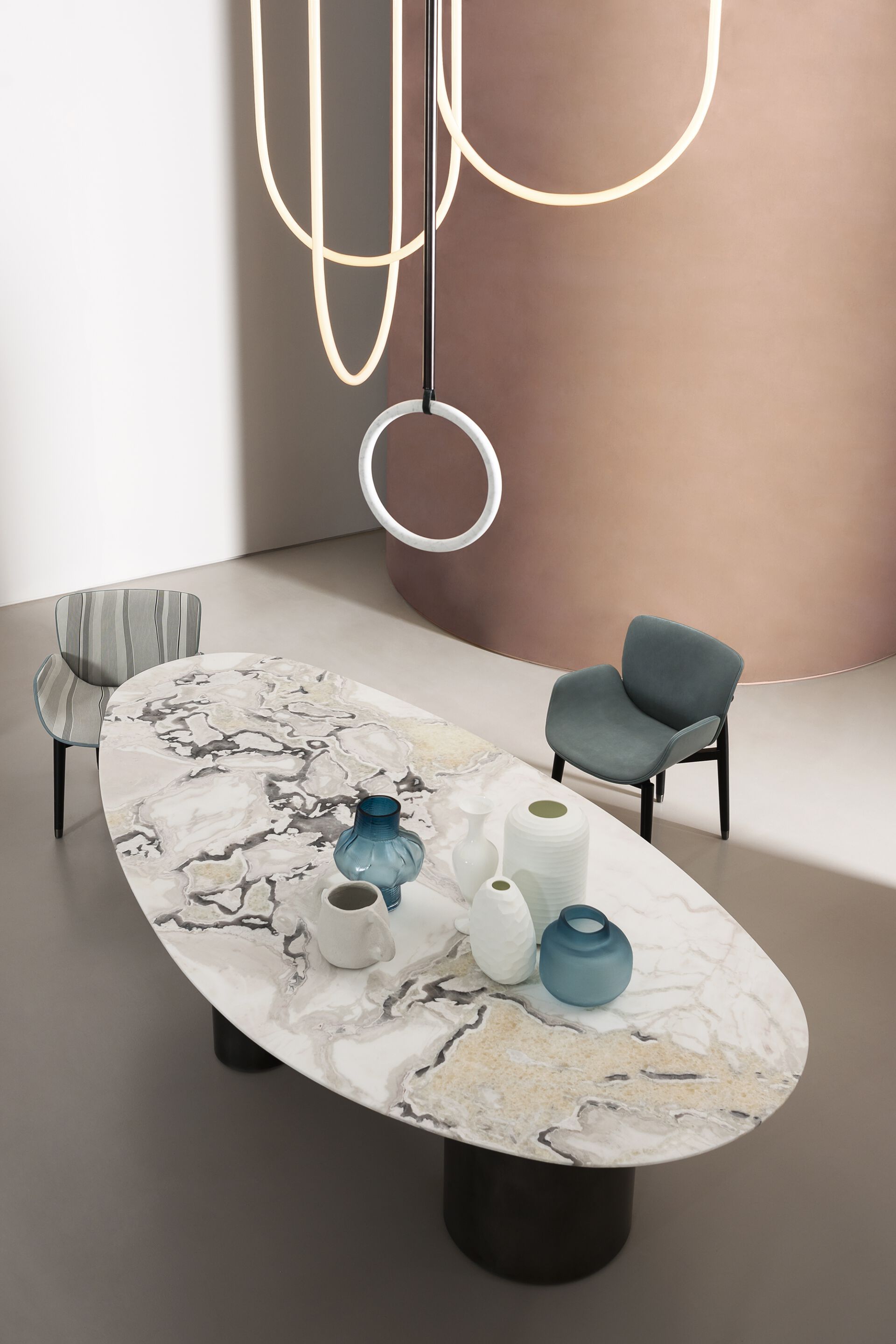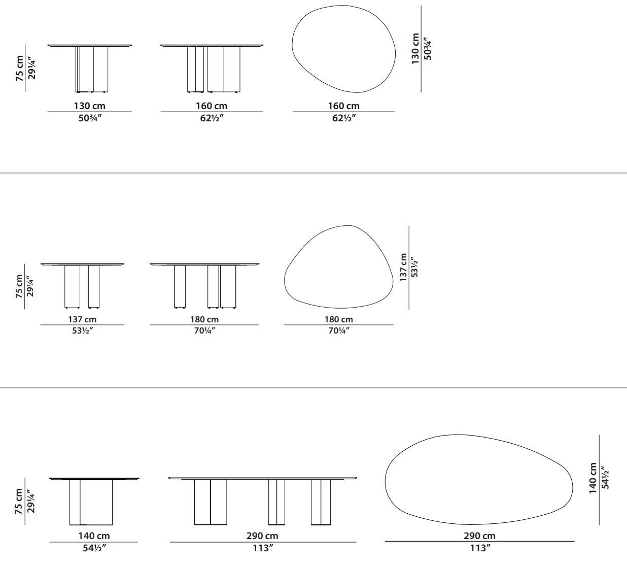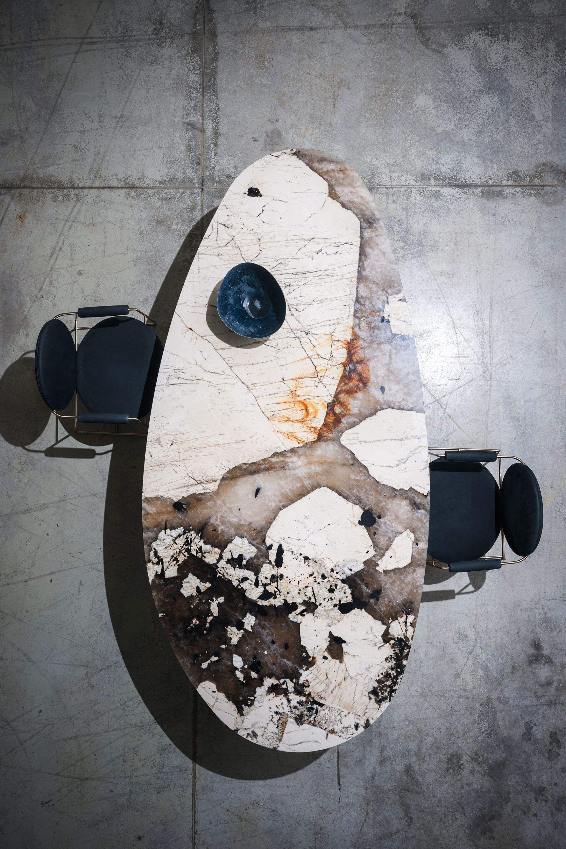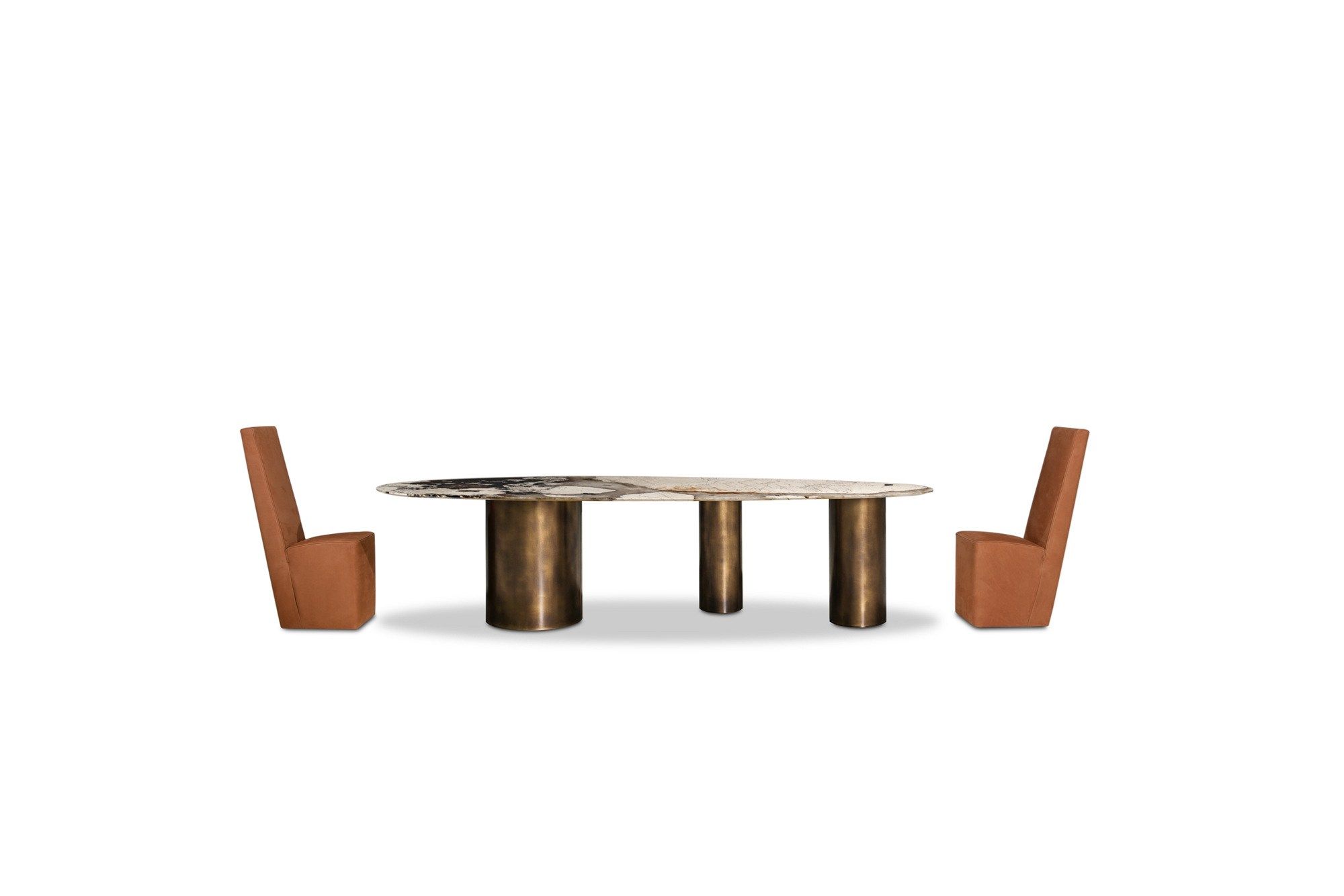 Стол, разработанный Baxter P. Цилиндрические ножки разных размеров, выполненные из черного МДФ, покрытые антикварной латунью или железом. Столешница из камня с поддерживающей основой из лакированного листового металла.
