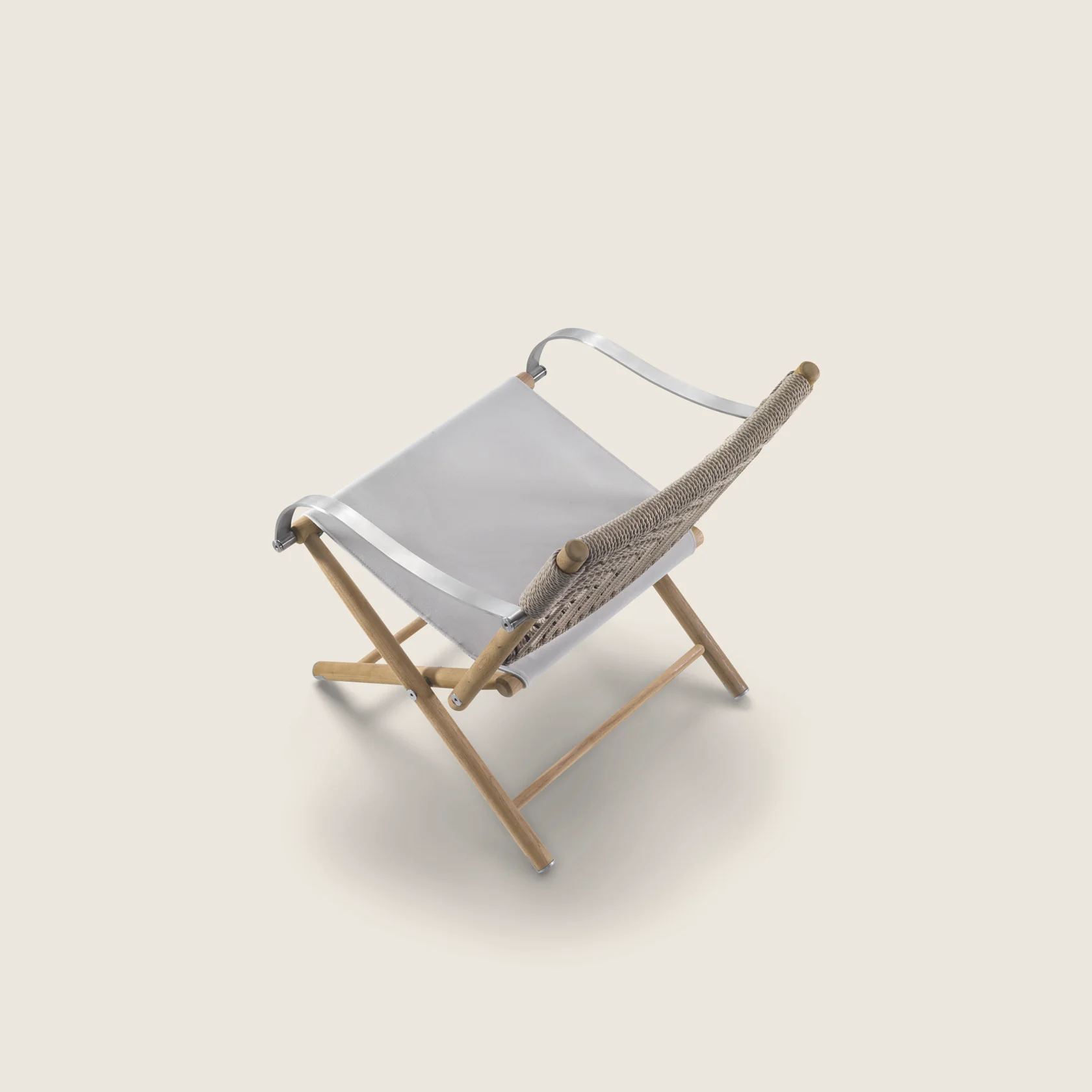 Особенности: Элегантное складное кресло с теплой текстурой дерева и изысканным плетением каната.