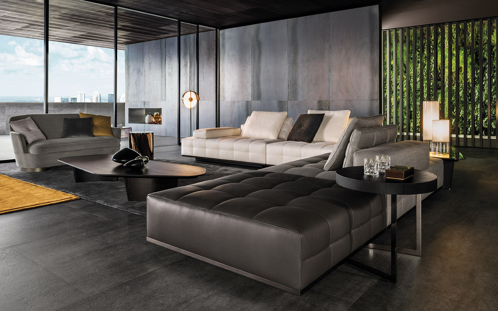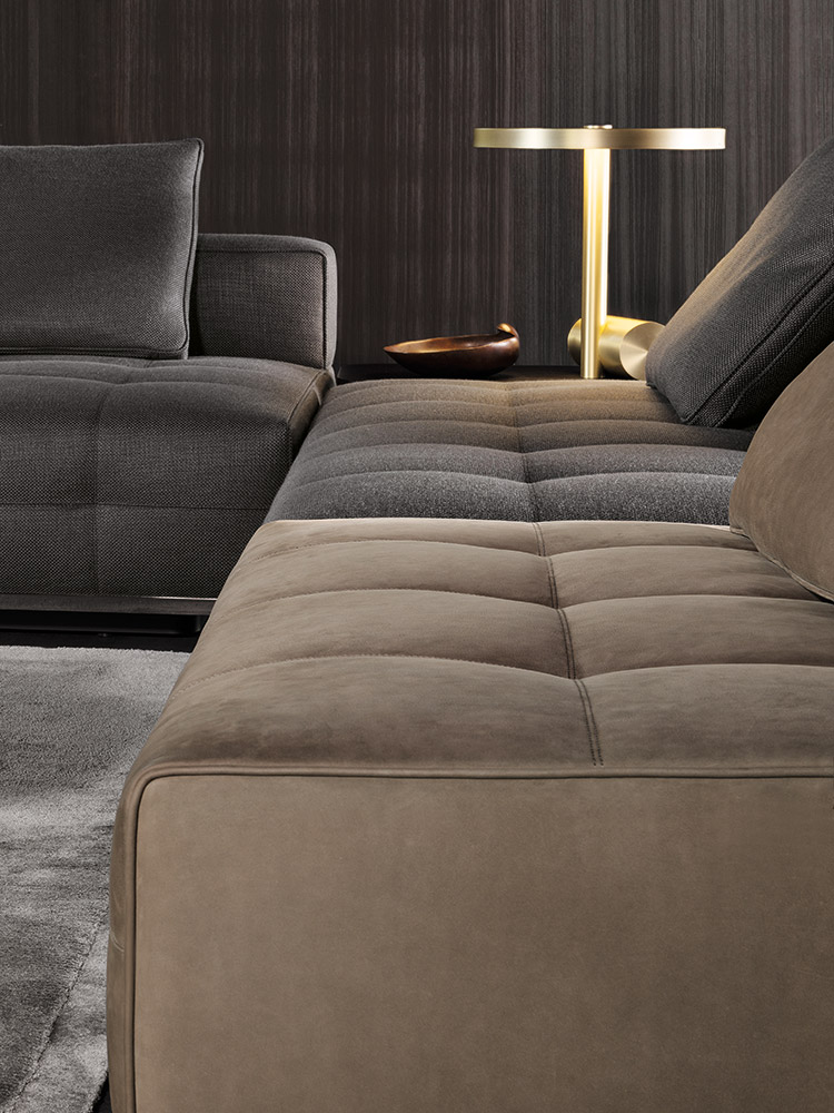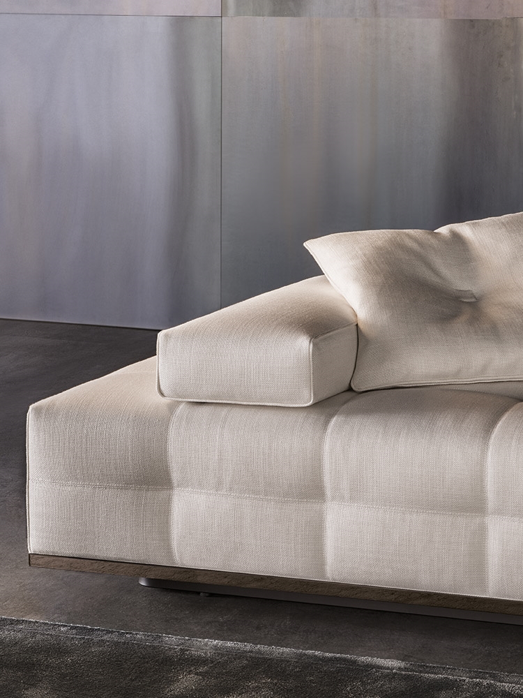 Материалы: каркас — древесина с эластичными ремнями; наполнение — полиуретан разной плотности и гусиный пух; обивка — ткань или кожа Minotti; основание — металл с порошковым покрытием