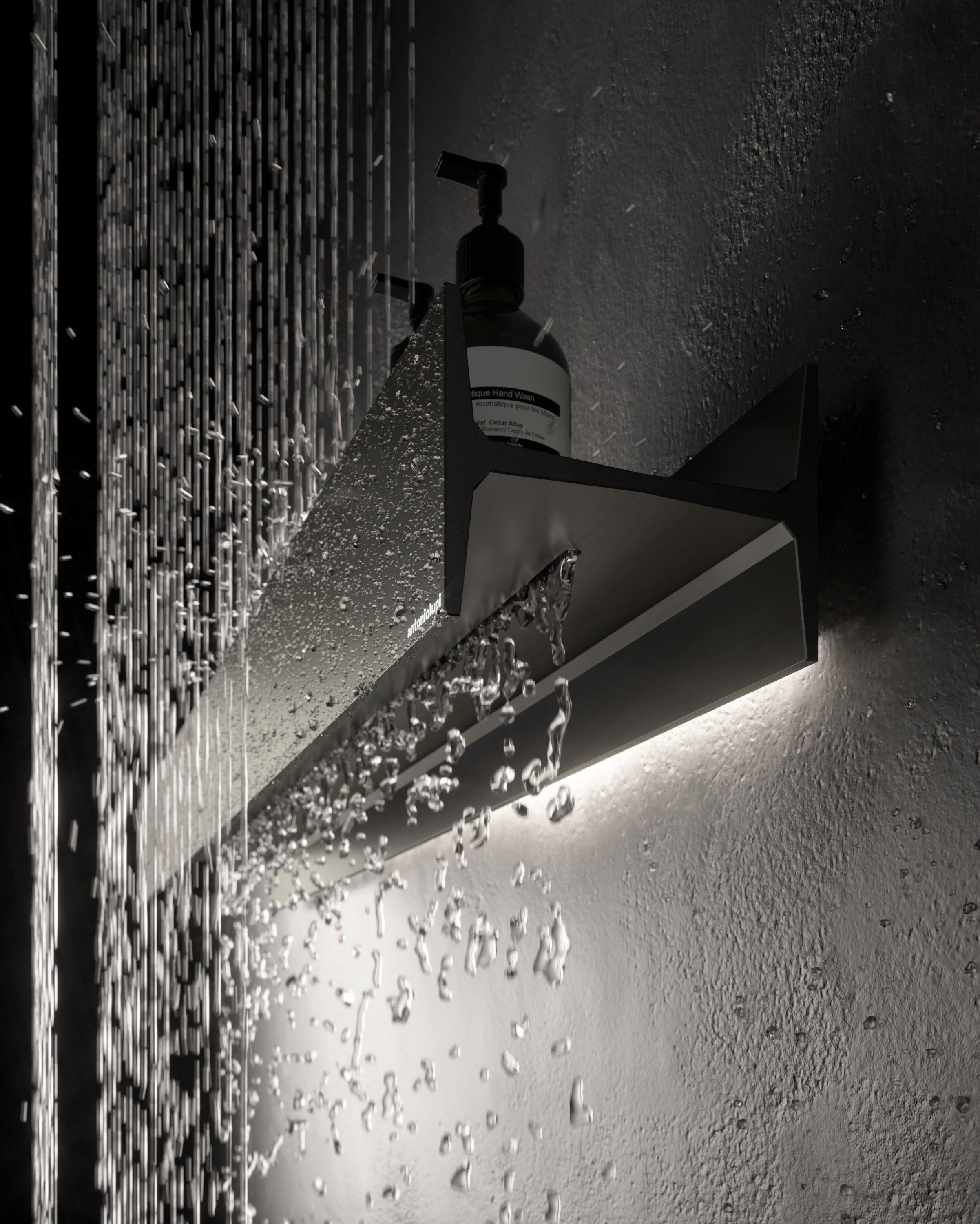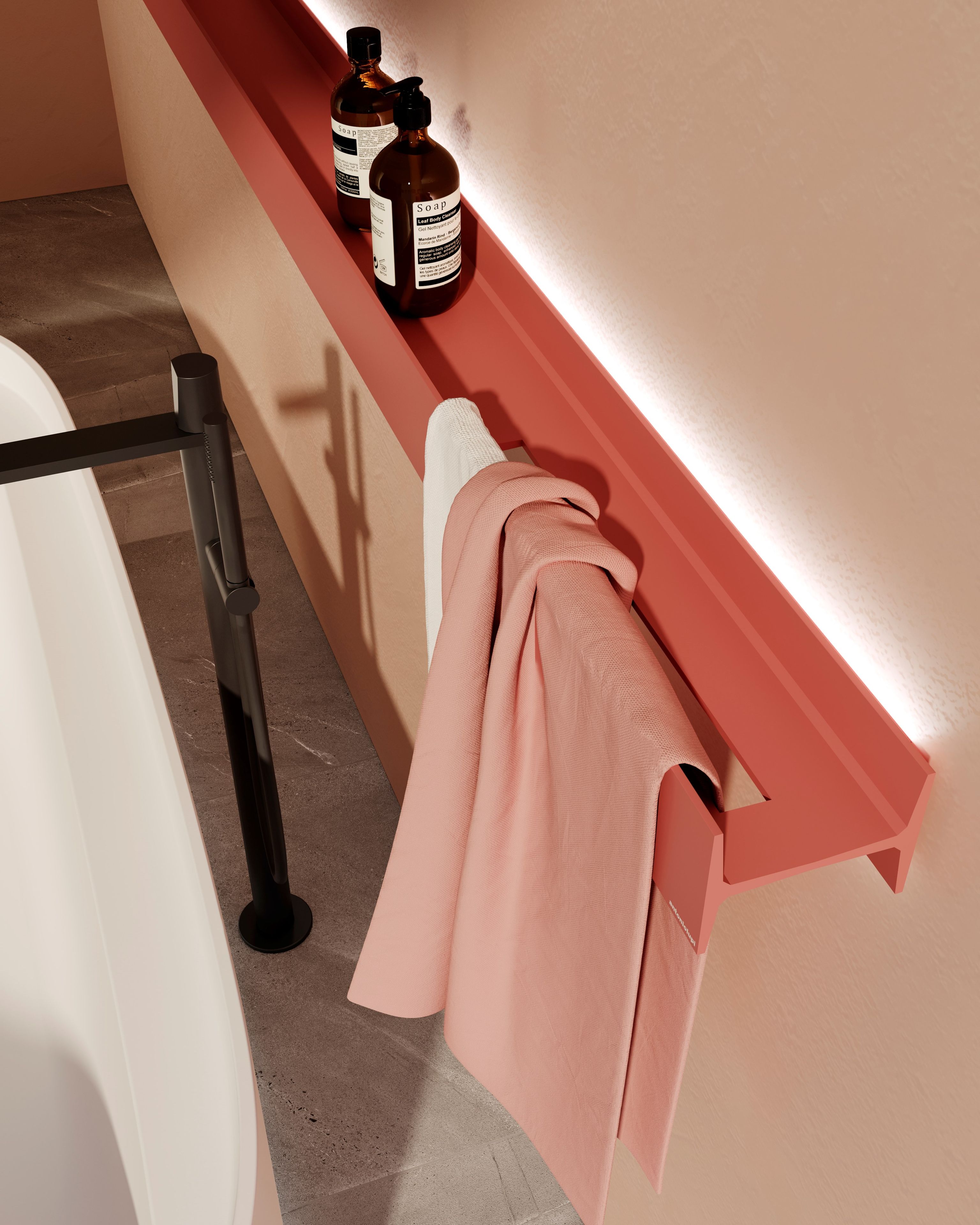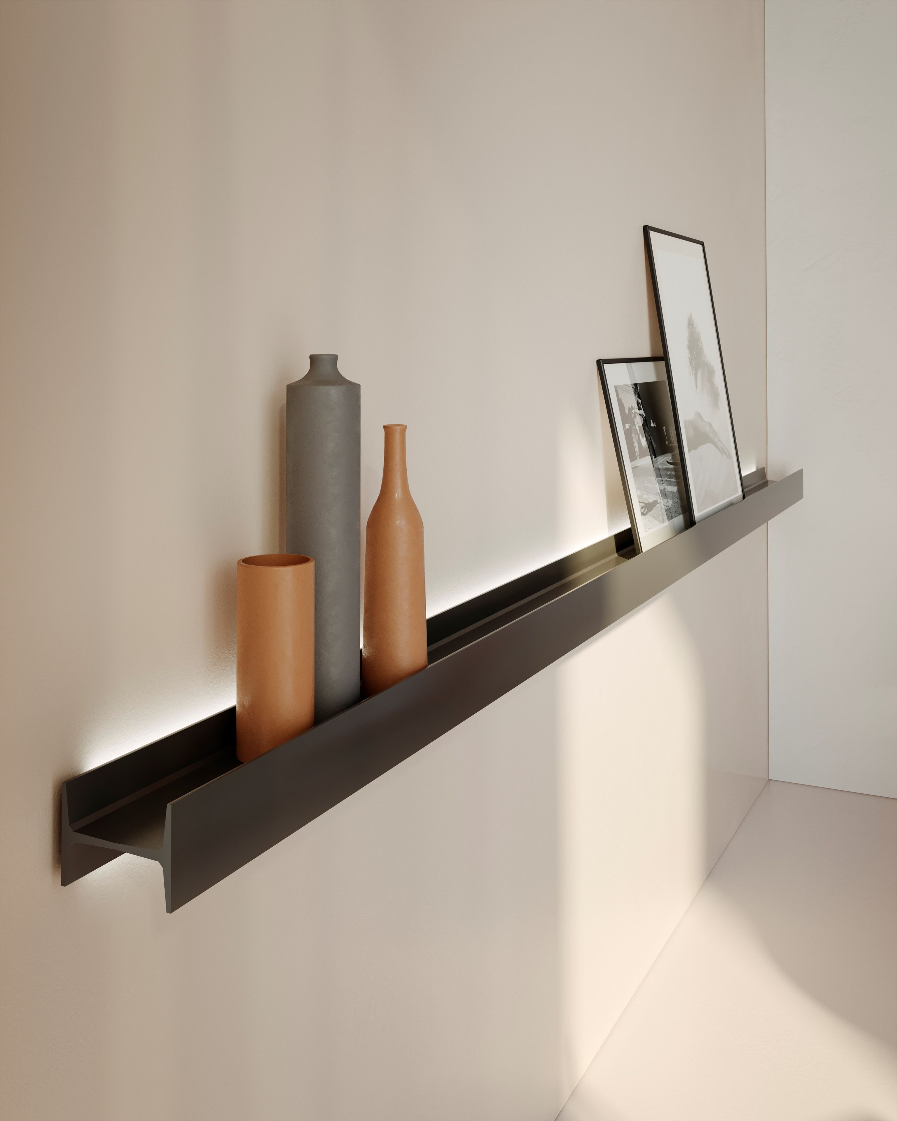 Это алюминиевая настенная полка, вдохновлённая профилями H‑балок, используемых в архитектуре — переведённая в минималистичный формат бытового аксессуара
