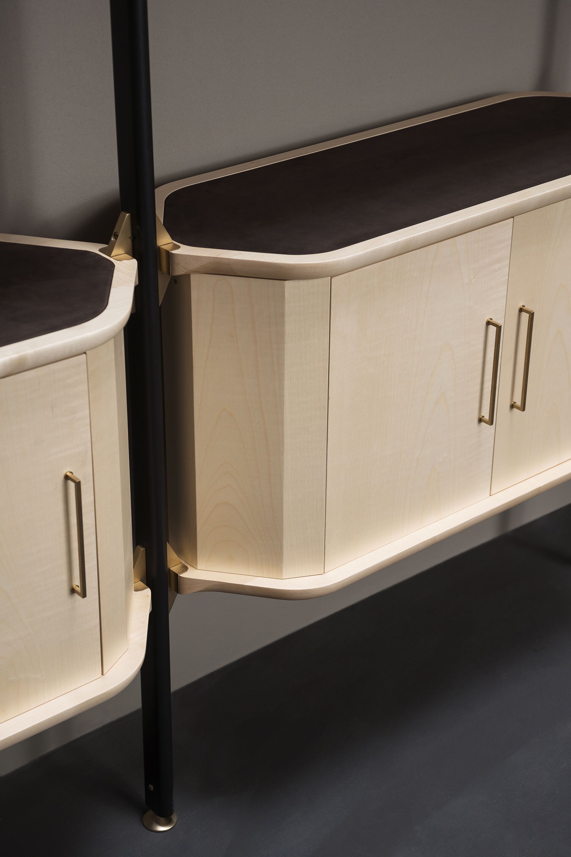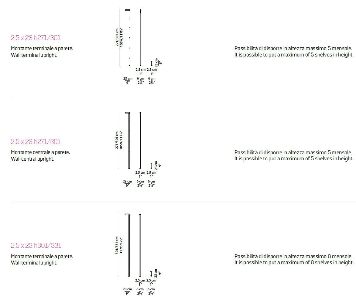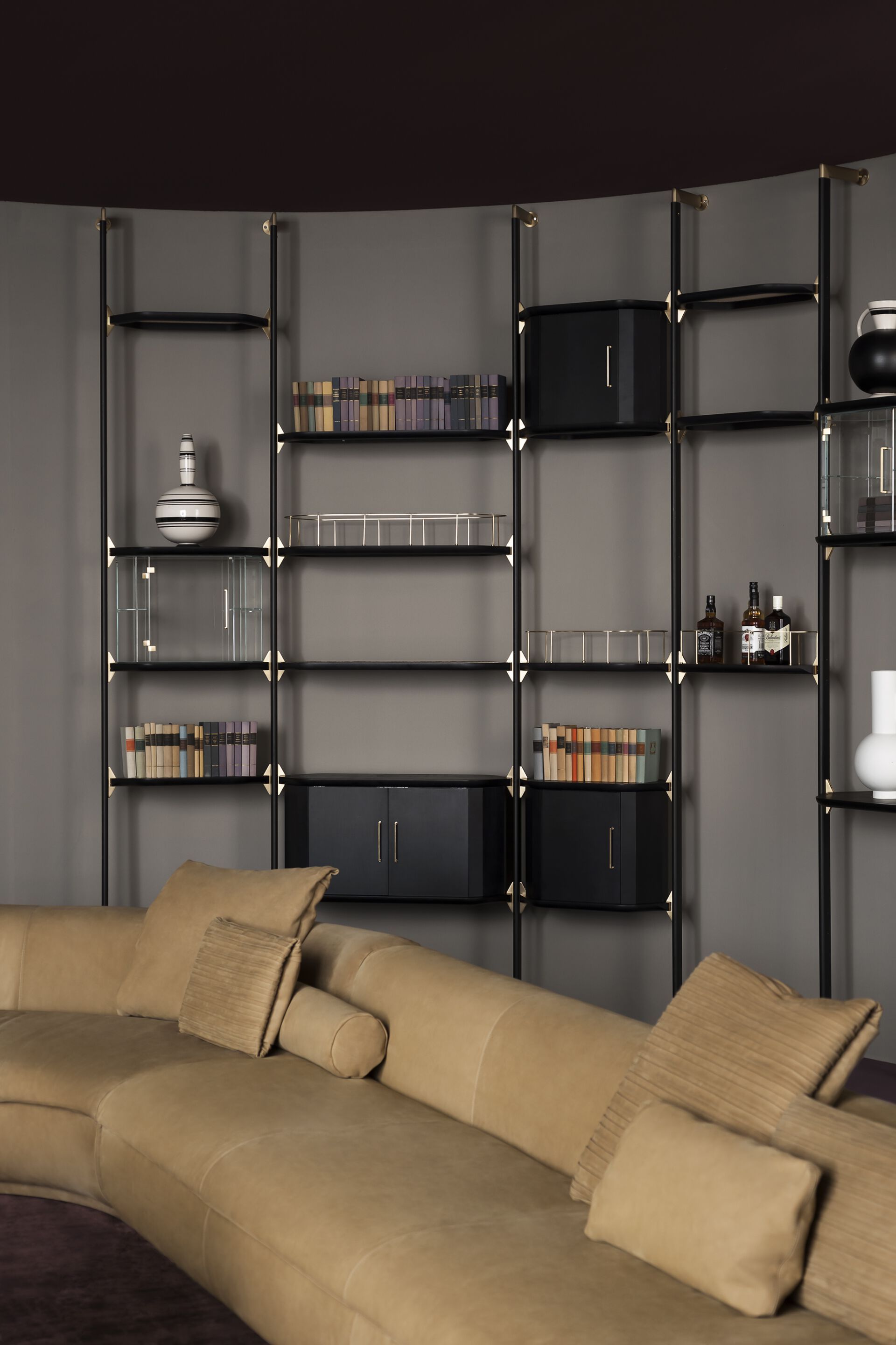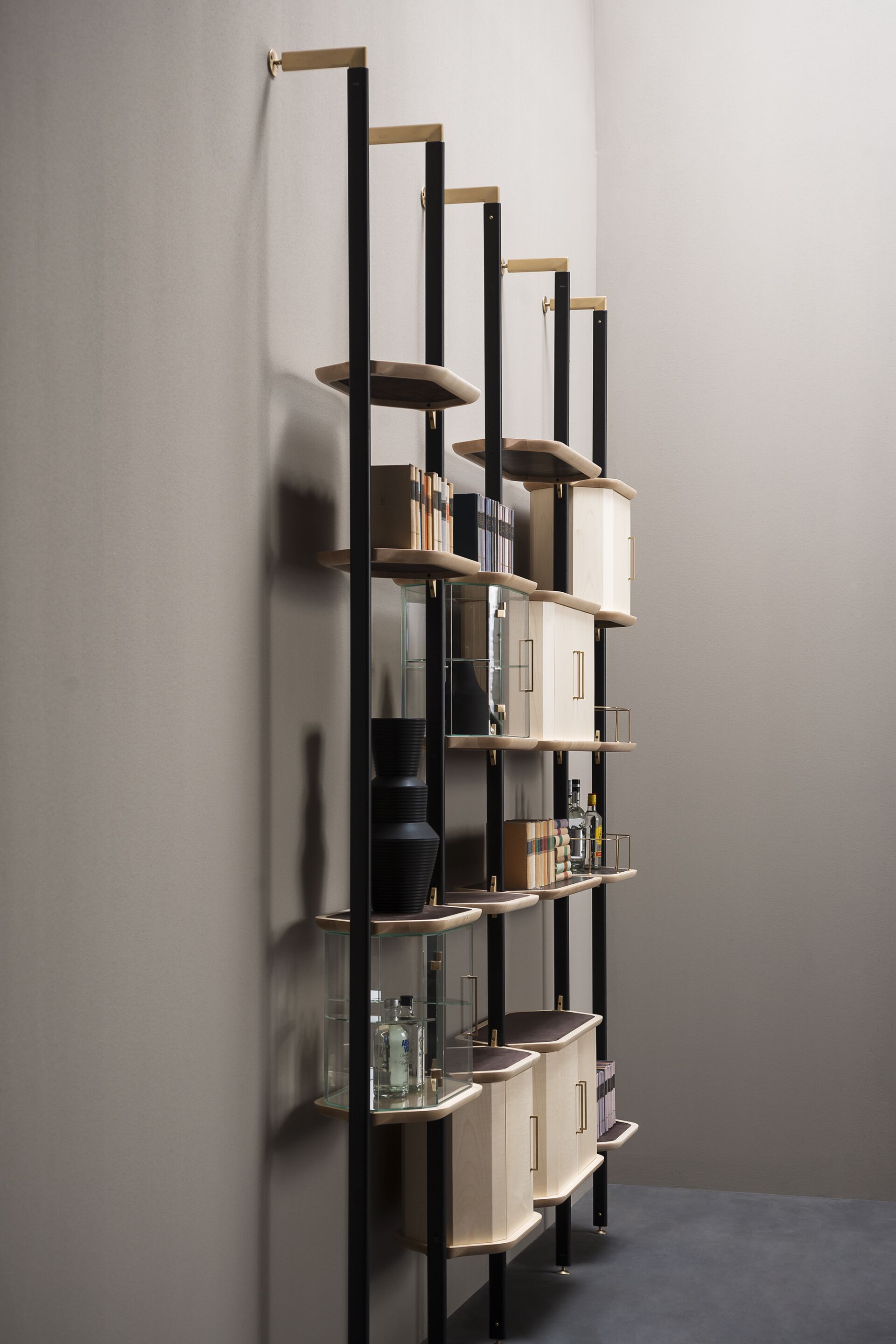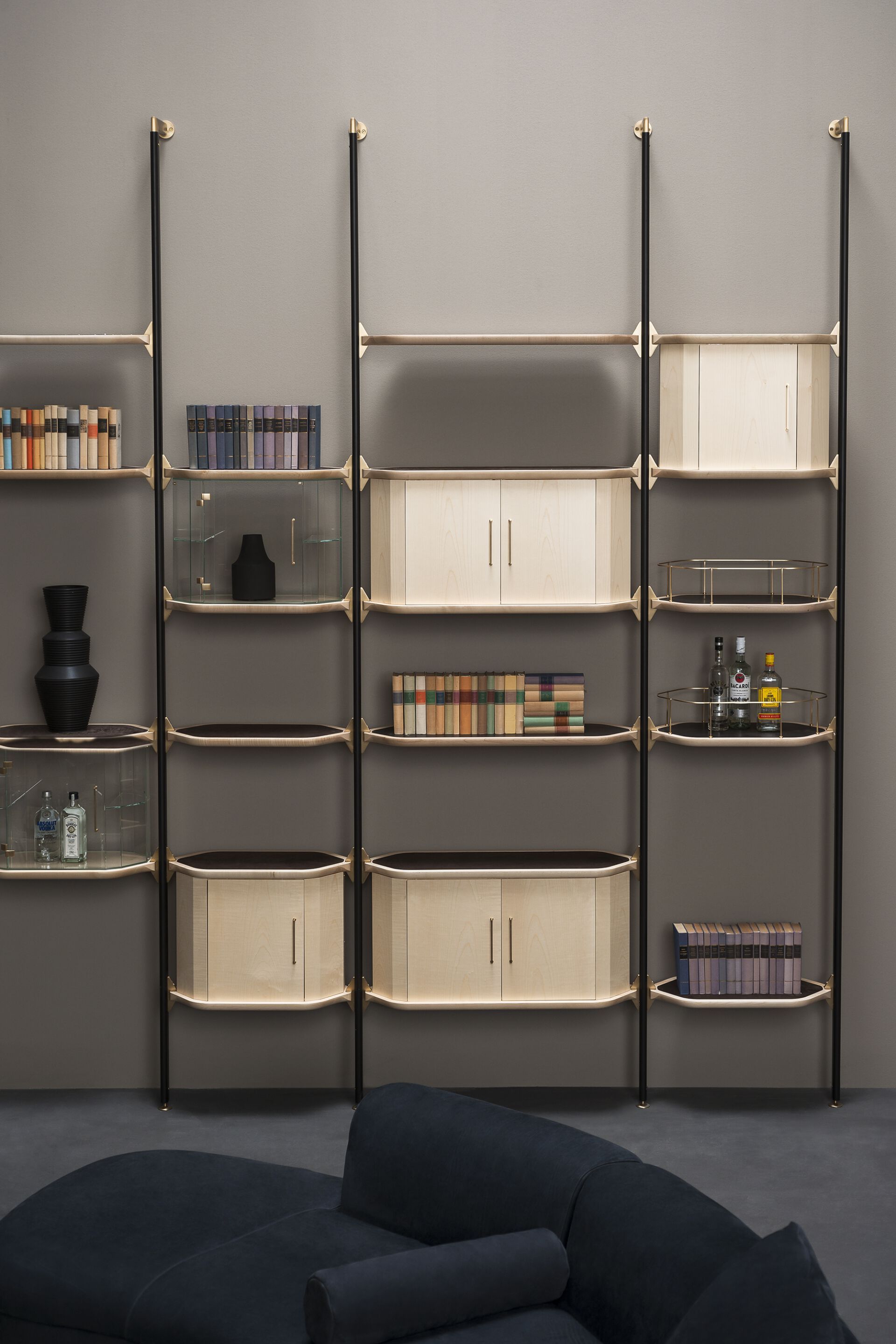 Libelle — модульный книжный стеллаж с конструкцией из чёрного алюминия. Крепится к потолку или стене с помощью латунных штифтов. Полки — из чёрного или светлого клёна, с отделкой из кожи или ротанга. Хранение — из закалённого стекла (6 мм) или шпонированной фанеры. Верх и основание — из массива клёна с кожаной отделкой. Ручки и крепления — из сатинированной латуни. Возможно крепление выше 376 см с дополнительными элементами.