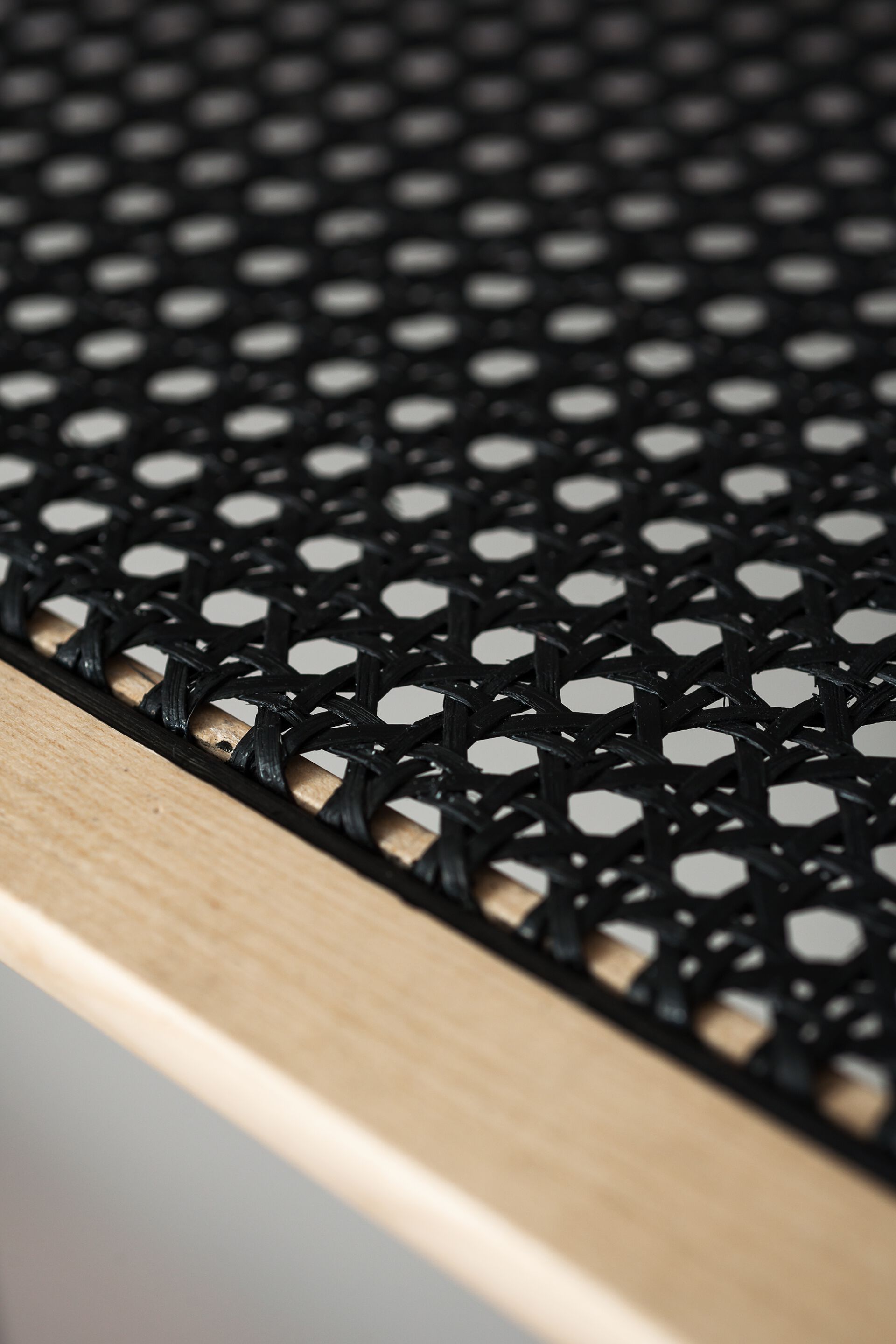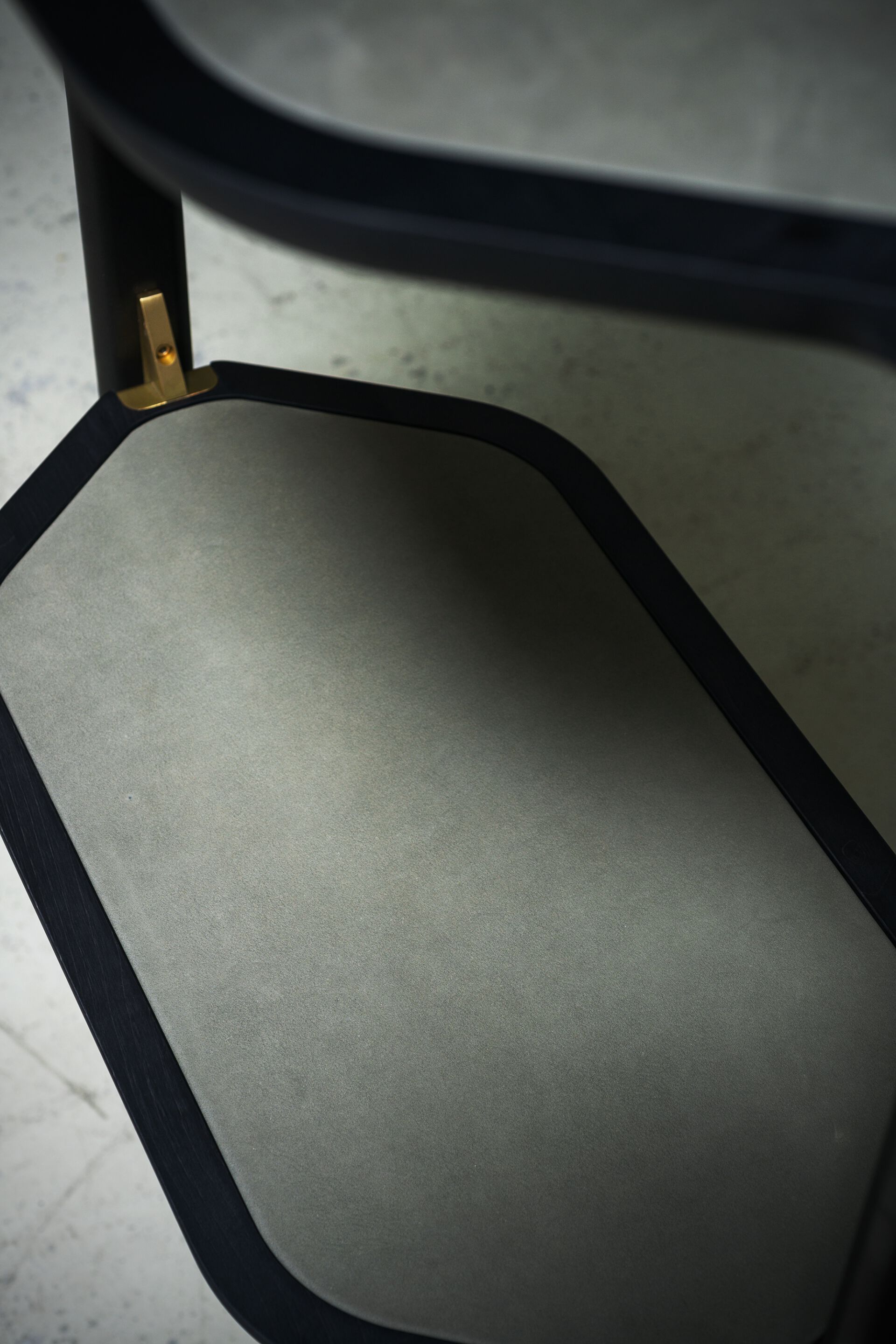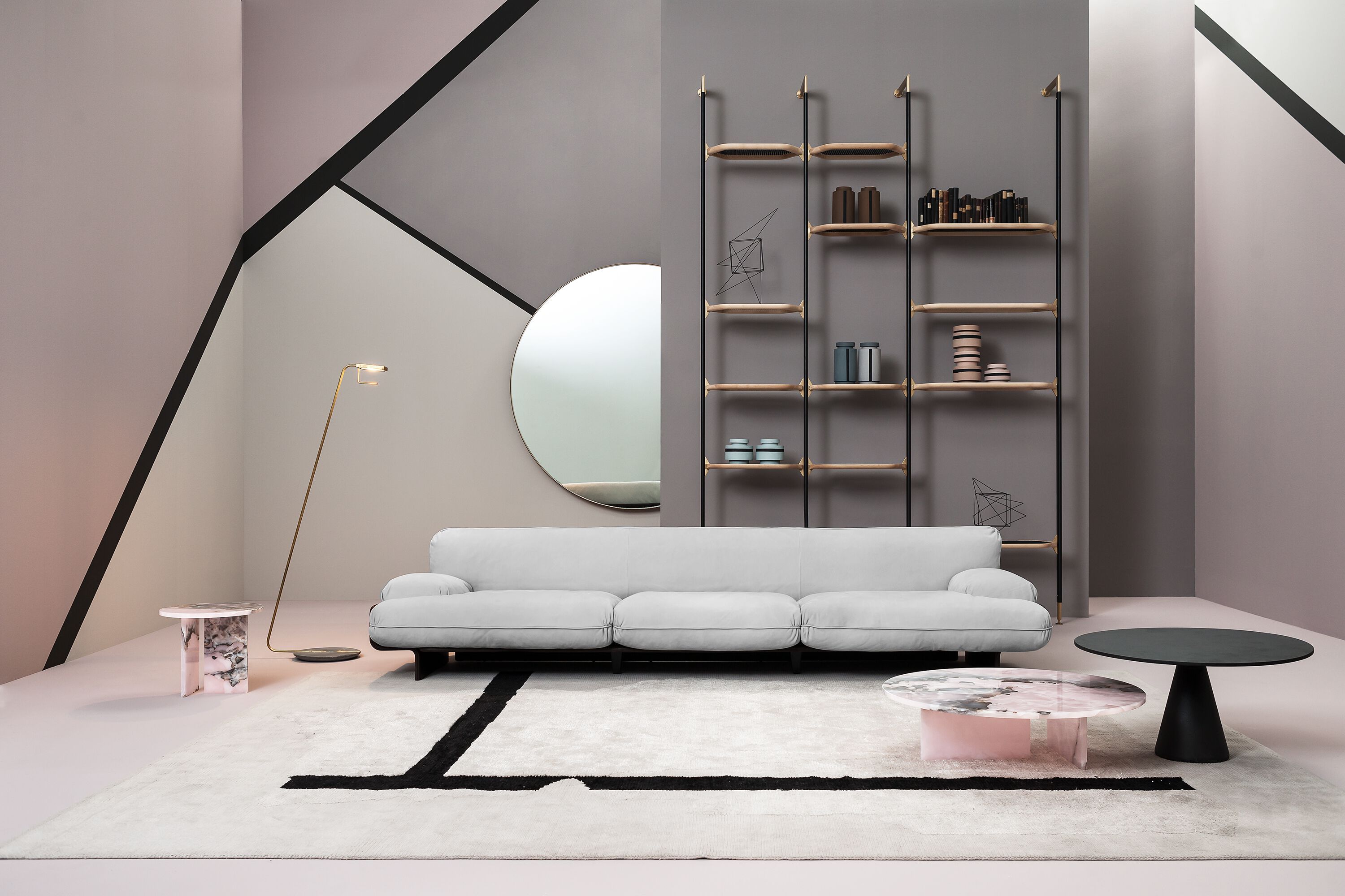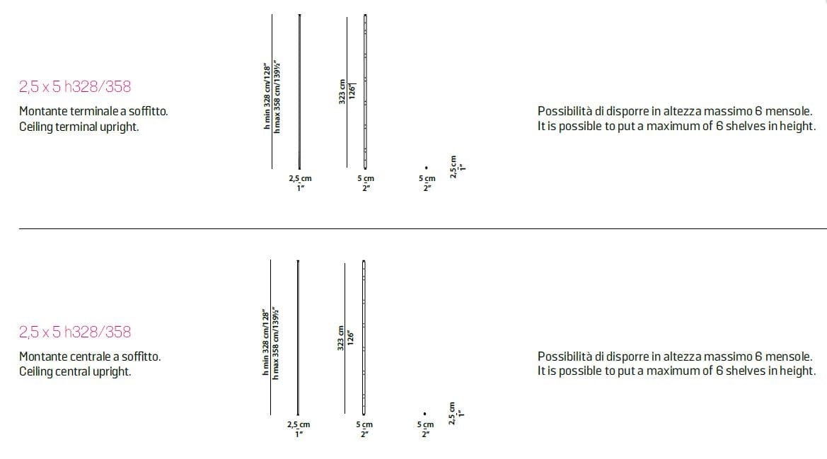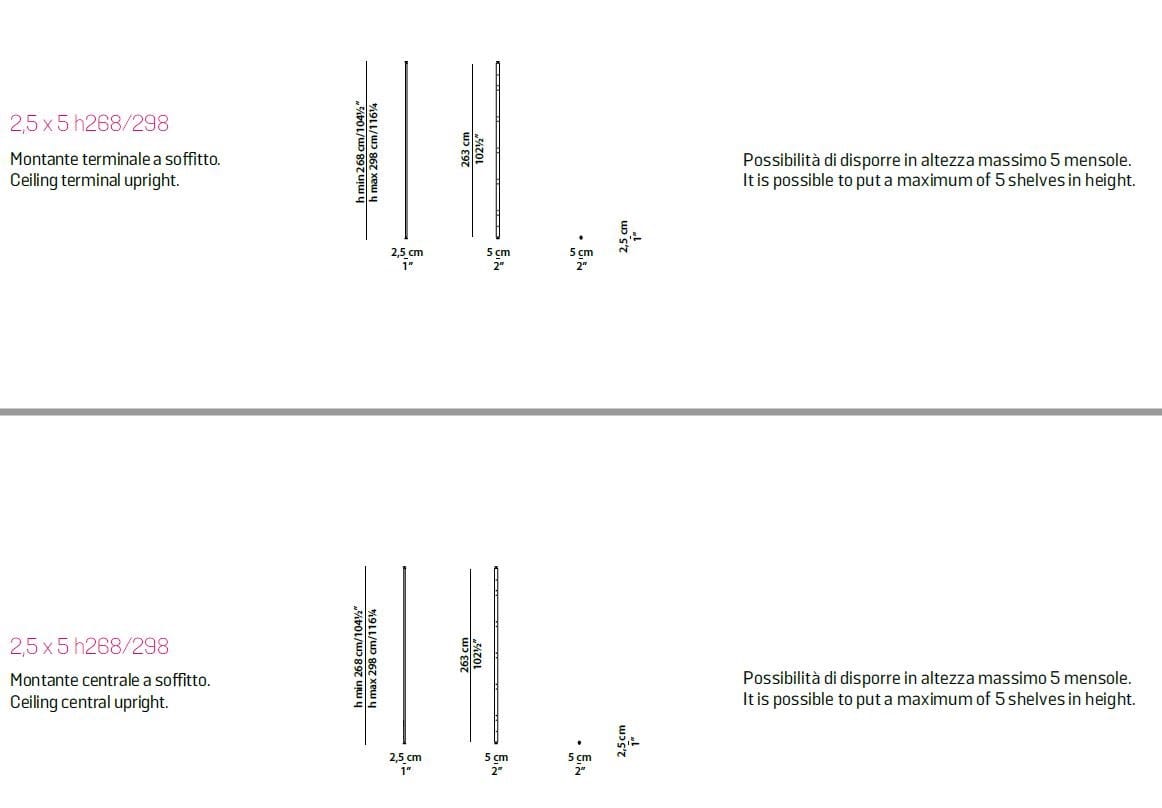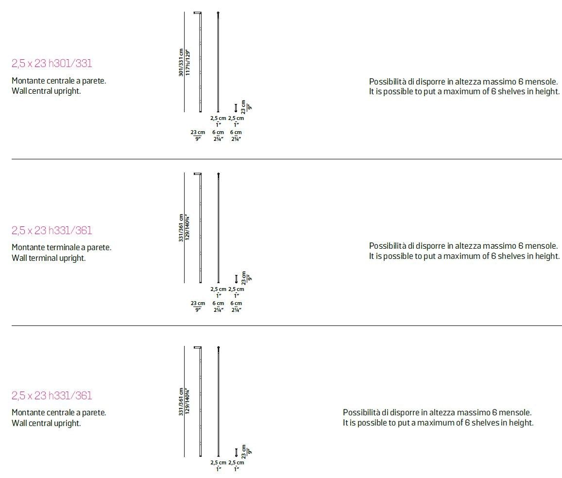 Libelle — модульный книжный стеллаж с конструкцией из чёрного алюминия. Крепится к потолку или стене с помощью латунных штифтов. Полки — из чёрного или светлого клёна, с отделкой из кожи или ротанга. Хранение — из закалённого стекла (6 мм) или шпонированной фанеры. Верх и основание — из массива клёна с кожаной отделкой. Ручки и крепления — из сатинированной латуни. Возможно крепление выше 376 см с дополнительными элементами.