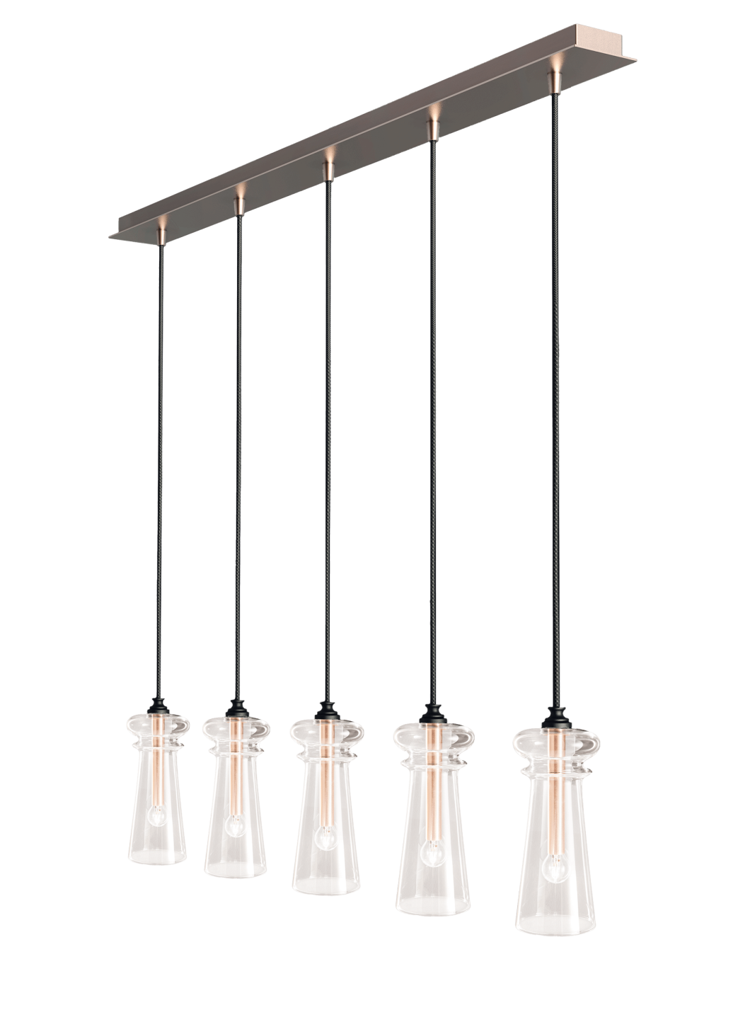 Подвесной светильник с прозрачным стеклом и металлической конструкцией с отделкой из матовой меди, матового черного, светло-золотого или никелевого цвета.