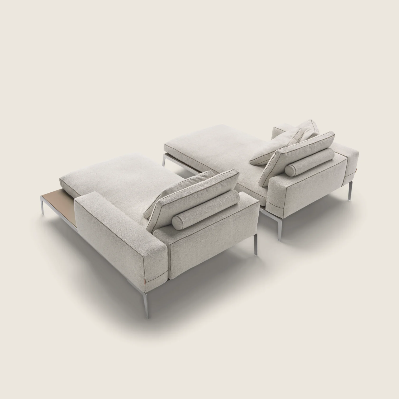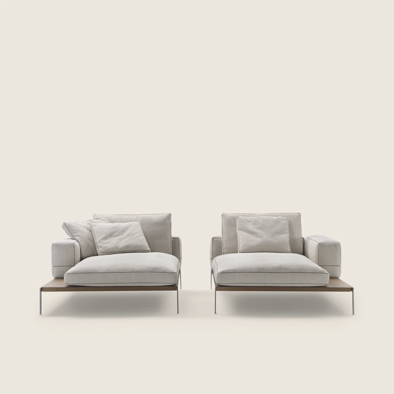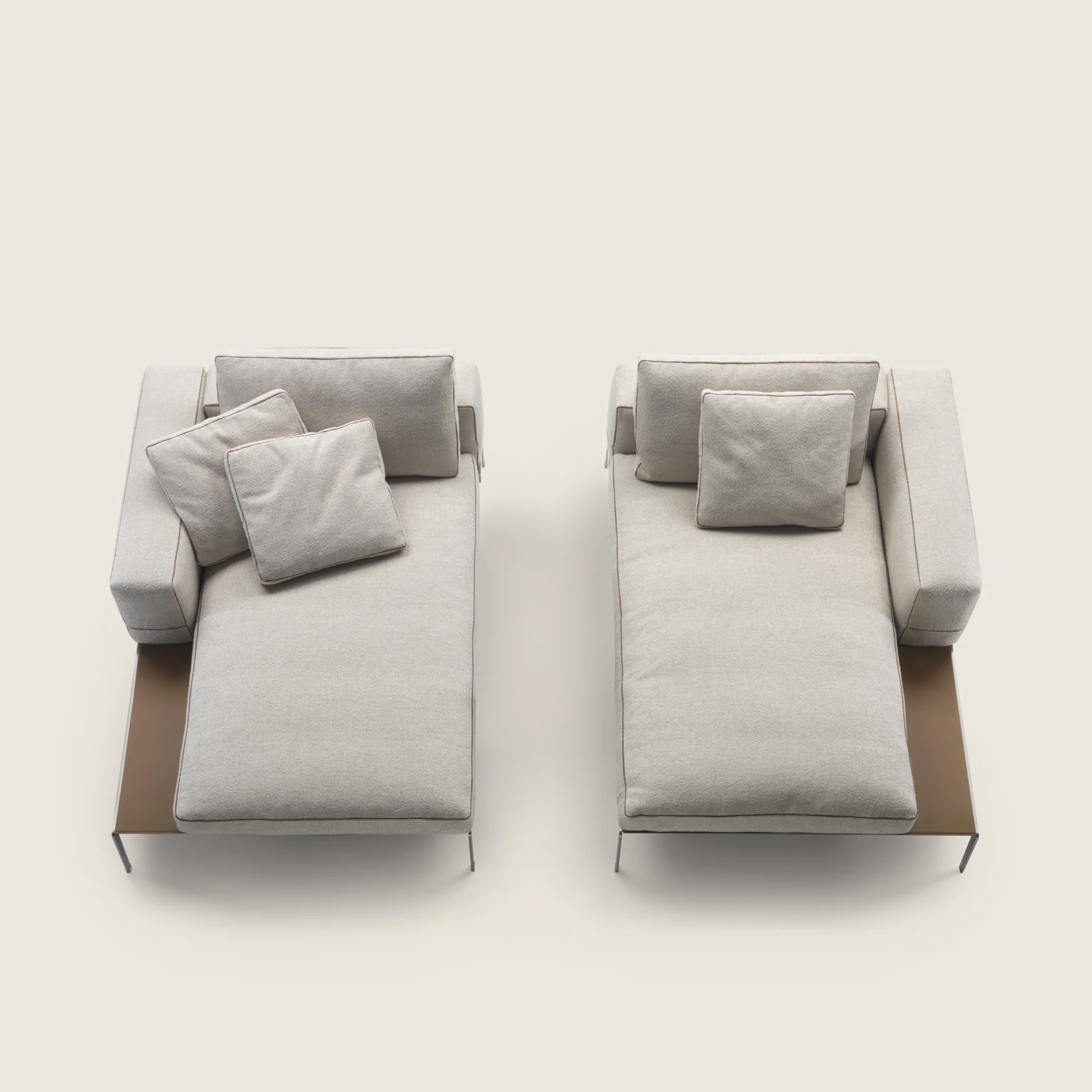 Конструкция: Шезлонг Lifesteel обладает элегантным каркасом, обтянутым кожей, который поддерживает единую подушку сиденья, наполненную гусиным пухом с вставкой из материала, сохраняющего форму. Для обеспечения идеальной поддержки за спинными подушками размещён валик, наполненный дакроном. Шезлонг доступен в двух размерах и украшен деталями, такими как кант из гросгрейна, который может соответствовать обивке дивана или быть контрастного цвета .