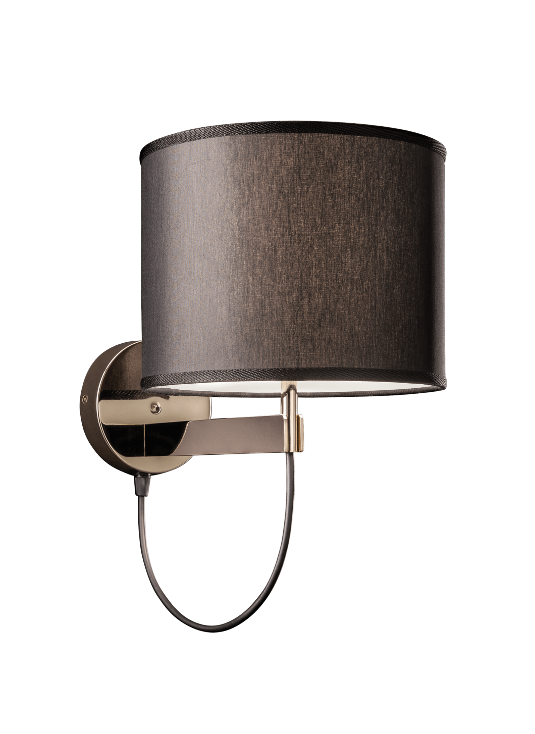 Настенный светильник из металла со светло-золотой отделкой и тканевым рассеивателем.
