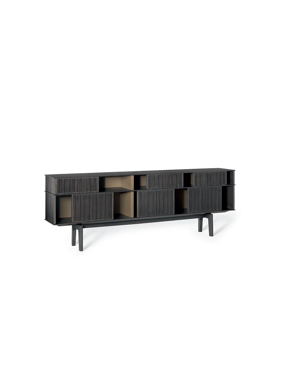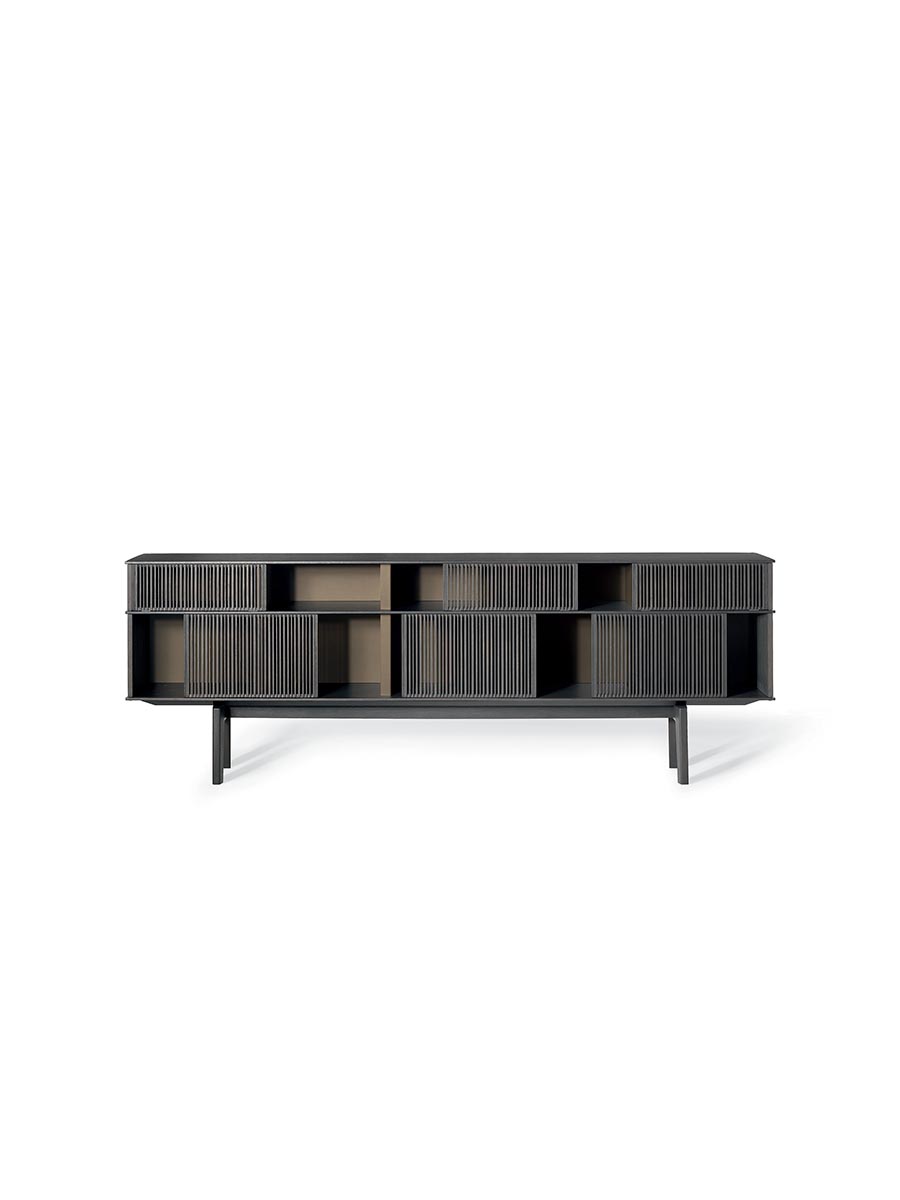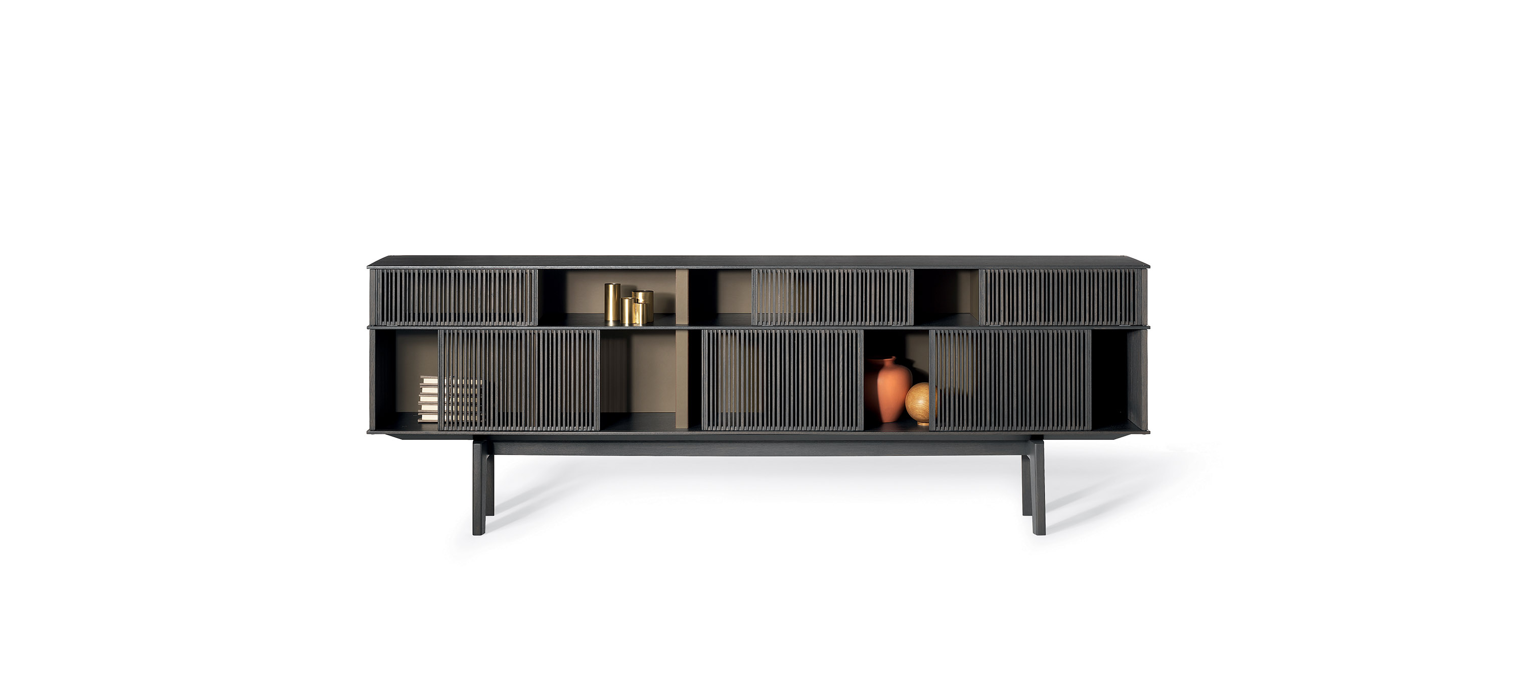 Горизонтальные элементы, по которым скользят решётки, изготовлены из ламината высокого давления (HPL), материала, который даже в очень тонких слоях гарантирует устойчивость и прочность, с натуральным дубовым шпоном в матовой свинцовой отделке. Вертикальные стойки, обтянутые кожей, расположены на равном расстоянии друг от друга, чтобы придать предмету мебели ритм и подчеркнуть свободный эффект решёток. Каждая отдельная решётка – это кропотливый элемент корпусной работы. Изготовленные из массива дуба, они перемещаются по рельсам, вырезанным в полках, и оснащены пластиковыми направляющими для уменьшения трения. Прочные дубовые прутья нарезаются разной толщины и затем склеиваются вручную по отдельности. Боковые стороны конструкции закрыты неподвижными решётками из массива дуба. Шкафы и книжные шкафы Lloyd доступны в двух вариантах: настенном и отдельно стоящем. Последний имеет раздвижные решётки с обеих сторон (спереди и сзади). Пристенный вариант оснащен раздвижными решетками только спереди, а задняя часть, примыкающая к стене, закрыта матово-черной лакированной панелью МДФ, которая внутри может быть обтянута шорно-седельной кожей. Книжные шкафы и стеллажи Lloyd оснащены стальными ножками. Внешние ножки спереди имеют цвет оружейного металла, а центральные ножки, расположенные дальше в глубине, покрыты матово-черным лаком.