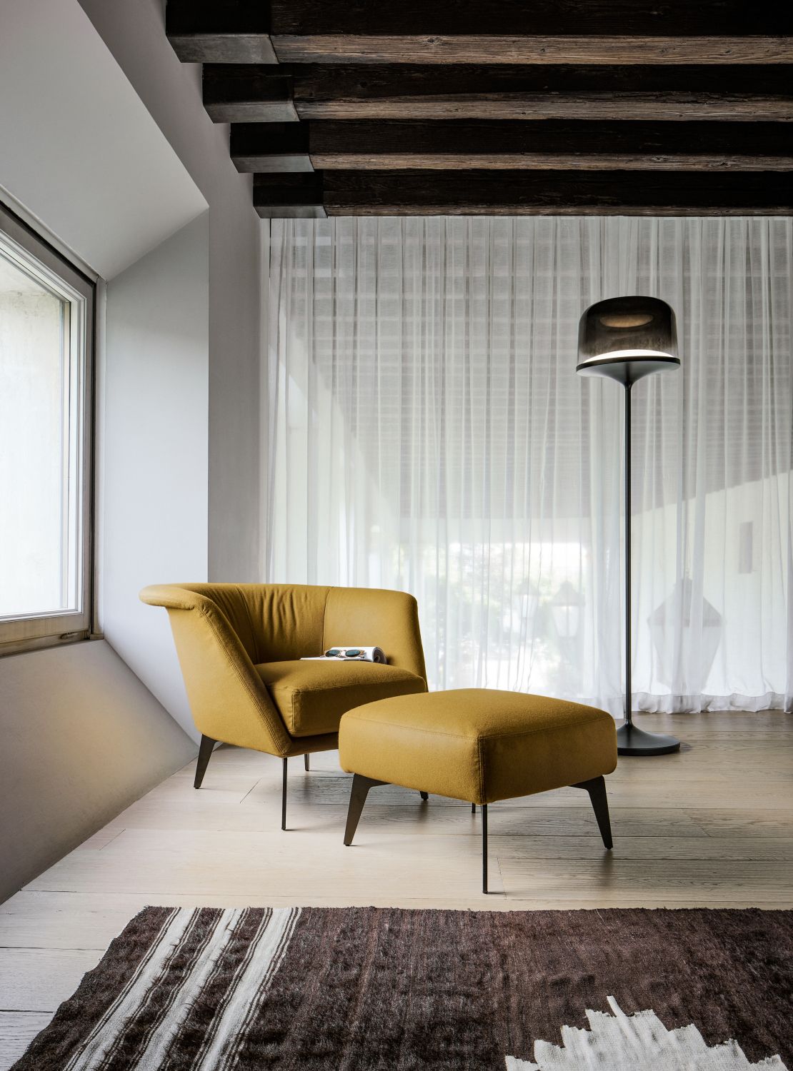 Серия мягкой мебели Lovy, выполненная в оригинальном и утонченном стиле, представляет собой современное переосмысление классики 1950-х и 1960-х годов. Включая динамичный пуф, который идеально сочетается с диваном и креслом, он также может быть использован как самостоятельный элемент, например, в роли журнального столика. Дизайн Серджио Бичего включает два типа пуфов с круглой или квадратной формой, с высокой удобной подушкой и крестообразным металлическим каркасом, подчеркнутым четырьмя ножками. Съемный чехол из ткани доступен в различных цветах.