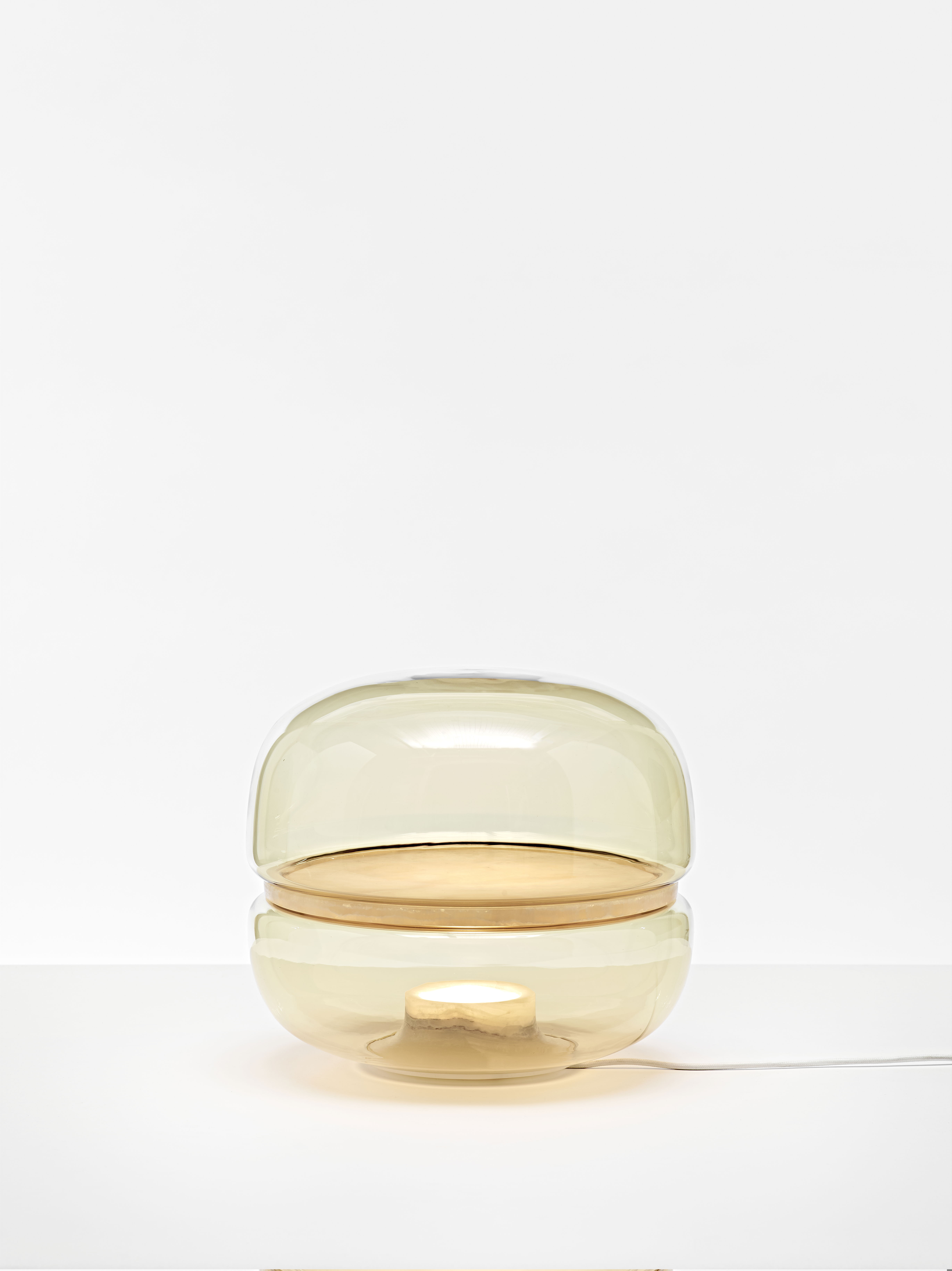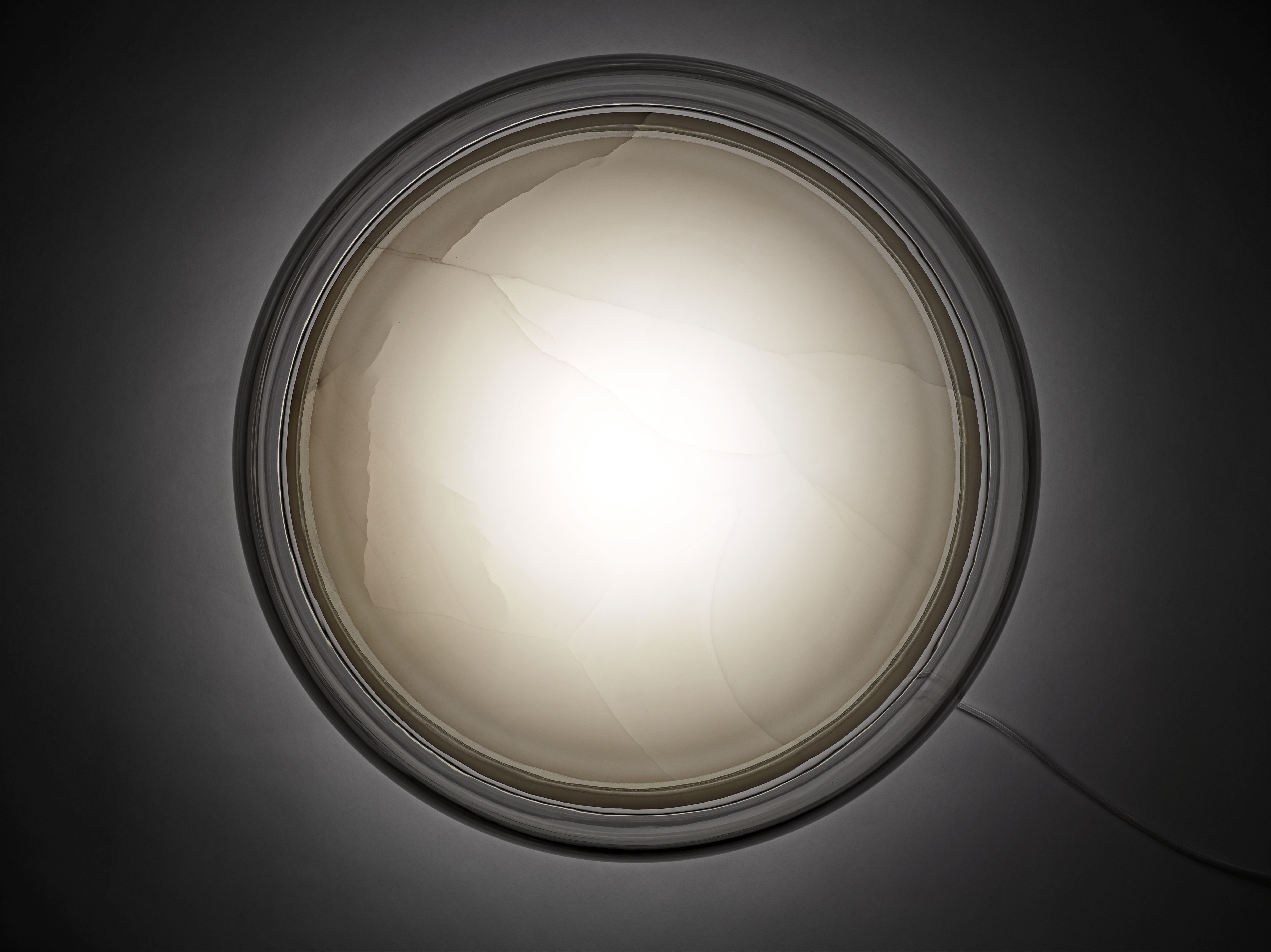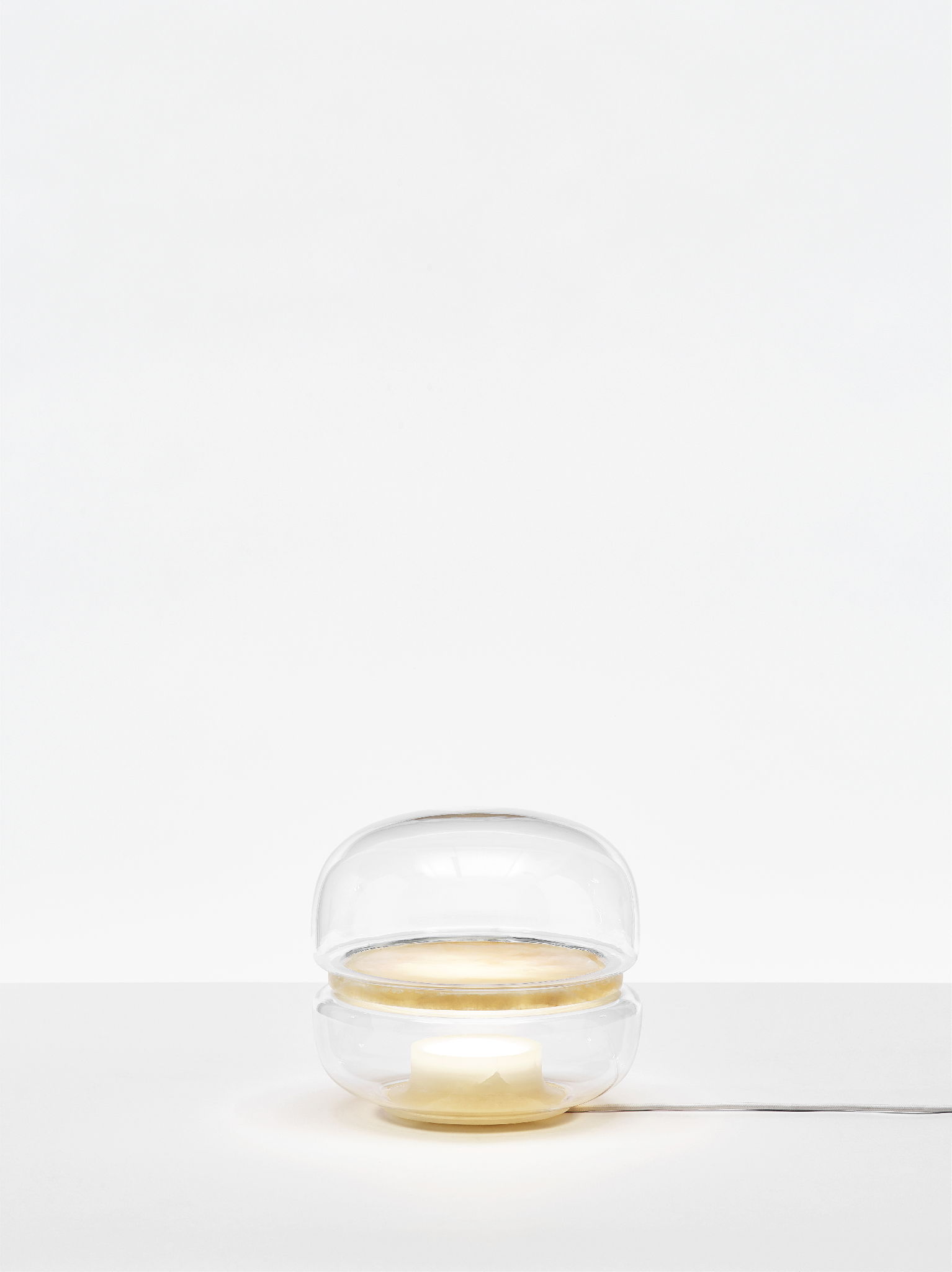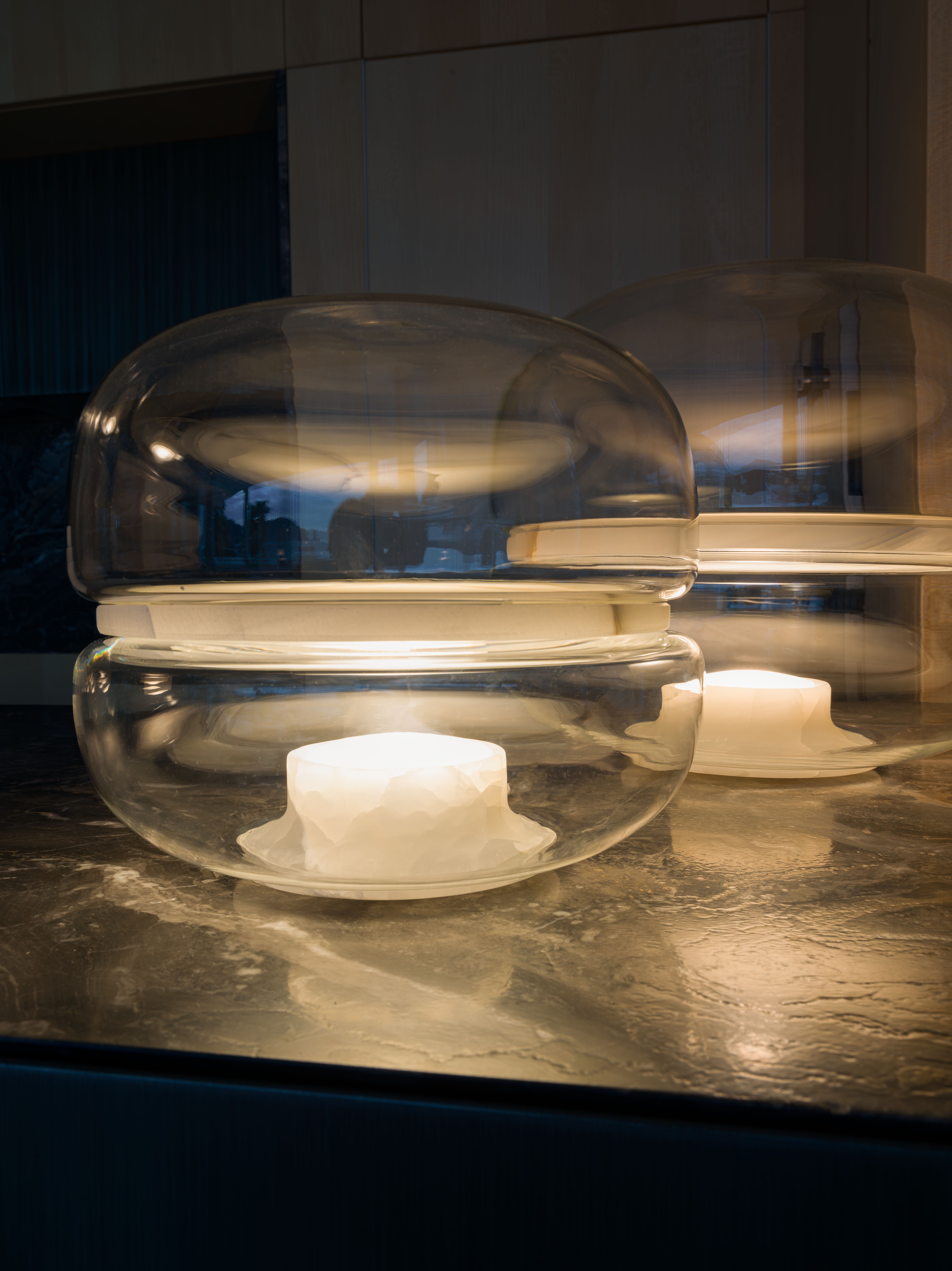 Настольный светильник Macaron воспевает красоту и сложные структуры кристаллического камня. Камень заключён между противоположными куполами из тонкого выдувного стекла, создавая эффект лунного пейзажа, парящего в собственном космосе. Световой источник излучает свет вверх от основания из оникса, подсвечивая извилистые жилки халцедона на центральной ониксовой пластине и формируя мягкий, завораживающий световой эффект.