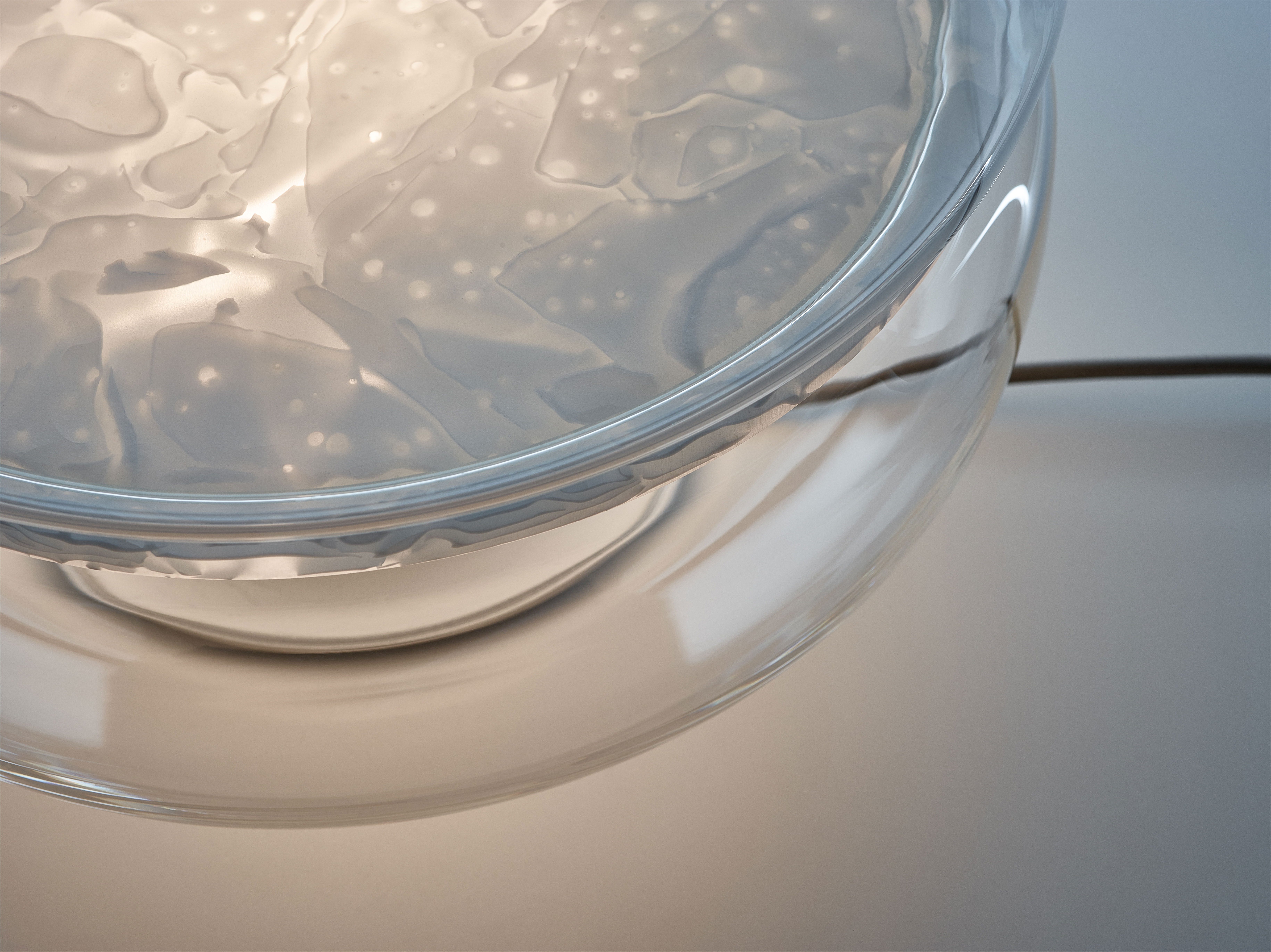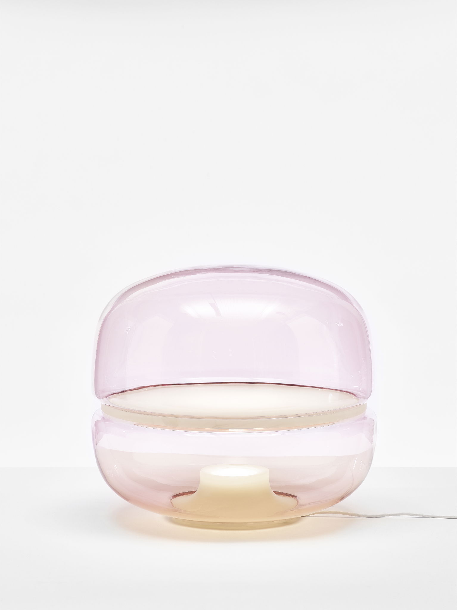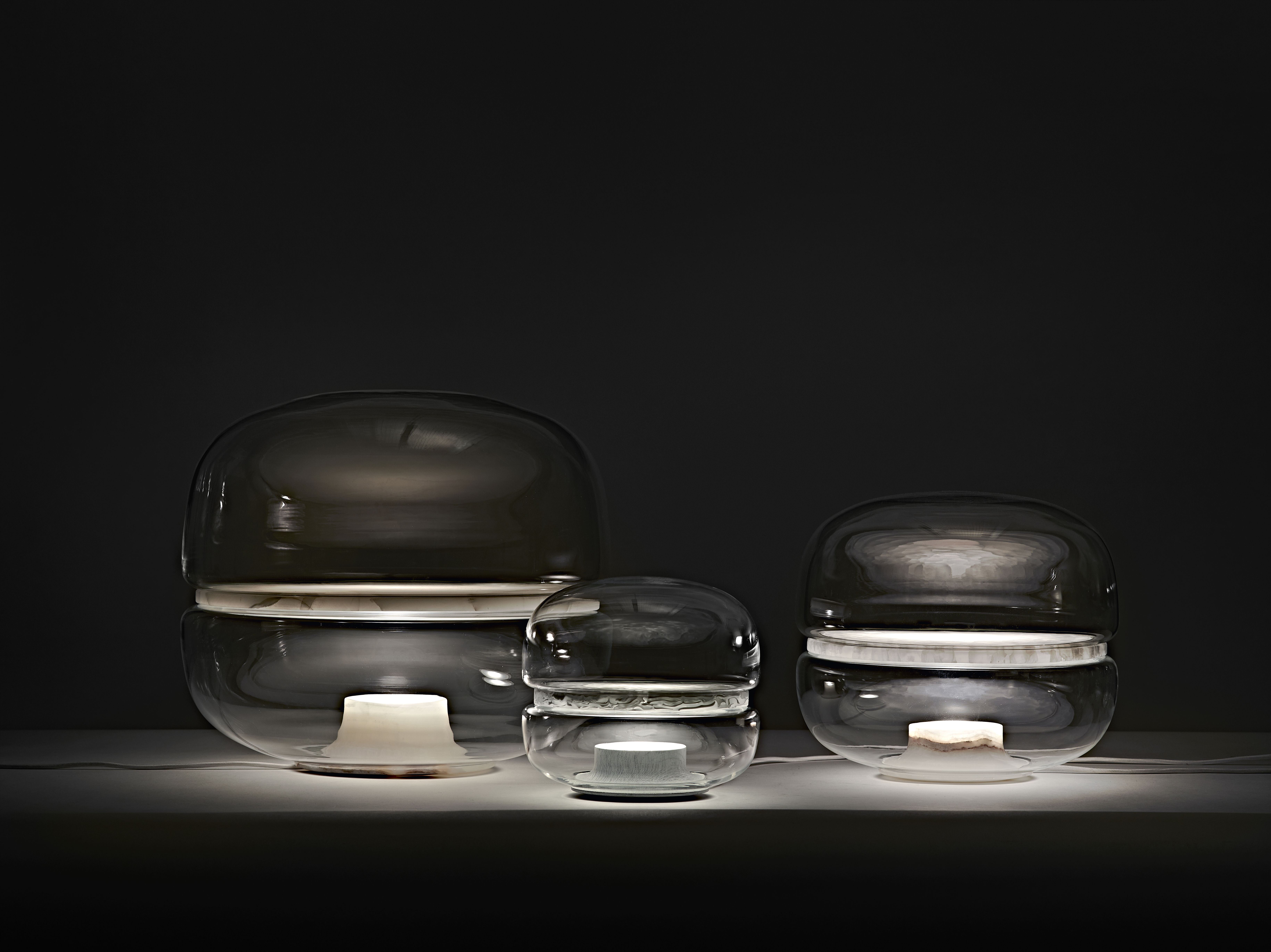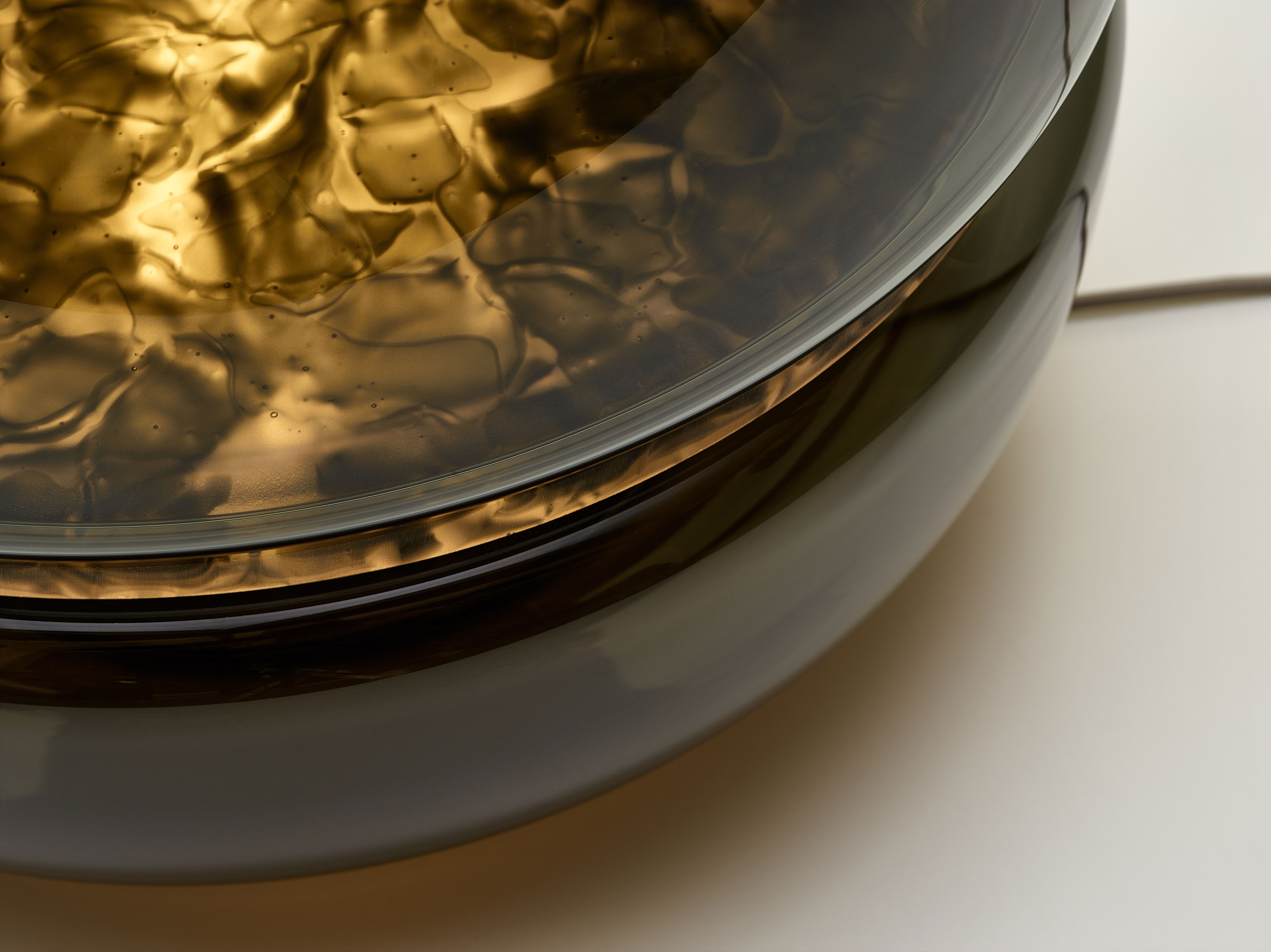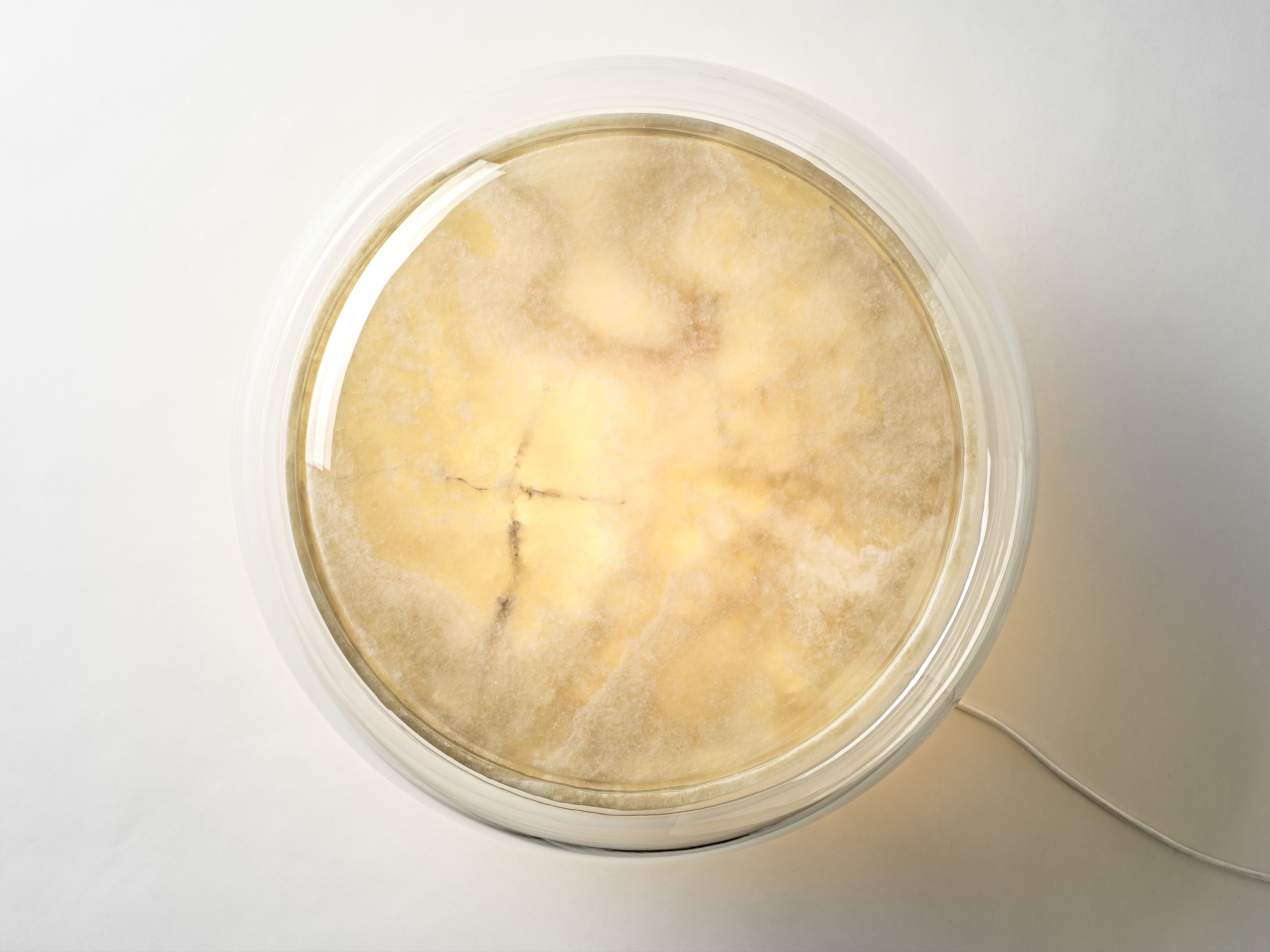 Настольный светильник Macaron воспевает красоту и сложные структуры кристаллического камня. Камень заключён между противоположными куполами из тонкого выдувного стекла, создавая эффект лунного пейзажа, парящего в собственном космосе. Световой источник излучает свет вверх от основания из оникса, подсвечивая извилистые жилки халцедона на центральной ониксовой пластине и формируя мягкий, завораживающий световой эффект.