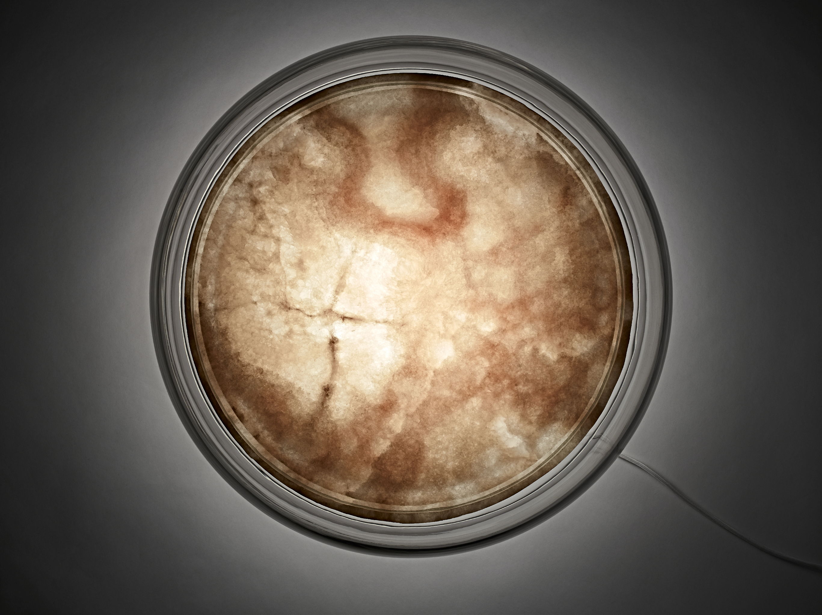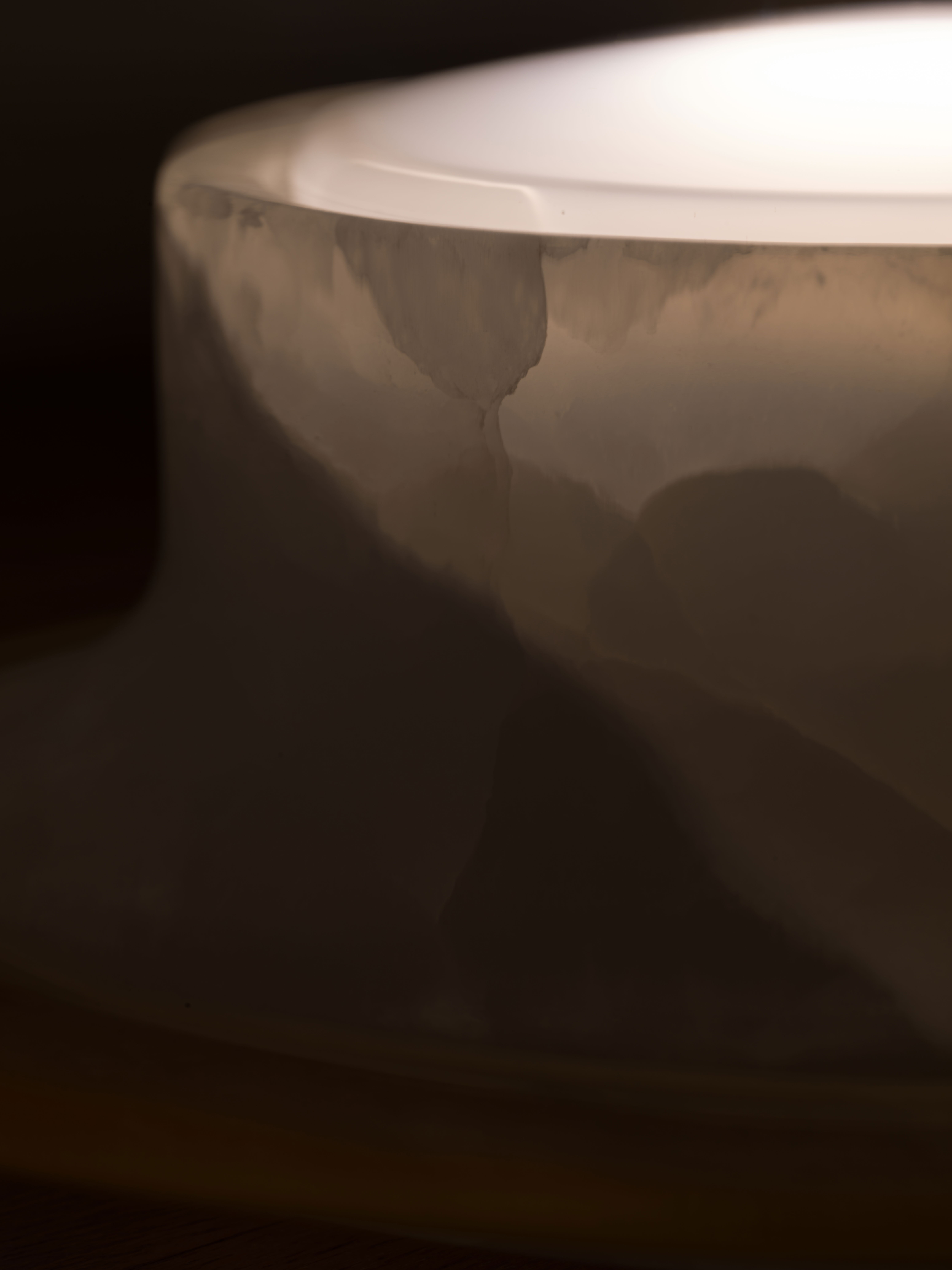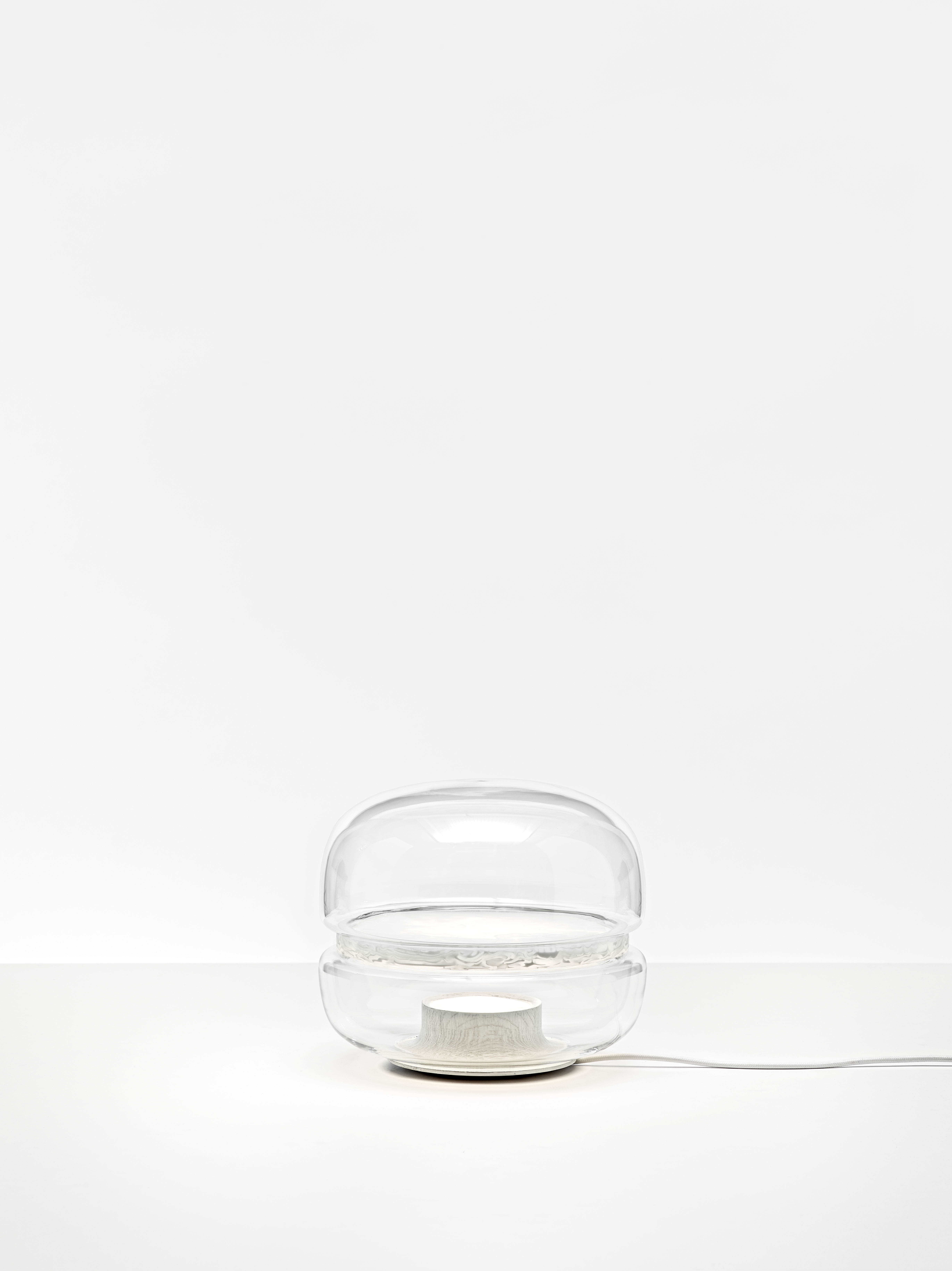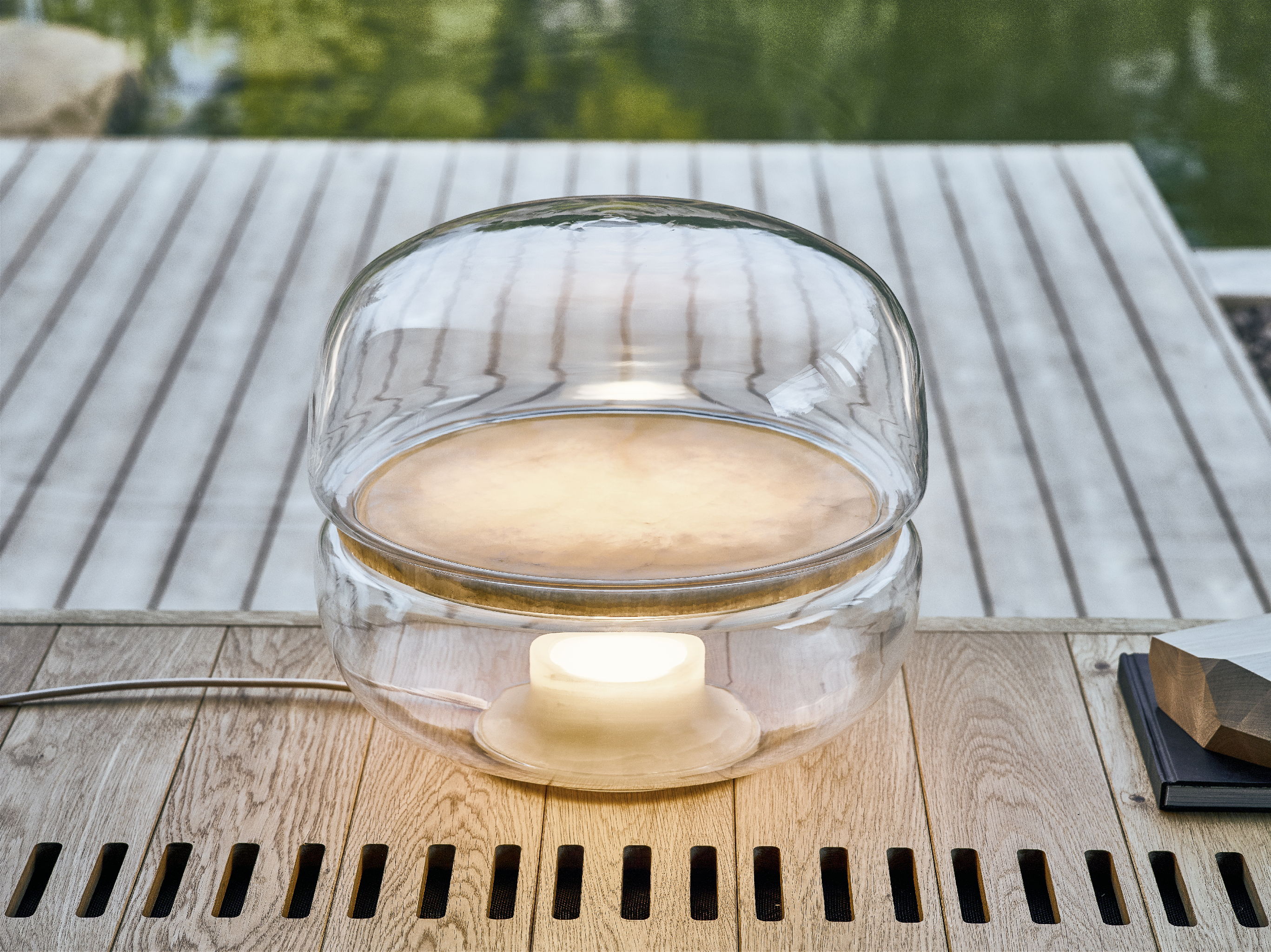 Настольный светильник Macaron воспевает красоту и сложные структуры кристаллического камня. Камень заключён между противоположными куполами из тонкого выдувного стекла, создавая эффект лунного пейзажа, парящего в собственном космосе. Световой источник излучает свет вверх от основания из оникса, подсвечивая извилистые жилки халцедона на центральной ониксовой пластине и формируя мягкий, завораживающий световой эффект.