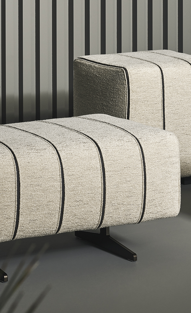 Коллекция Mark включает в себя стильные предметы для жилых и спальных зон, такие как пуфы и банкетки с уникальным металлическим основанием. Эти элементы мебели представляют собой настоящее искусство, в котором акцент сделан на исключительные детали, подчеркивающие мастерство исполнения. Узор в полоску с двойной строчкой добавляет изделию особую эстетику, позволяя играть как с однотонными, так и с контрастными цветовыми решениями. В коллекции Mark доступна обивка из ткани или натуральной кожи, а чехлы можно снять для удобства ухода.