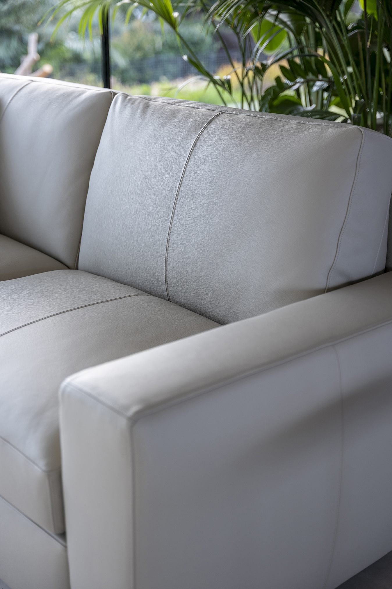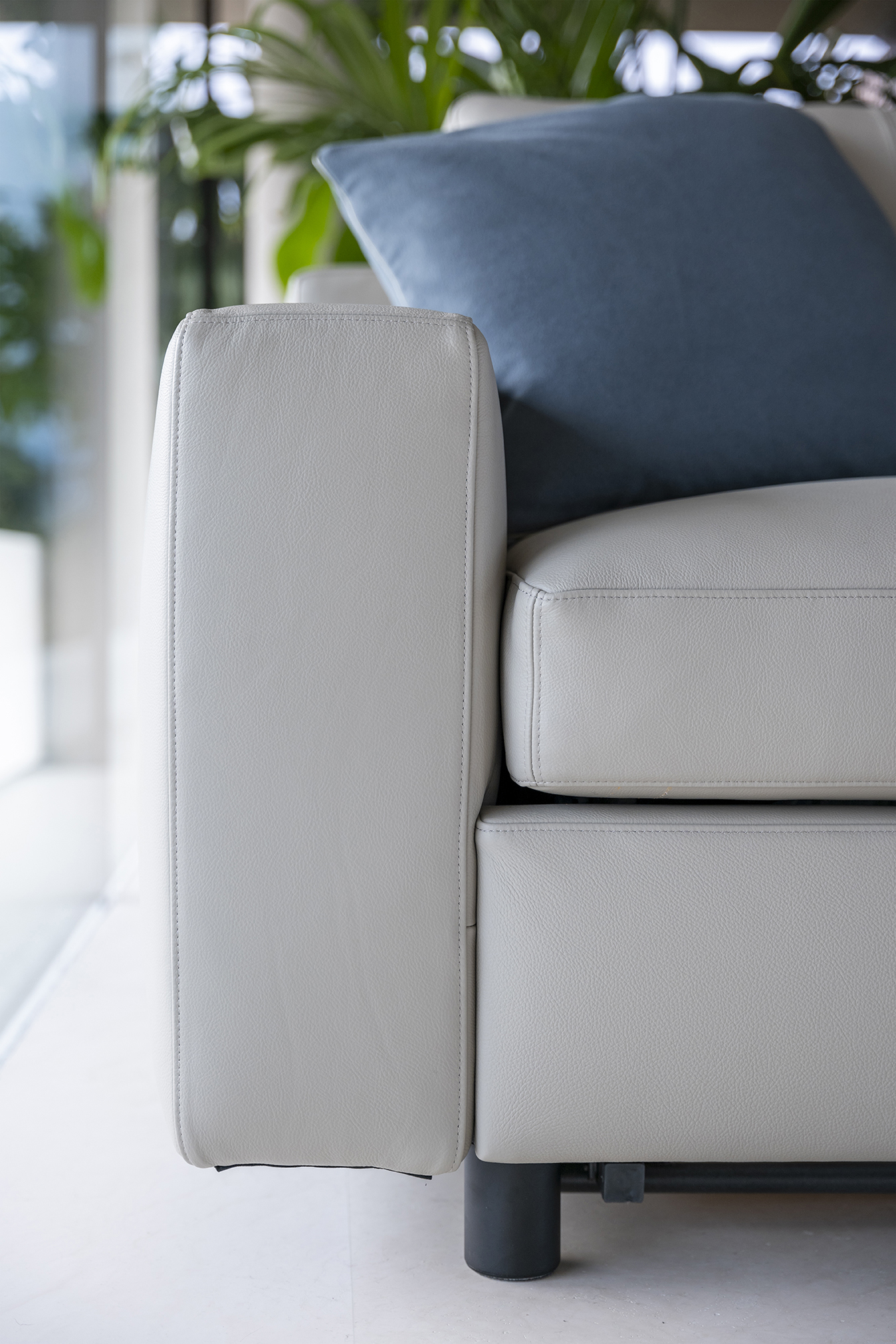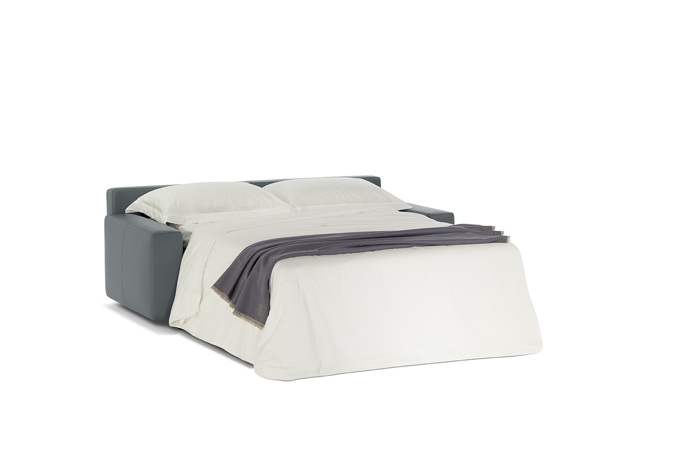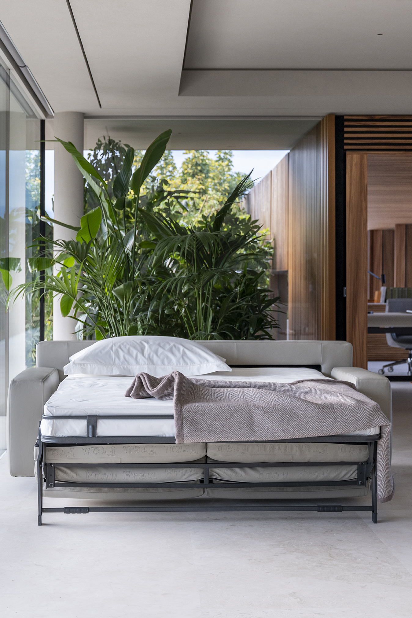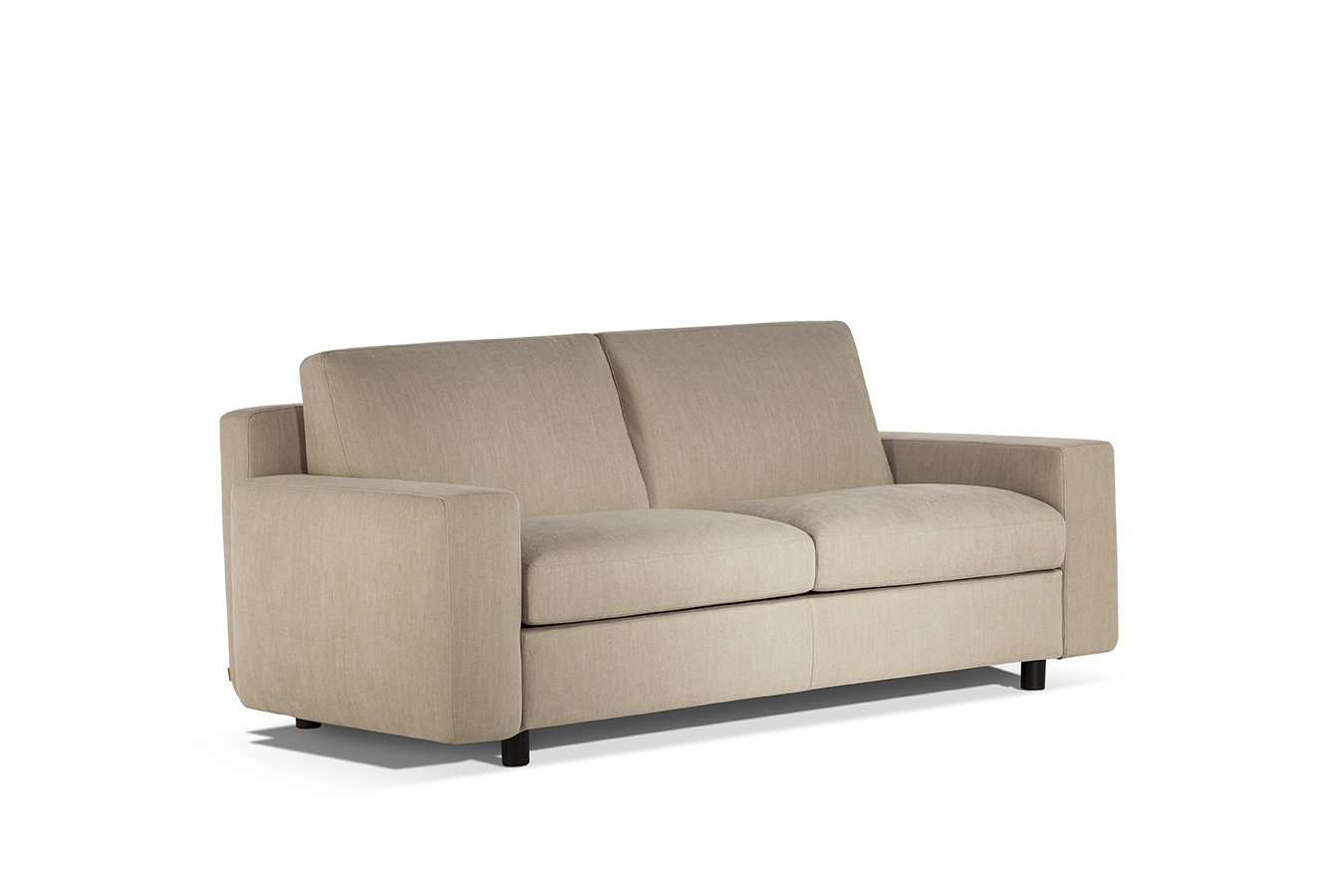 Диван-кровать интегрирован в большую модульную систему диванов, отличительной чертой которой является простота и минимализм. Технический механизм раскладывания не виден, поскольку он полностью скрыт в каркасе, что делает диван-кровать визуально идентичным большой двухместной версии.
