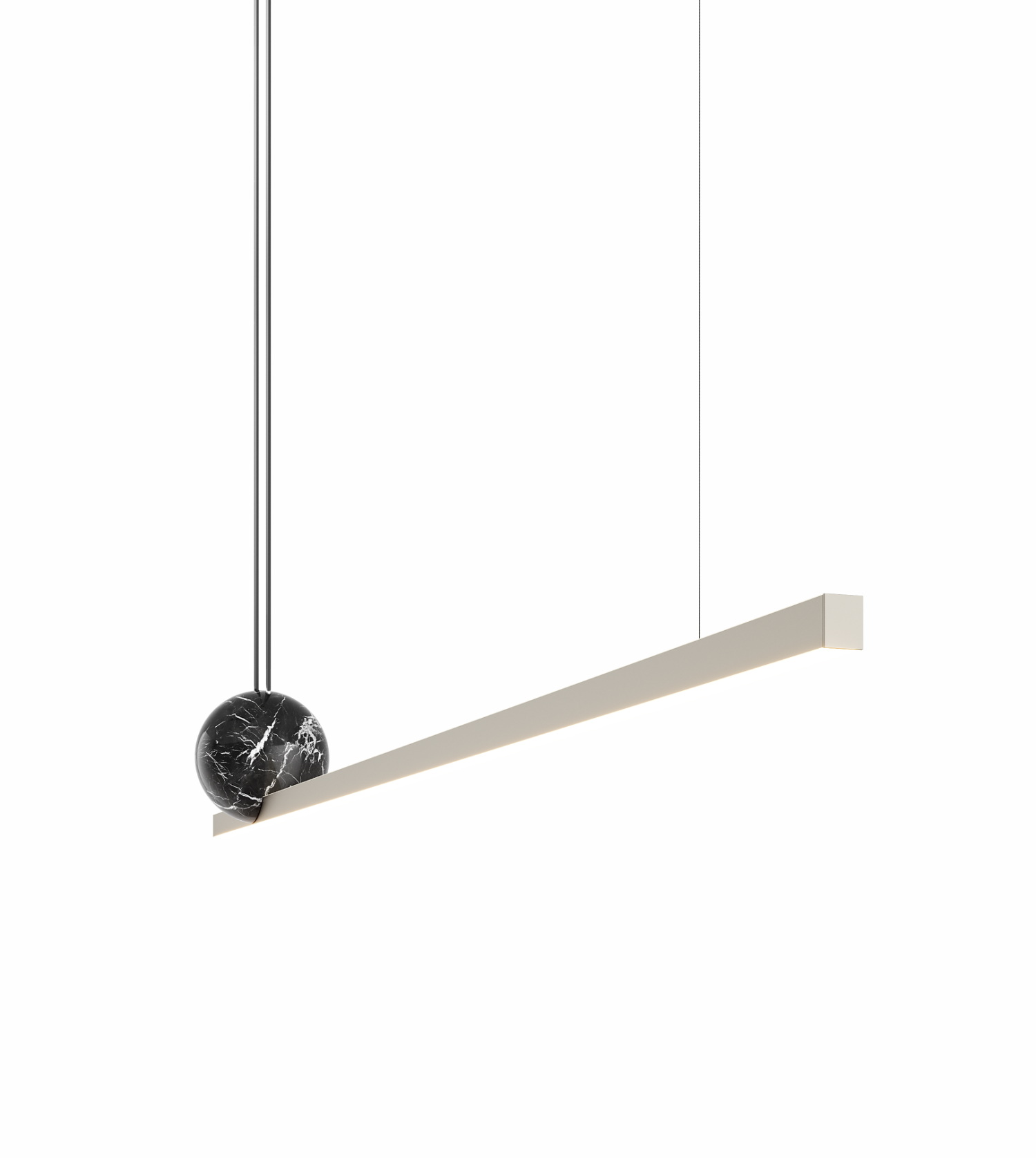 Основу модели составляет вытянутый светящийся корпус длиной 180 см — строгая горизонталь, создающая ритм в пространстве. Его визуально уравновешивает декоративная сфера, выступающая акцентом и придающая конструкции скульптурность. Такое сочетание линий и объемов делает светильник особенно выразительным в современных интерьерах, где важна не перегруженность, а смысл в каждом элементе.