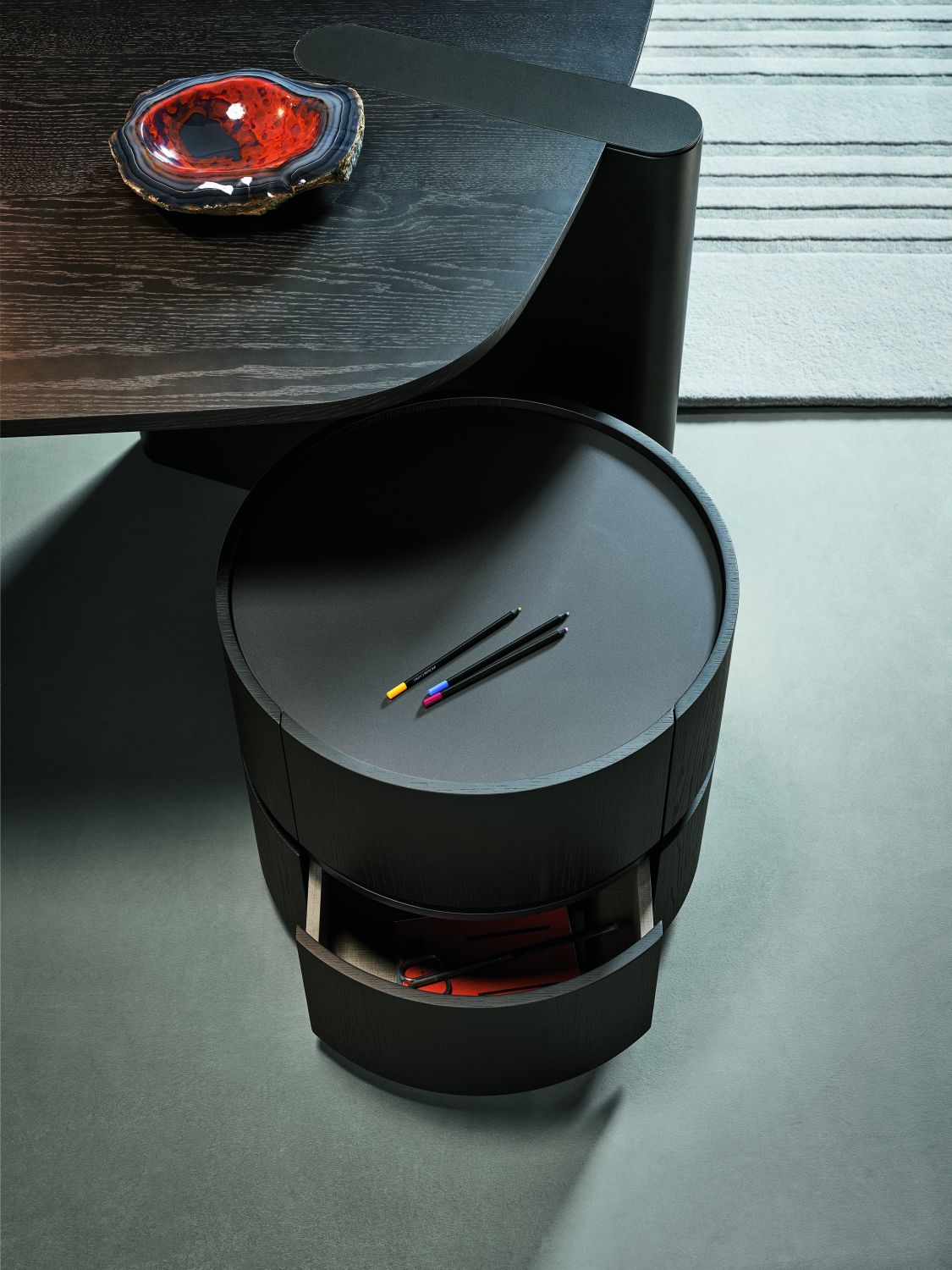Тумбы Moneypenny — это незаметные, но незаменимые помощники в любой офисной обстановке. Их элегантный, сдержанный дизайн вдохновлён образом преданной и эффективной мисс Манипенни из культовой саги о Джеймсе Бонде. Эти тумбы сочетают эстетическую простоту с высокой функциональностью: корпус в виде изогнутого деревянного цилиндра придаёт изделию визуальную легкость, а вместительные ящики с плавным ходом обеспечивают надёжное и конфиденциальное хранение документов и личных вещей. Moneypenny может использоваться как автономный предмет или как дополнение к рабочему столу, органично вписываясь как в деловой офис, так и в домашний кабинет, гостиную или спальню. Версия на колесиках добавляет мобильности и делает тумбу особенно практичной для гибкого пространства.