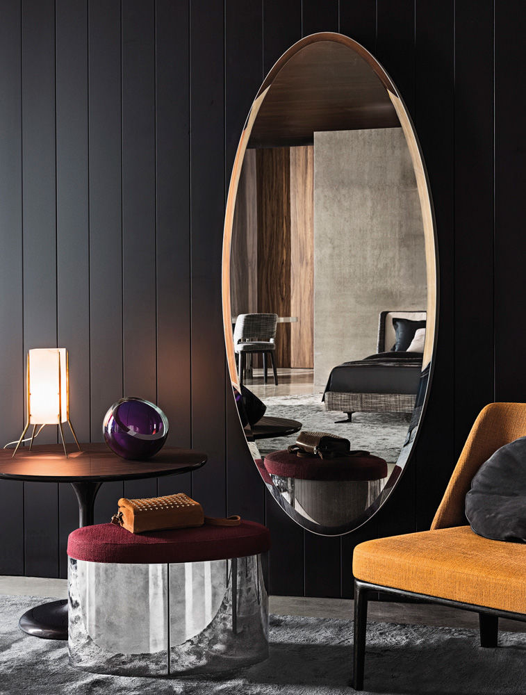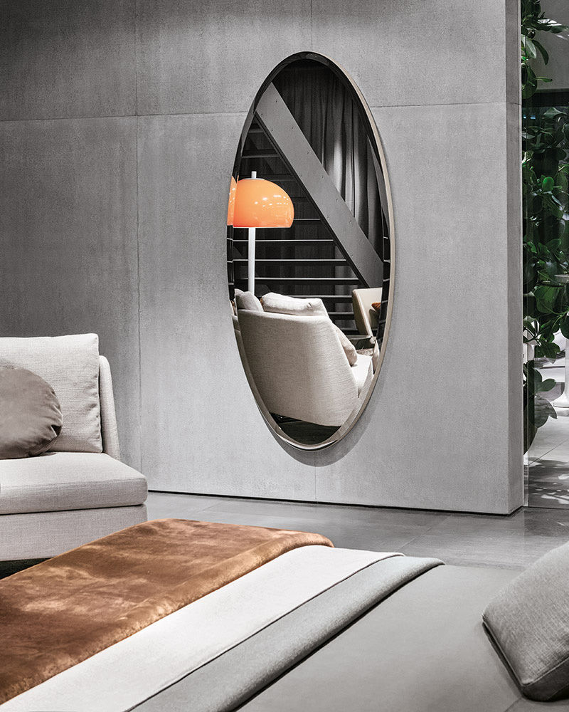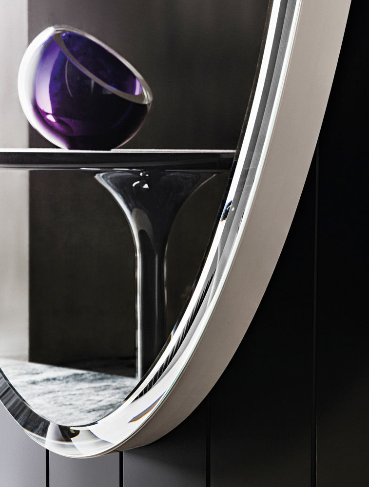 Murray — это прозрачное овальное зеркало с фасетной кромкой, установленное на лакированной панели цвета Sand или глянцевой панели из палисандра. Зеркало может быть повешено как горизонтально, так и вертикально, что делает его универсальным элементом декора для различных помещений.