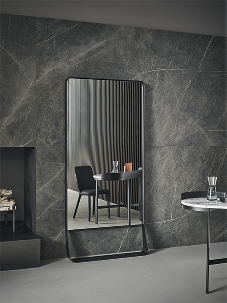 Зеркала коллекции Narciso отличаются прямоугольной формой с плавно закругленными углами и представлены в двух размерах. Особенностью дизайна является металлическая рама, которая в нижней части меняет сечение, расширяясь и превращаясь в опору, оставляя эффектное пустое пространство между зеркальной поверхностью и полом. Для оформления рамы доступны варианты отделки: Metallo в антрацитовом или черном цвете, а также Metallo Plus в оттенках бронзы, перламутрового золота, платины и свинца.