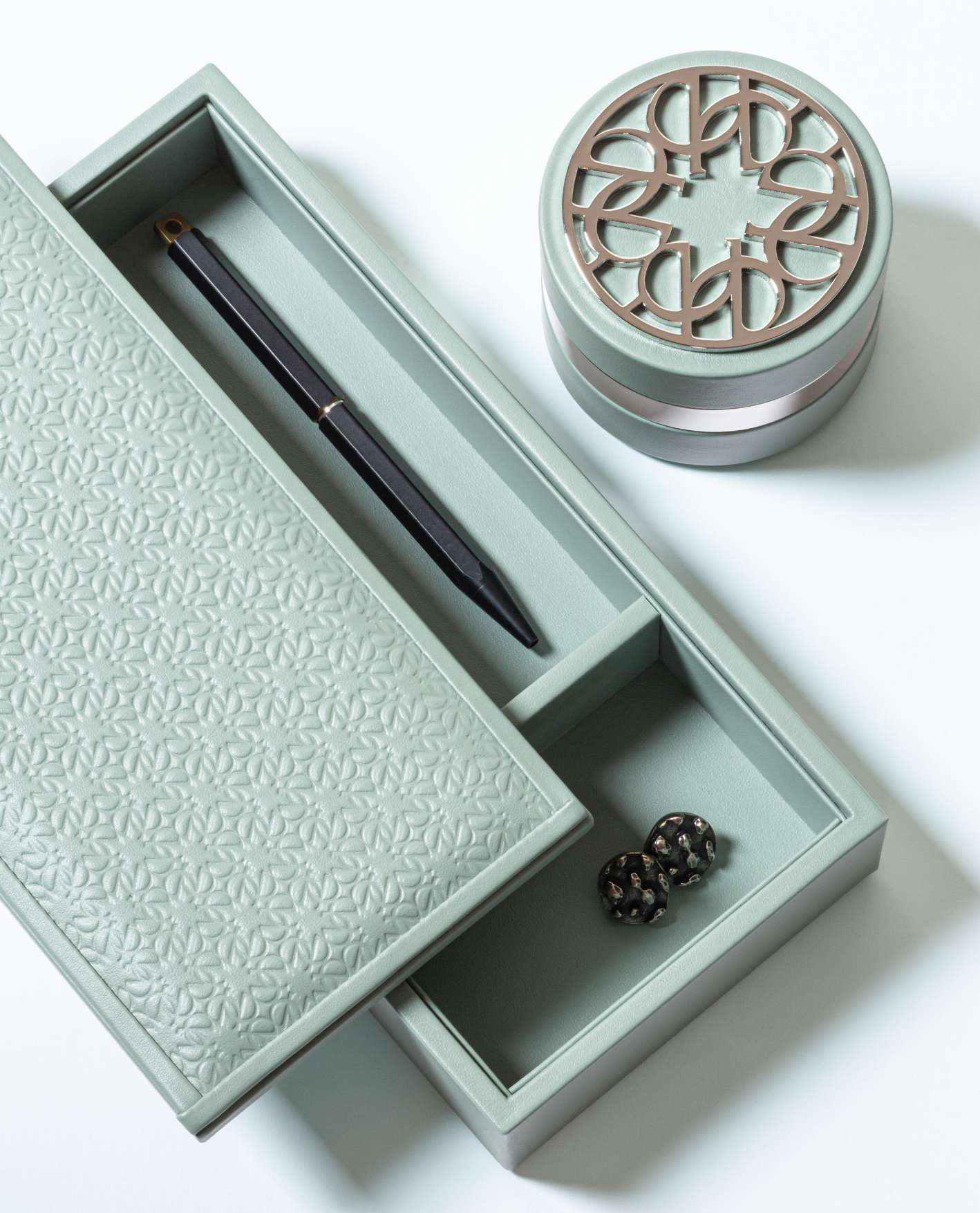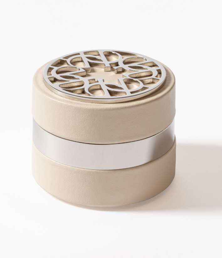 Коллекция настольных аксессуаров Monogram создана в сотрудничестве с модным домом Elie Saab. Предметы выполнены с мягкими кожаными вставками с фирменным узором ELIE SAAB Monogram. В отделке использованы детали с полировкой под палладий, которые придают комплекту благородный блеск и подчёркивают графичность форм. Все элементы рассчитаны на оформление рабочего пространства в кабинете или домашнем офисе.