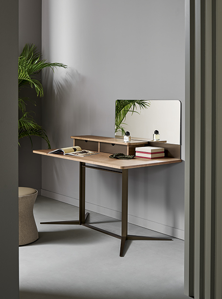 Минималистичный стол из коллекции Nelson от Маттео Нунциати доступен в вариантах туалетного столика и письменного стола. Вдохновлённый эстетикой модернизма, он сочетает столешницу из ореха Noce Canaletto с лаконичным металлическим основанием. В версии туалетного столика предусмотрены зеркало и ящики, а как письменный стол Nelson гармонично вписывается в домашний интерьер.