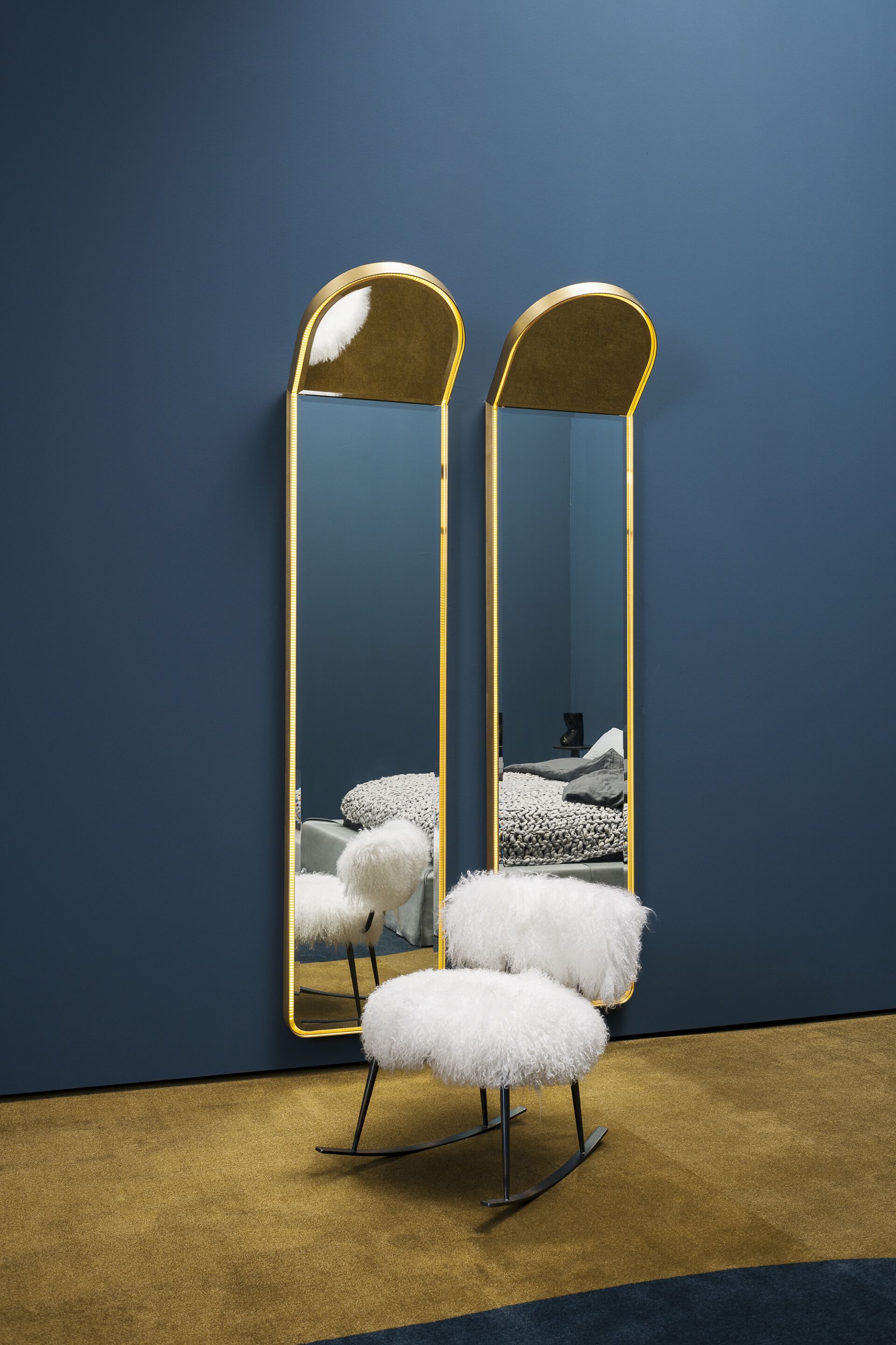 Варианты обивки: кожа Mongolia в белом, синем и верблюжьем цветах.