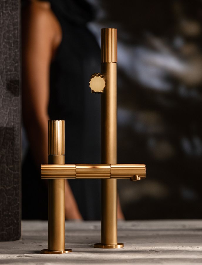 Gessi использует этот тренд не как декоративный приём, а как инструмент интеграции: сантехника выстраивает диалог с мебелью, камнем, столярными изделиями и светом, снижая визуальные конфликты и позволяя проектировать интерьер как единую материальную среду.