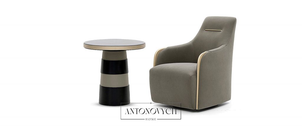 Кресло TL-2480, см 69x85x91h, столик TL-2185, см диам. 61x61hОбстановку спальни Cassandra дополняют кресло TL-2480 и стол TL-2185. Обе модели характеризуются элегантной игрой контраста между кожаным цв. Muschio и детали Pale Gold, подчеркнутые мягкими формами кресла TL-2480, которые контрастируют с геометрическим вырезом элементов стола TL-2185 и столешницей из керамогранита Sahara Noir.
