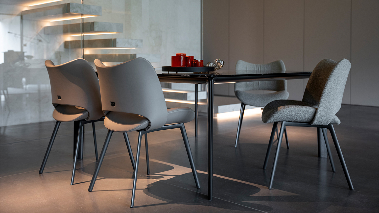 Модель Nice – коллекция стульев/полукресел для бренда: соединение алюминия, кожи Pelle Frau®, тонкой формы.