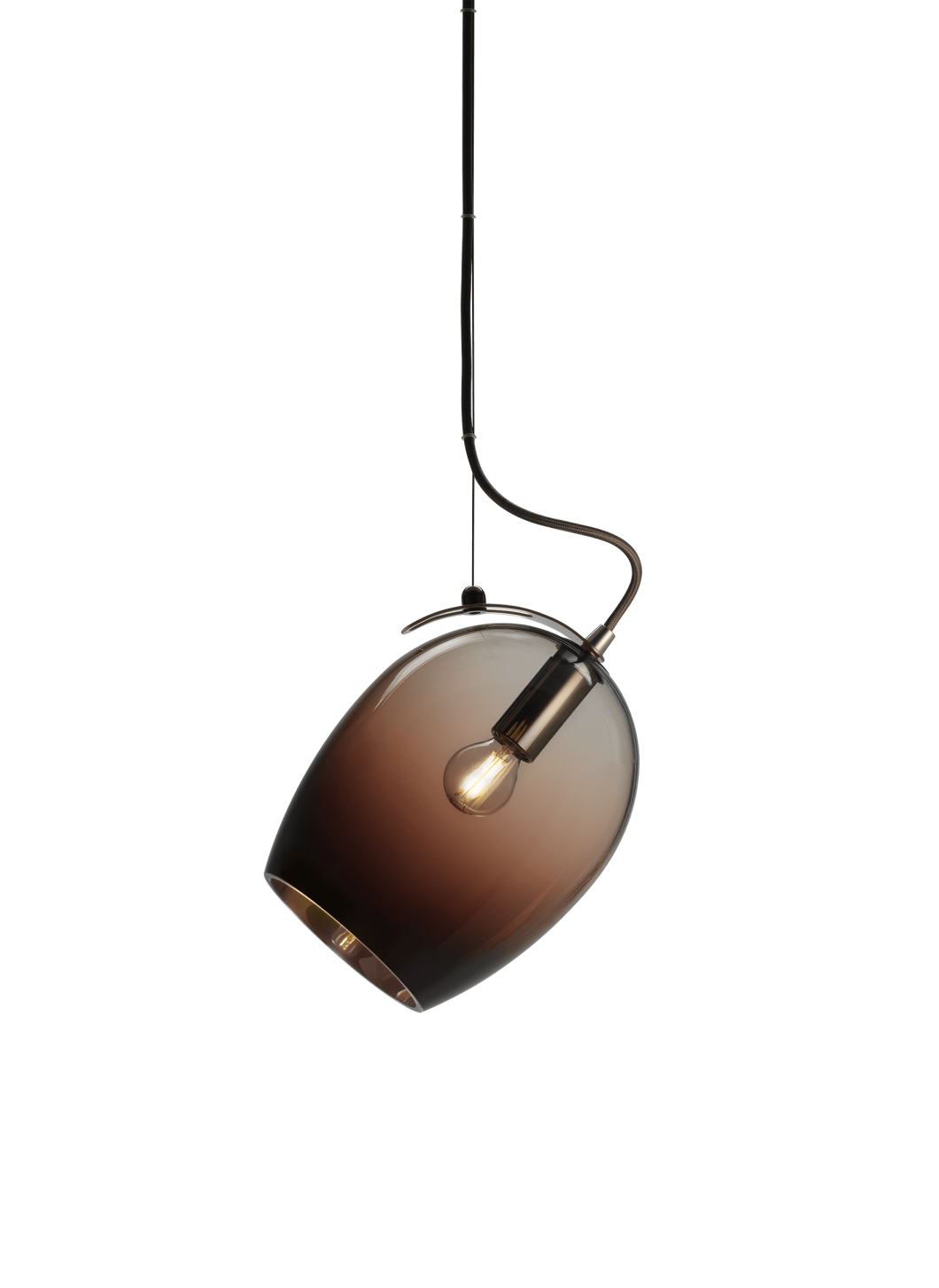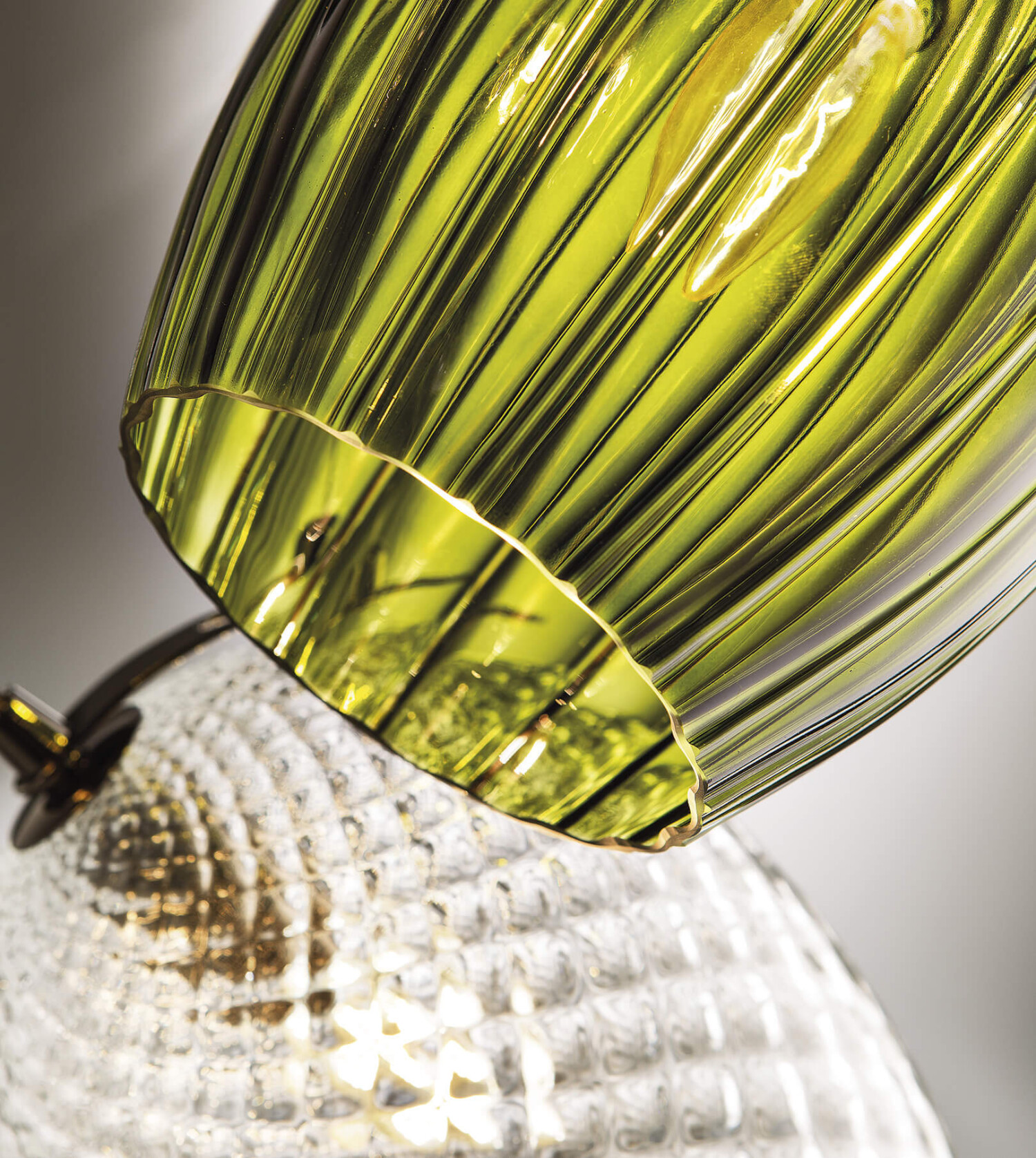 Подвесной светильник с рассеивателем из дутого стекла, доступен в пяти вариантах отделки и цвета стекла: прозрачное, дымчатое, сизое, затемненное черное и оливково-зеленое, металл с хромированной или стально-серой отделкой.