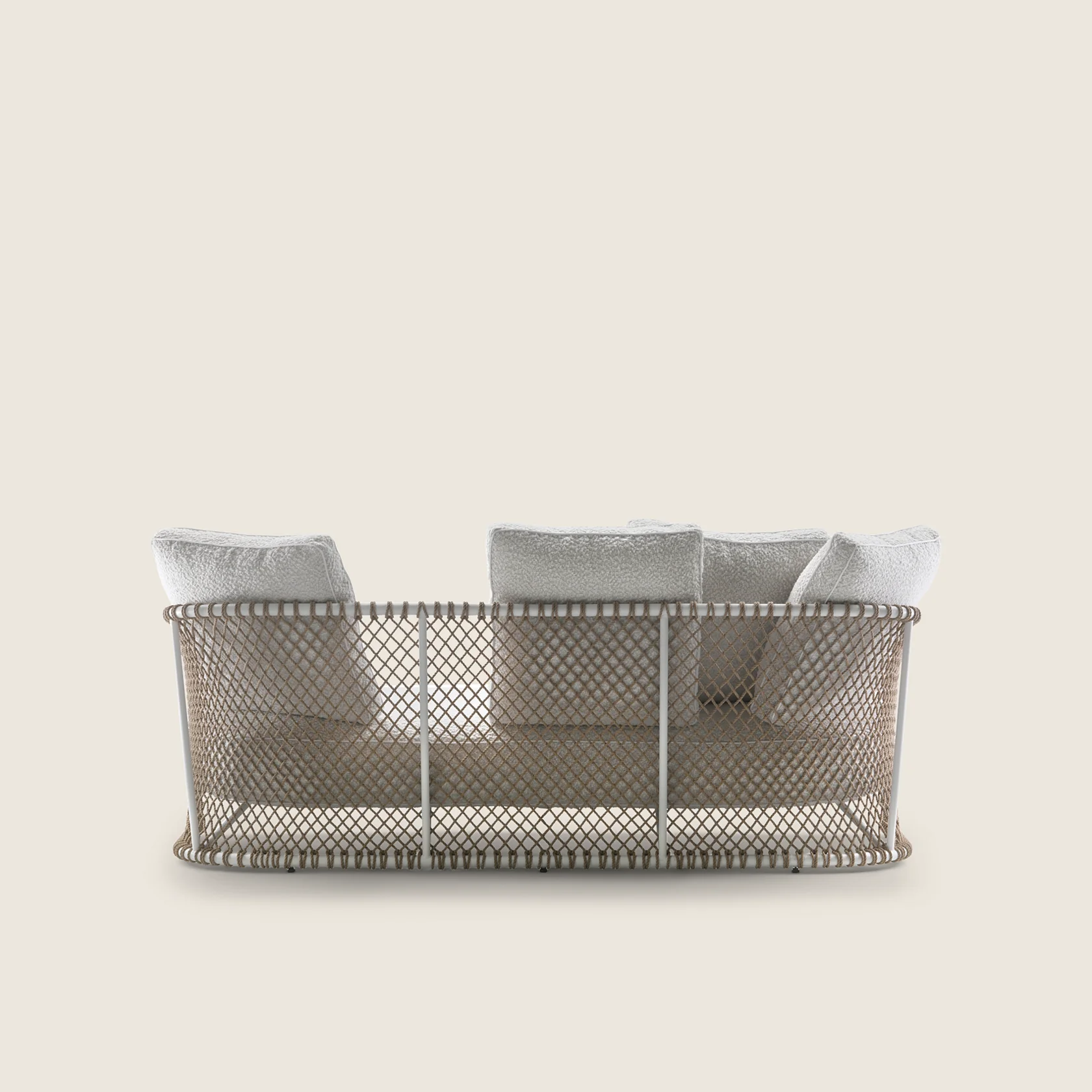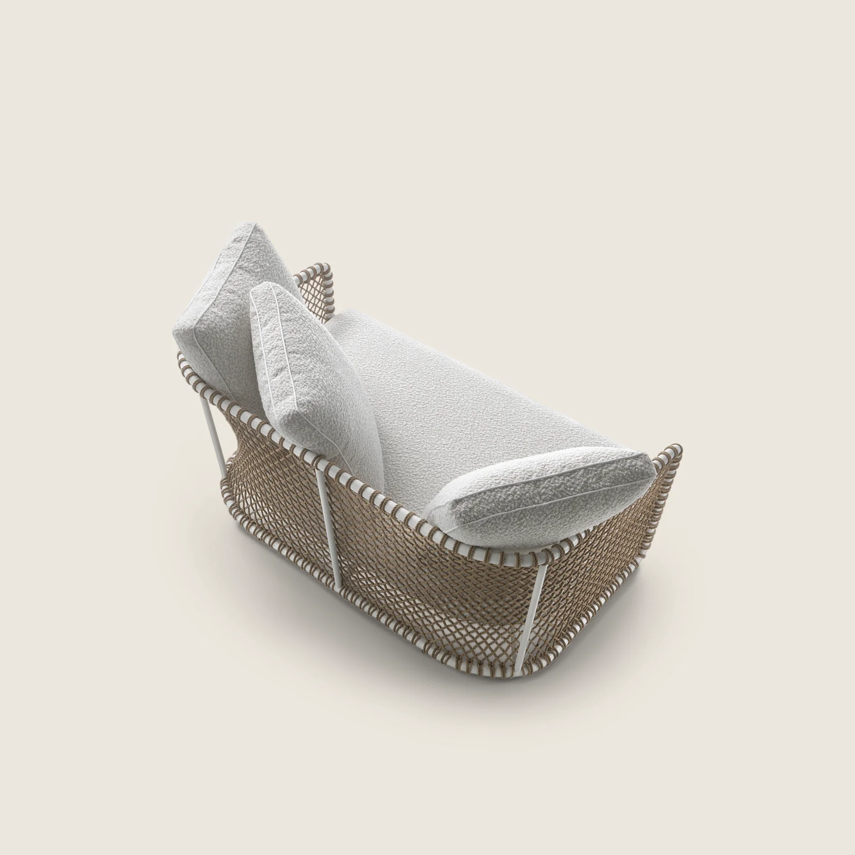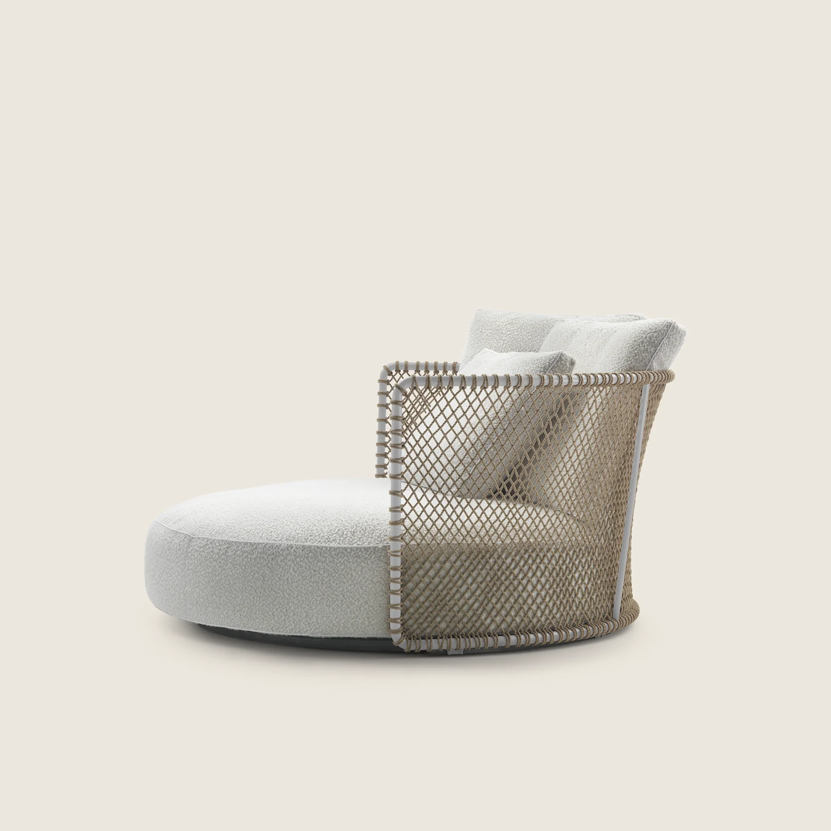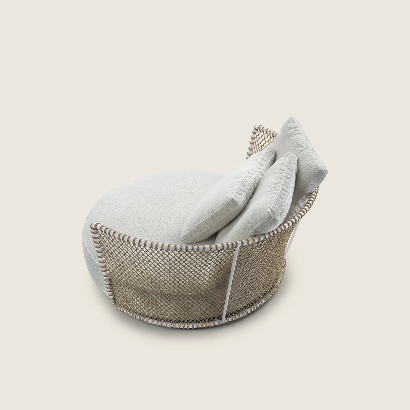 Диваны Oasis — центральные элементы одноимённой уличной коллекции, в которых сочетаются современная геометрия, лёгкость визуального восприятия и высокий уровень комфорта. Модель доступна в двух версиях: с линейной композицией и эффектным полукруглым модулем. Обе модификации оформлены вручную плетёным шнуром, который придаёт конструкции ощущение воздушности, а мягкие подушки создают уютную зону отдыха на террасе, в саду или у бассейна.