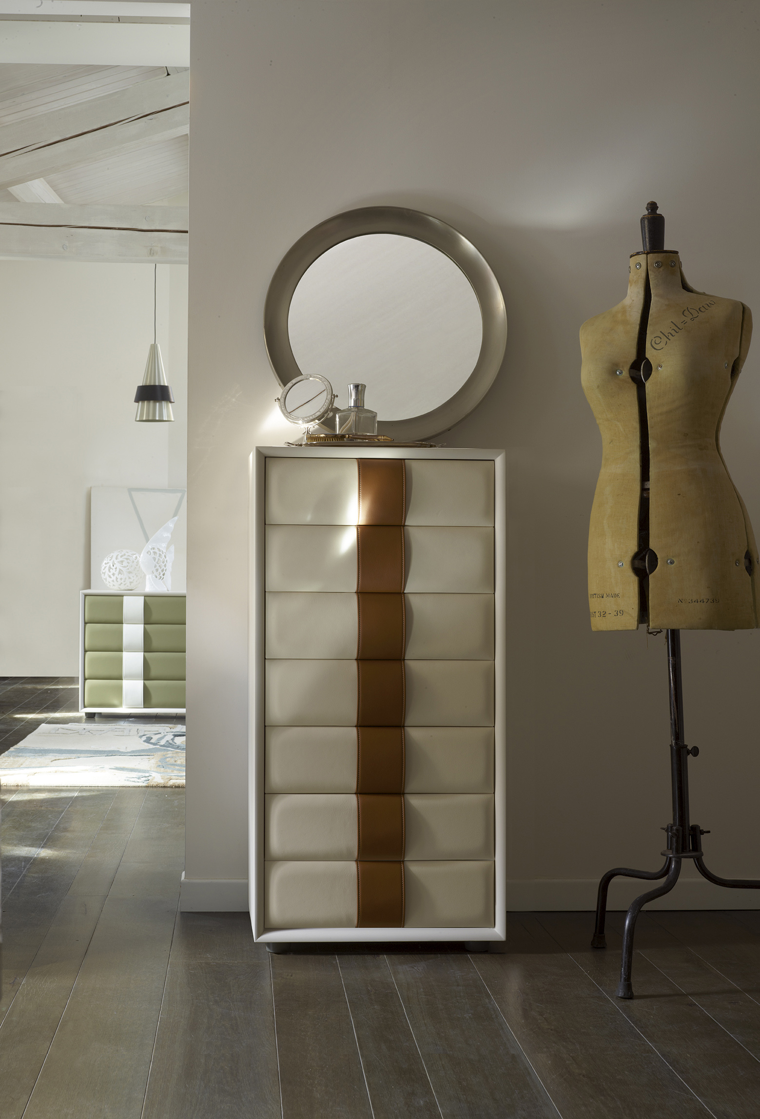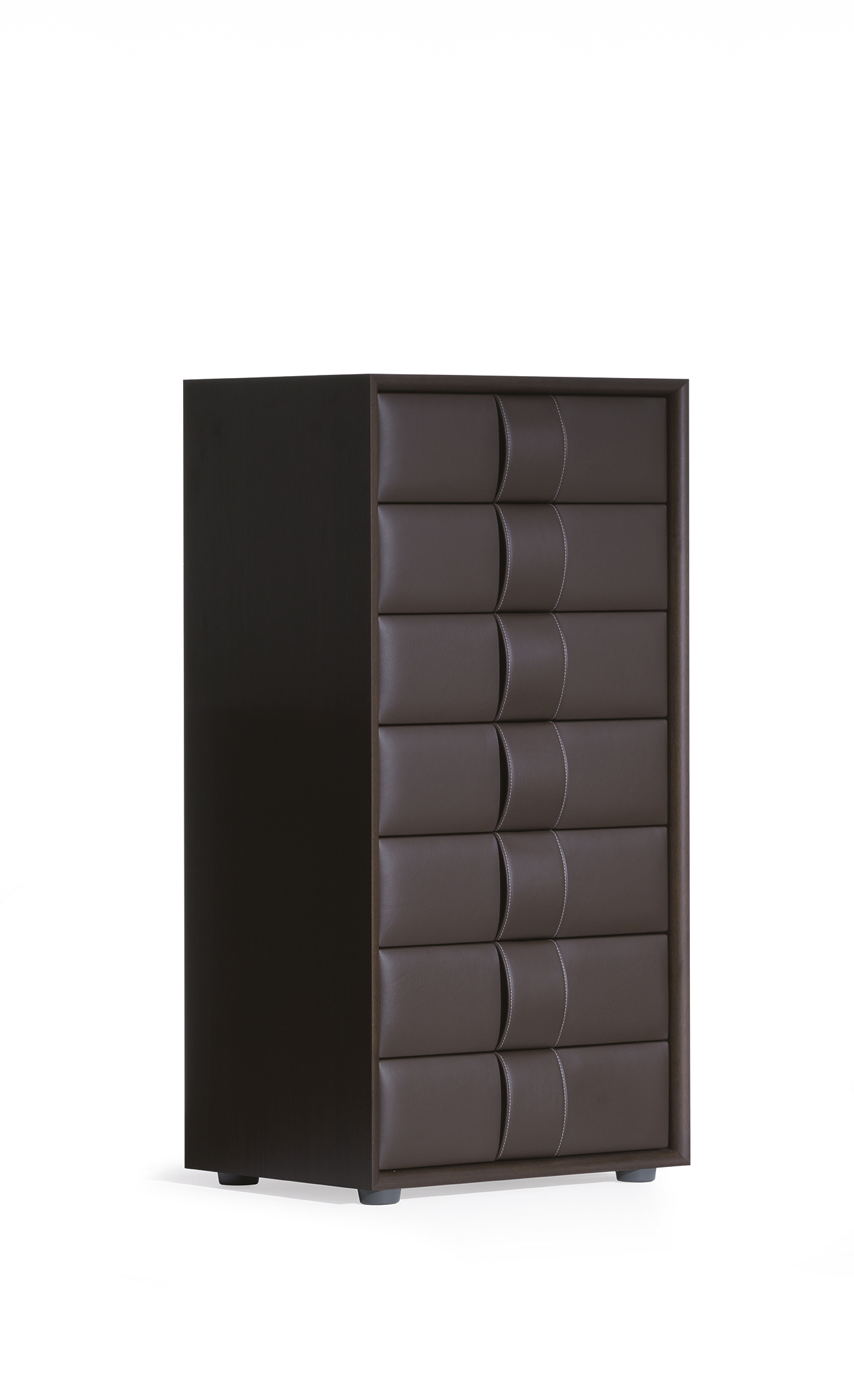 Система модулей хранения Obi доступна в лакированном молочном цвете с защитой от царапин покрытии или в деревянном корпусе со шпоном из срезанного ореха Бруно. Комод, прикроватные тумбочки и комод Obi оснащены ящиками на металлических направляющих с механизмом плавного закрывания. Передняя часть ящиков и ручки полностью обтянуты кожей Pelle Frau® того же или другого цвета с вертикальной строчкой в тон или контрастного цвета, создающей изысканный декоративный эффект.