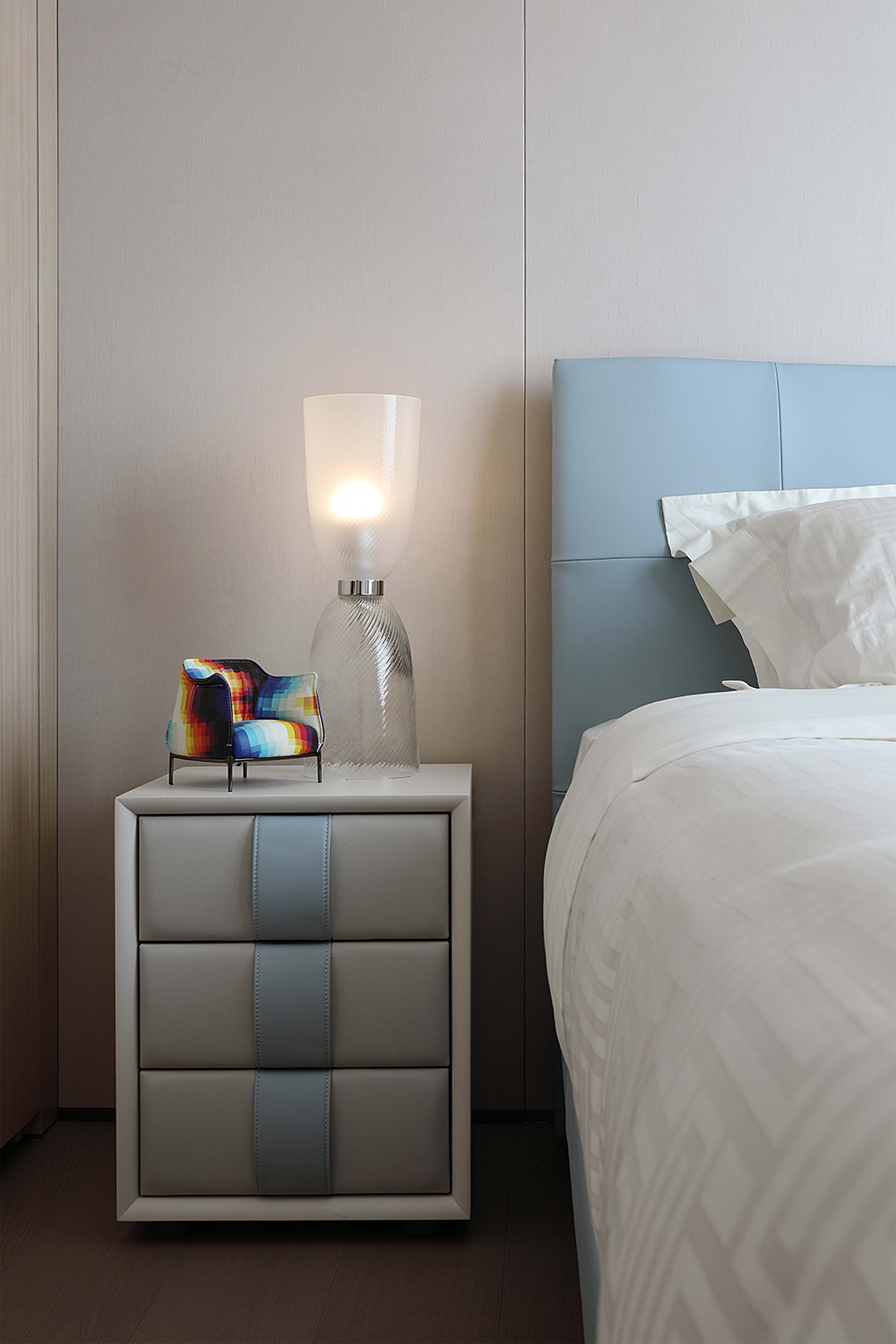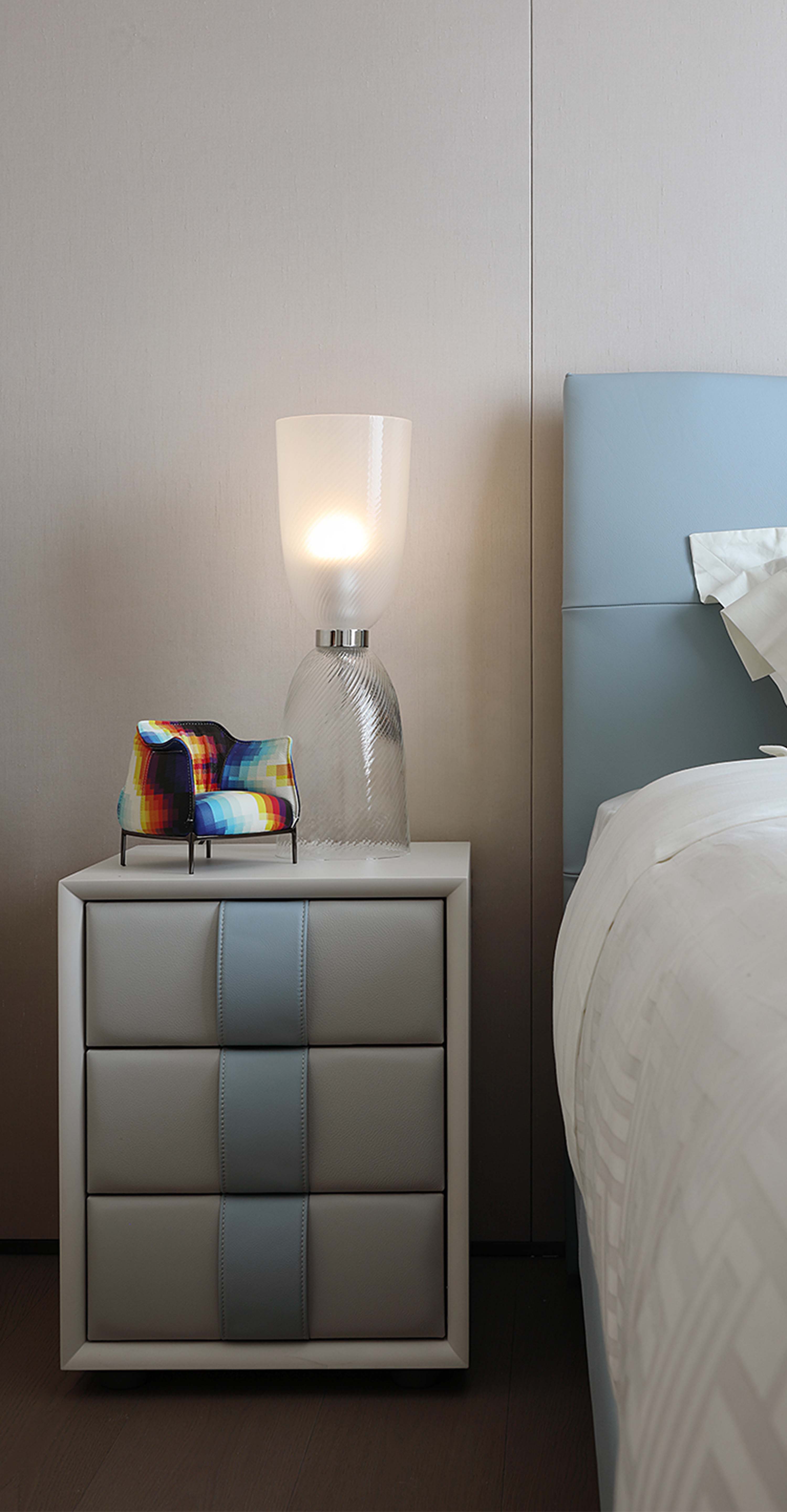 Система модулей хранения Obi доступна в лакированном молочном цвете с защитой от царапин покрытии или в деревянном корпусе со шпоном из срезанного ореха Бруно. Комоды, прикроватные тумбочки и комод Obi оснащены ящиками на металлических направляющих с механизмом плавного закрывания. Лицевая часть ящиков и ручки полностью обтянуты кожей Pelle Frau® того же или другого цвета с вертикальной строчкой в тон или контрастного цвета, создающей изысканный декоративный эффект. По запросу столешница каждого модуля хранения Obi может быть дополнена элегантной накладкой из кожи Pelle Frau®.