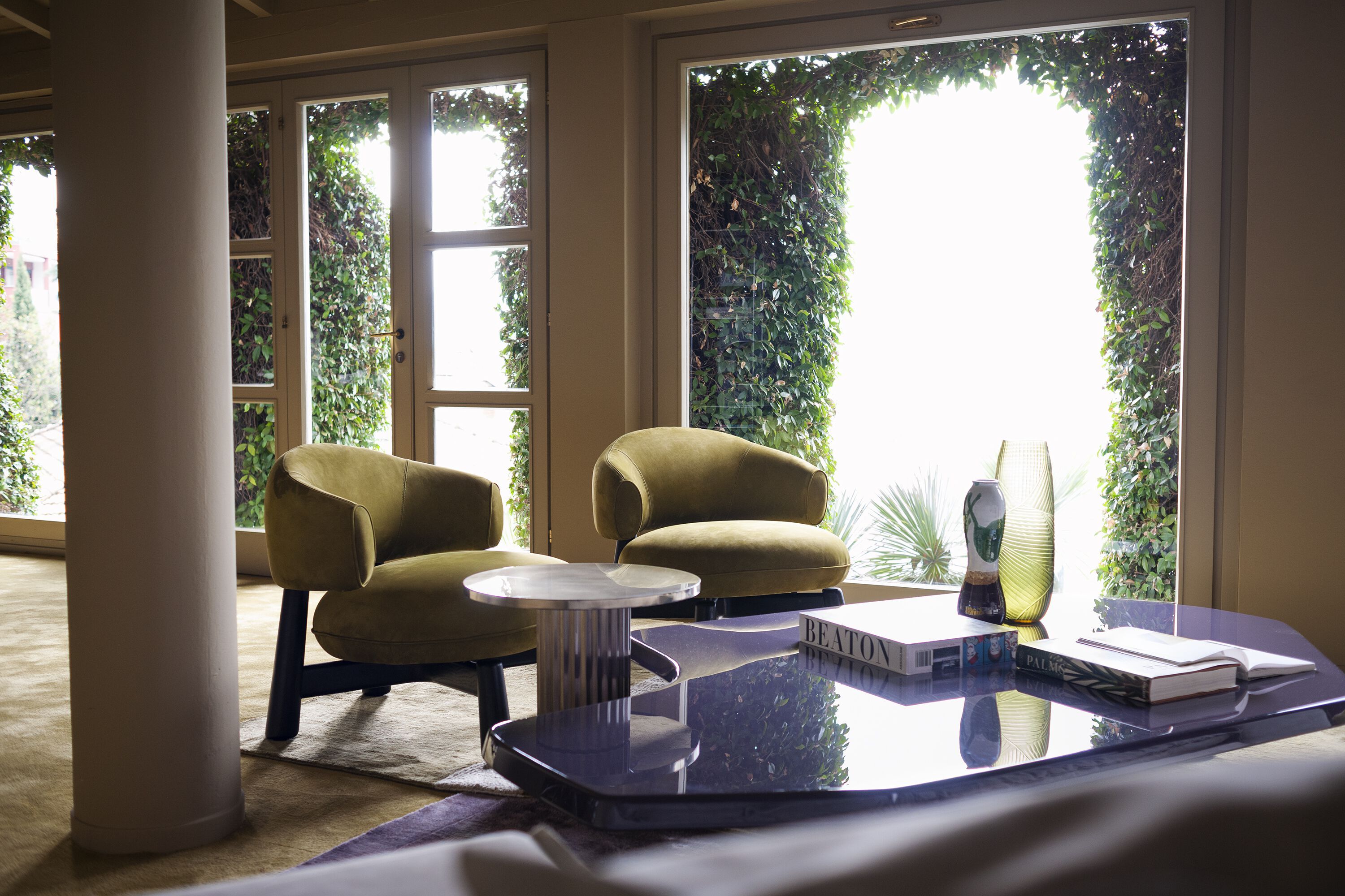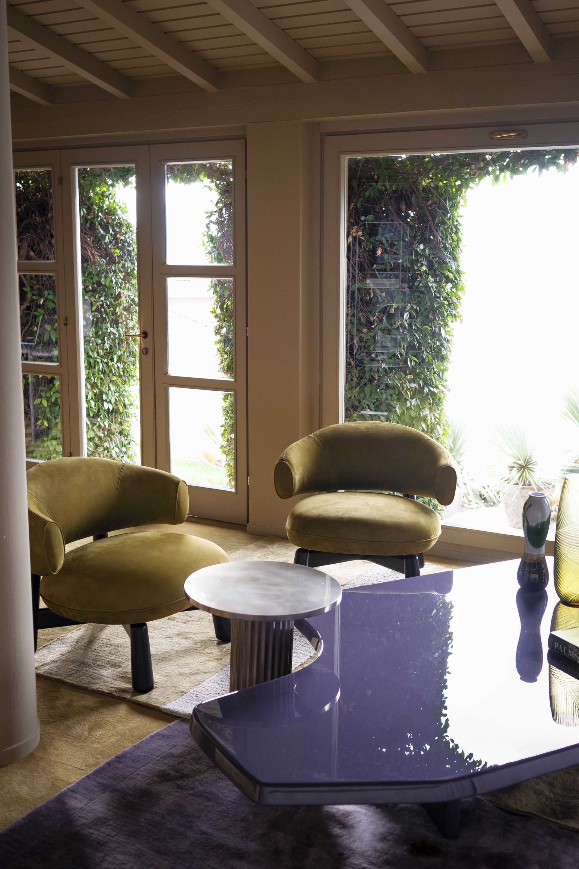 Кресло Olaf полностью воплощает этнический дизайн Роберто Лаццерони. Это низкое кресло с ироничными линиями и скульптурными формами, вдохновленными африканским искусством. Сиденье и спинка, которые расширяются в подлокотник, обиты кожей и поддерживаются массивными ногами, напоминающими ноги слона, что делает кресло идеальным для расслабляющего отдыха.