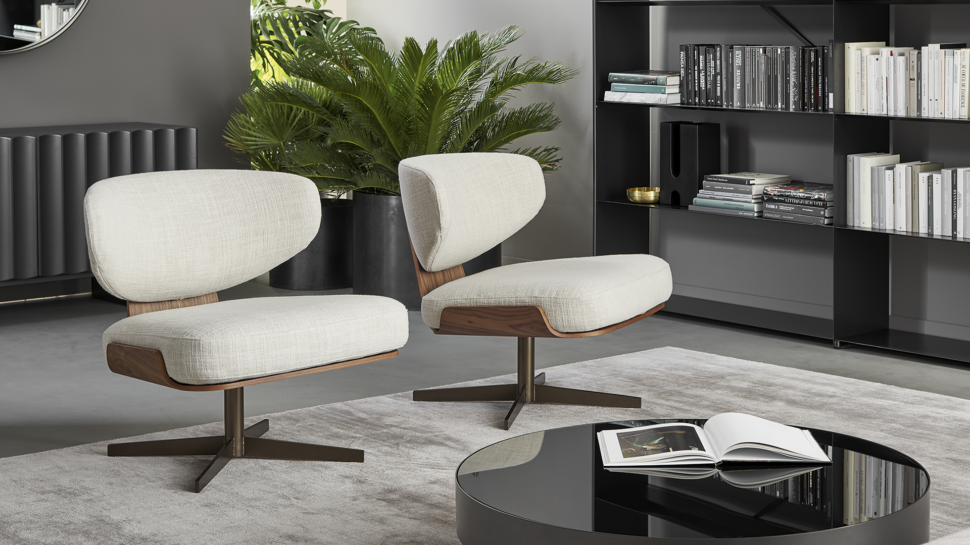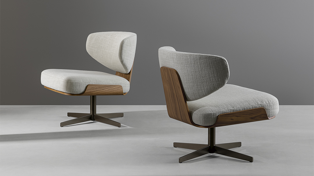 Корпус из гнутой ламельной древесины словно обнимает сидящего, создавая ощущение защищённости и уюта, а центральная металлическая поворотная опора придает модели современную динамичность. Это кресло — не просто предмет интерьера, а настоящая аллюзия на живое общение между человеком и пространством.
